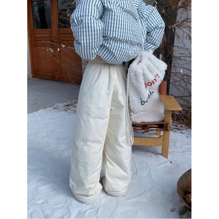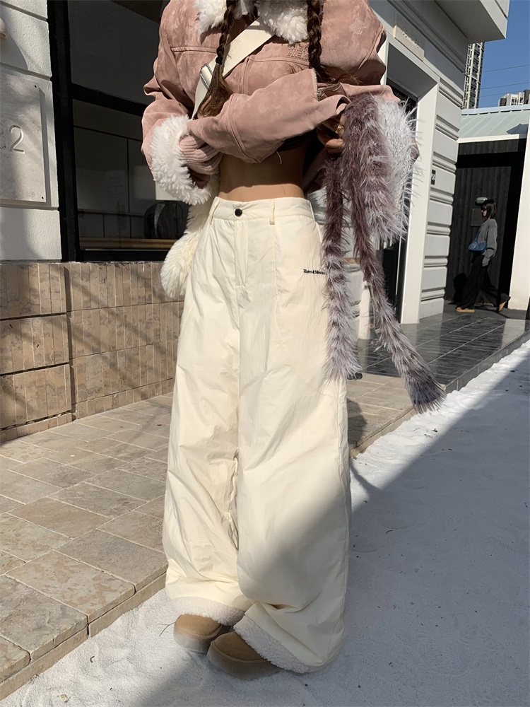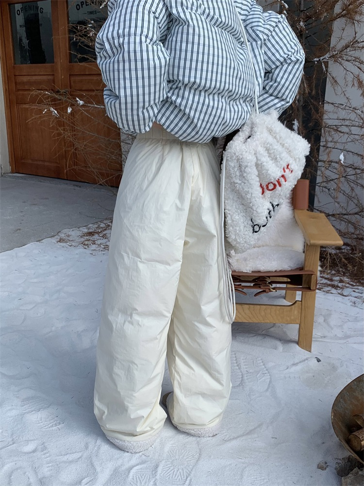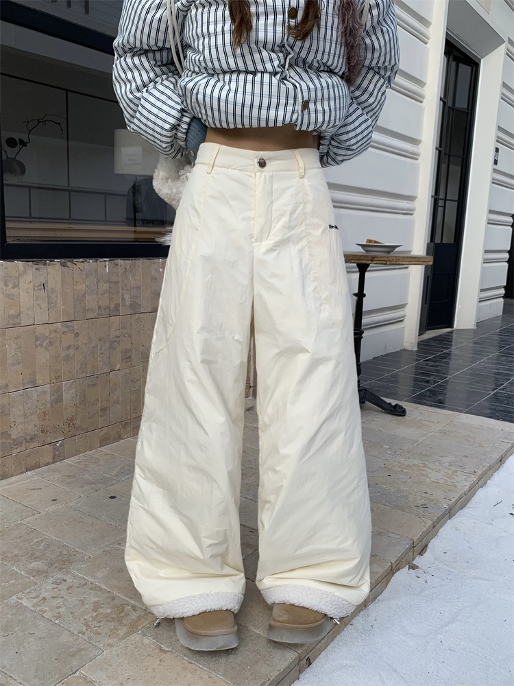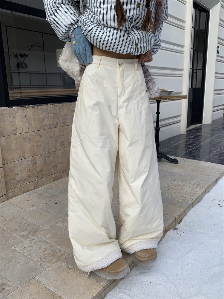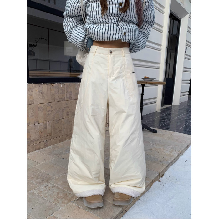 呆呆文冬季新款羊羔毛拼接羽絨褲男女寬松休閒防寒濶腿保暖長褲潮