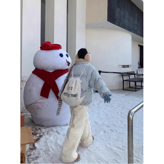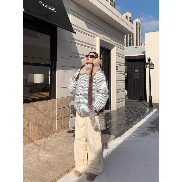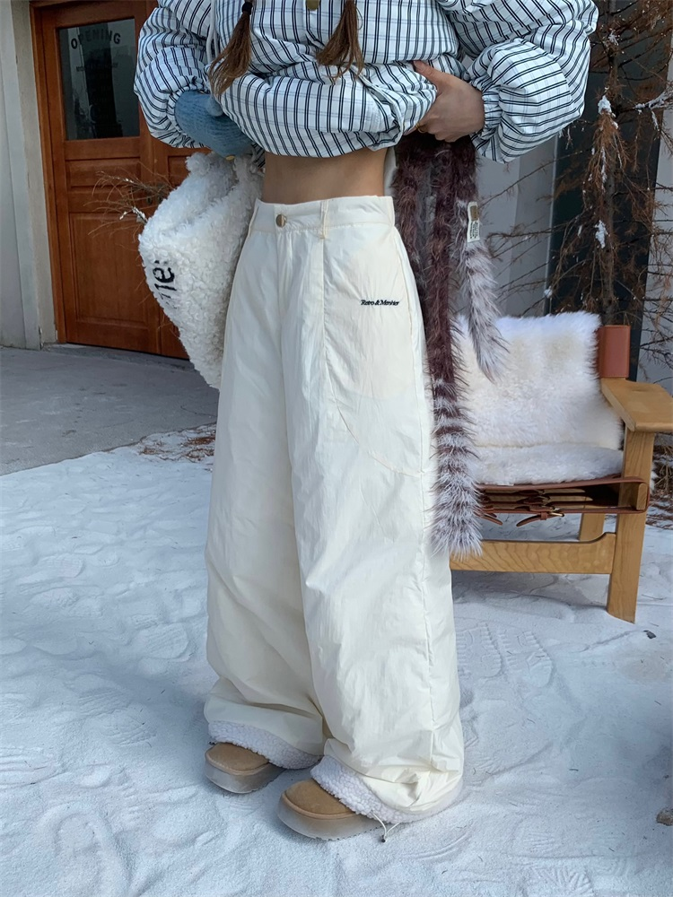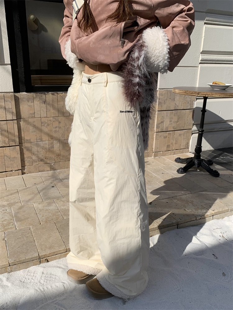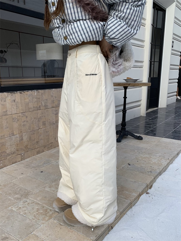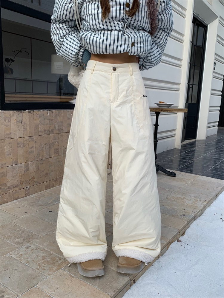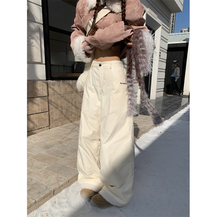 呆呆文冬季新款羊羔毛拼接羽絨褲男女寬松休閒防寒濶腿保暖長褲潮