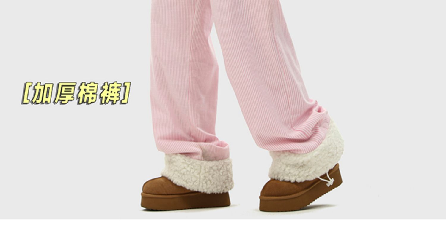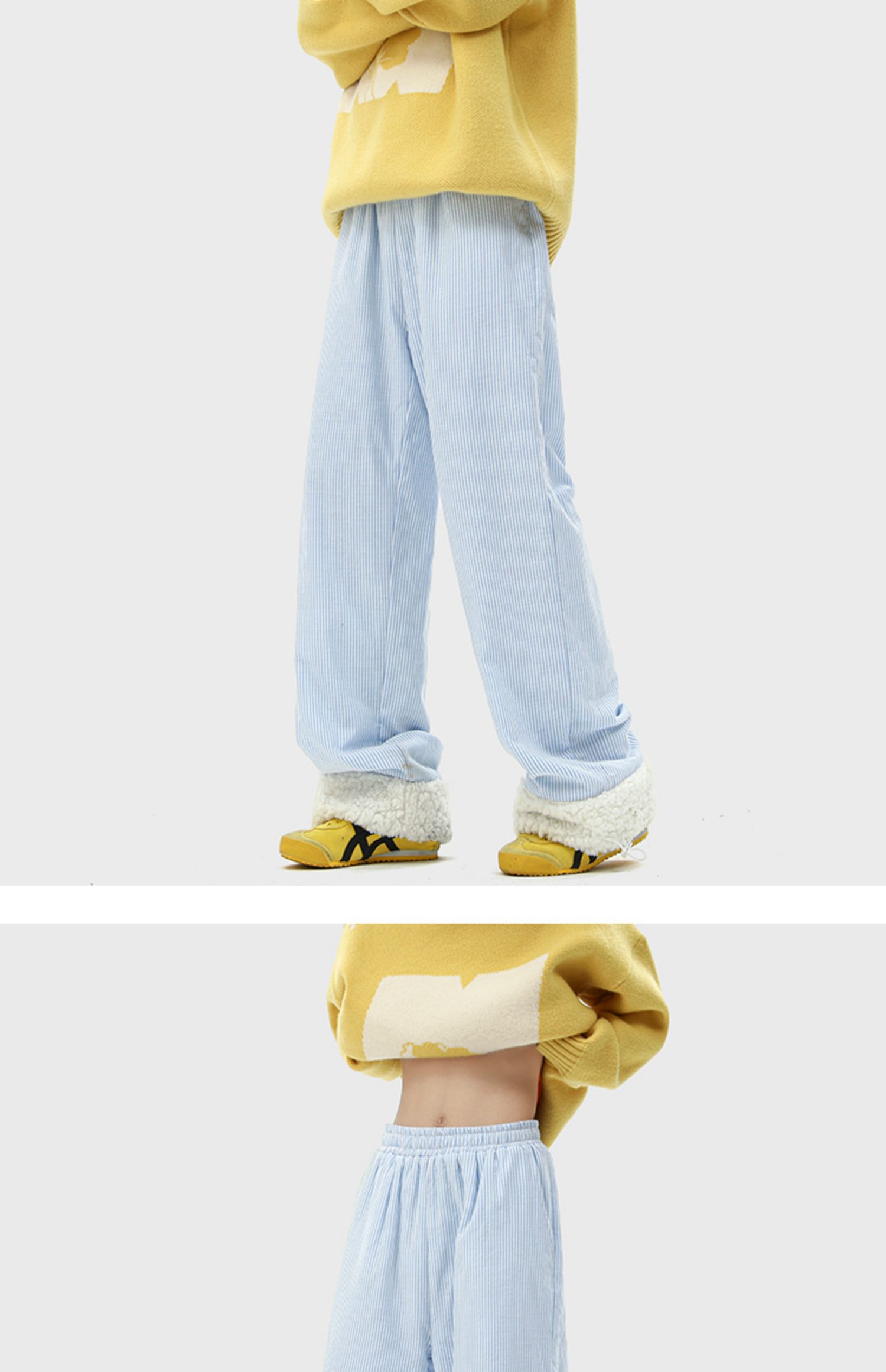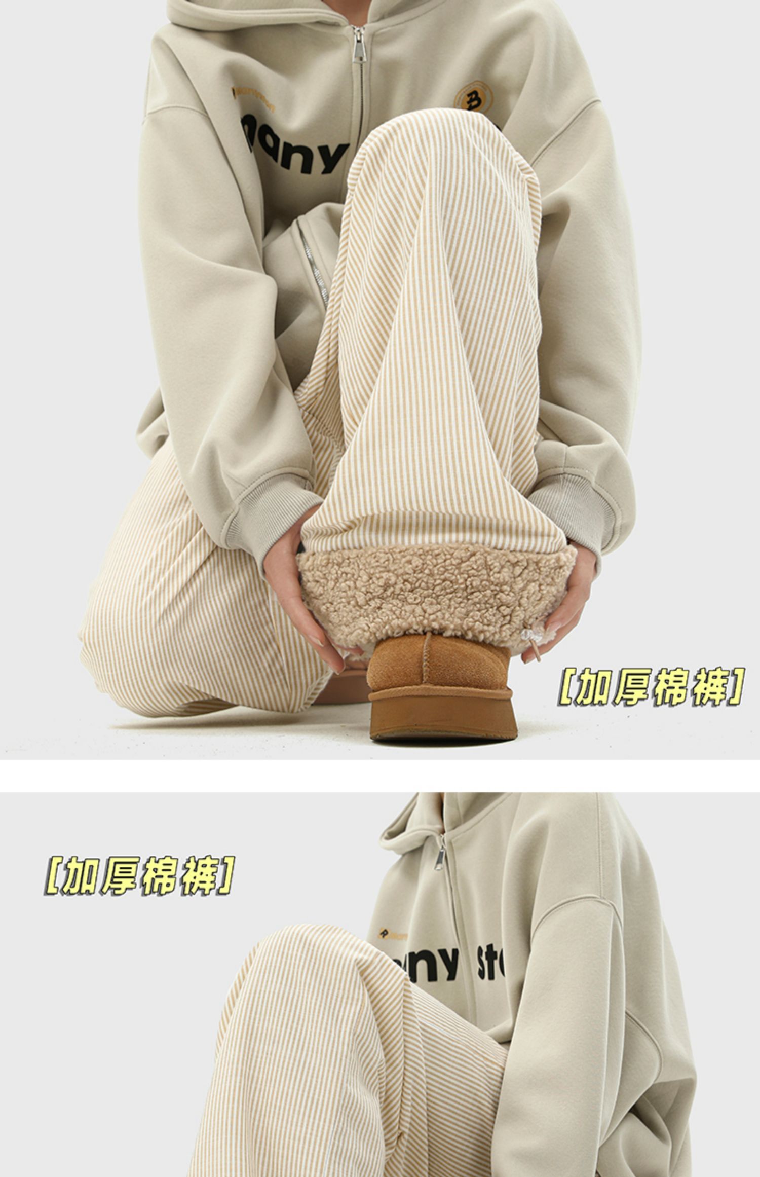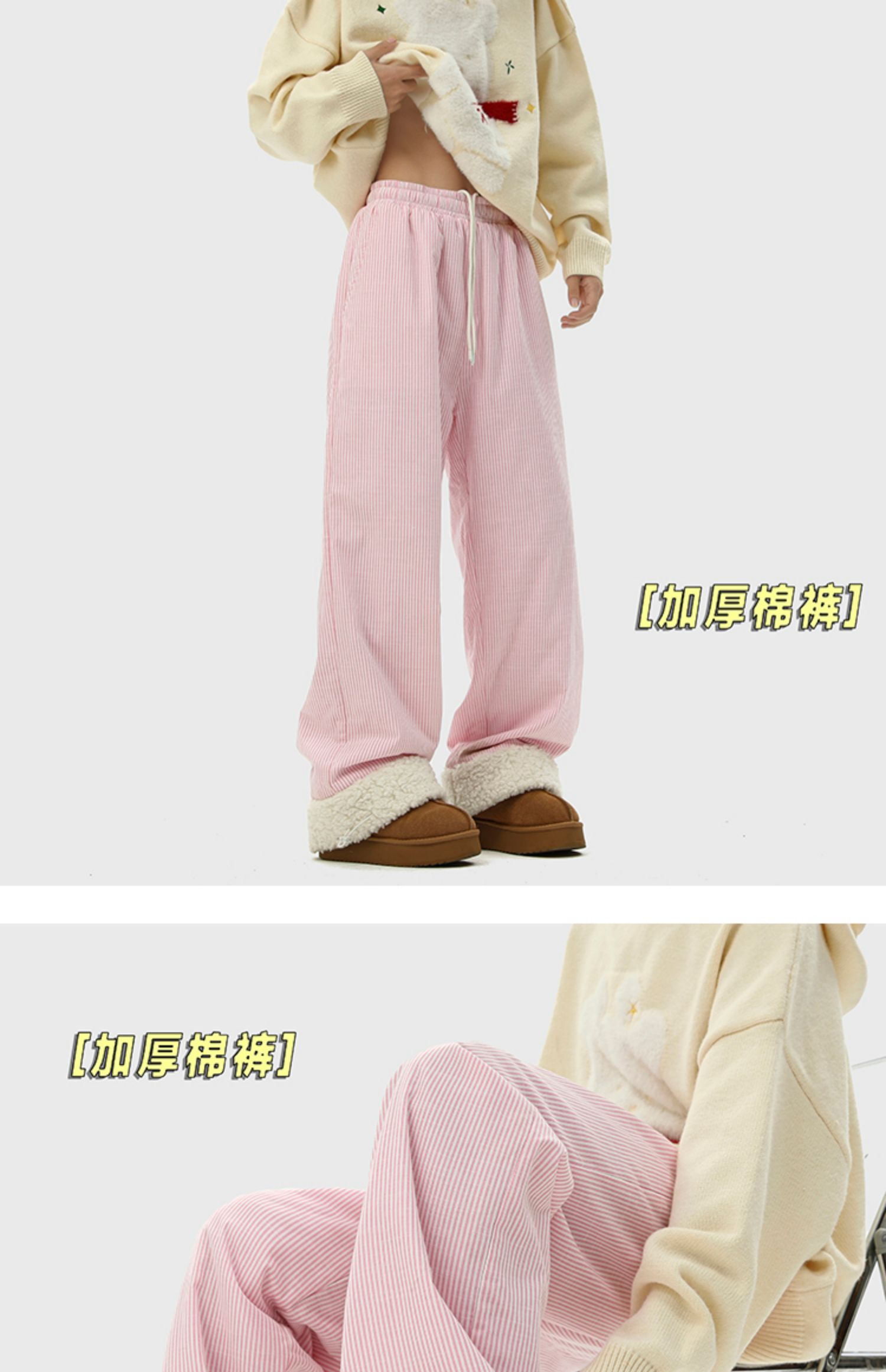 BWKA多巴胺條紋保暖棉褲女男冬季加絨加厚防寒濶腿褲慵懶風休閒褲