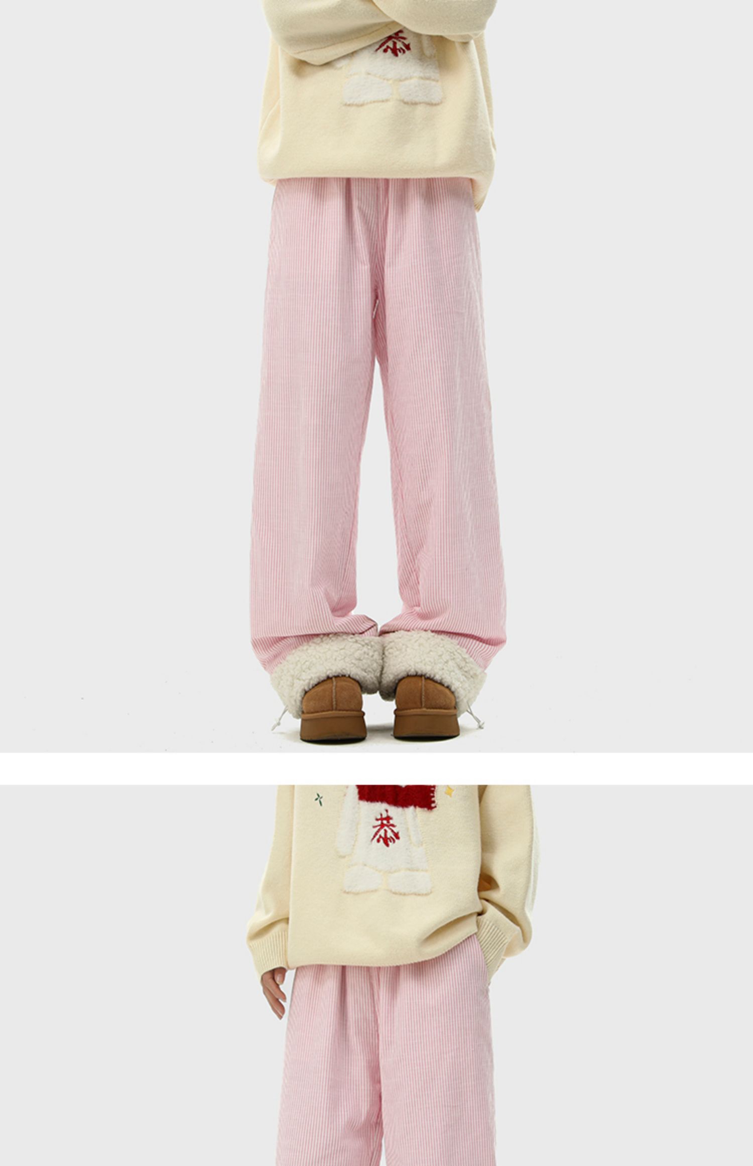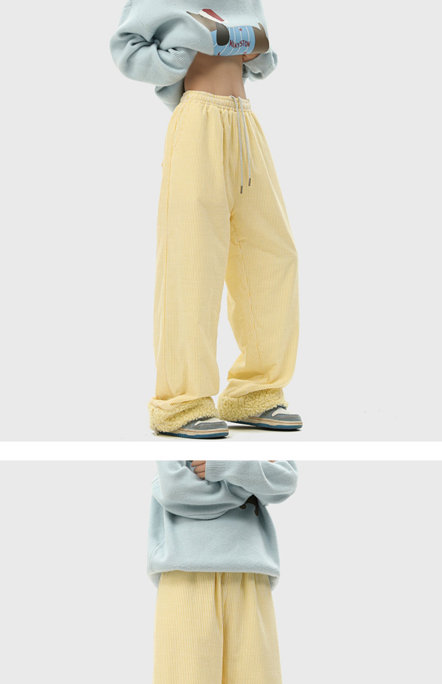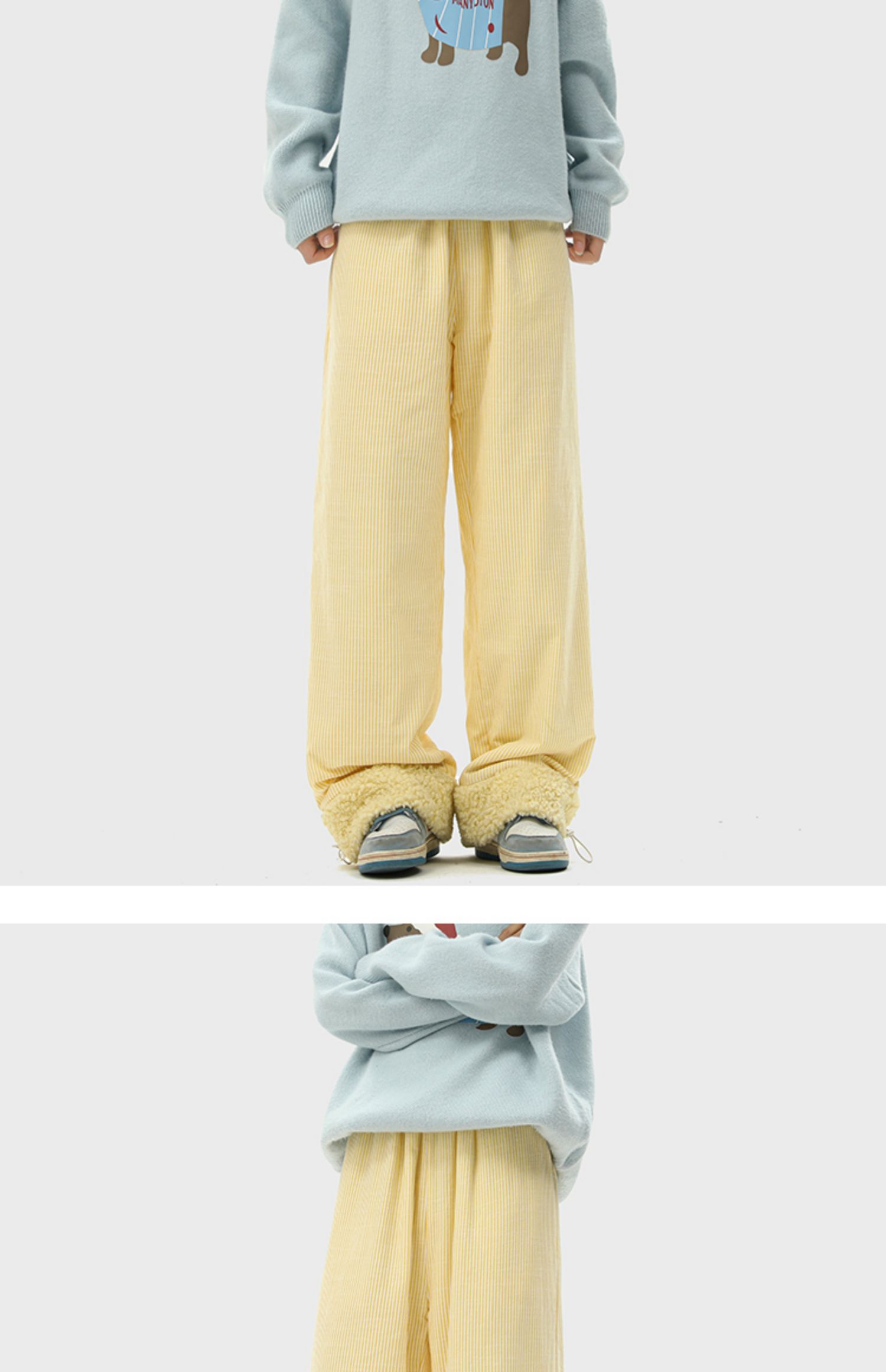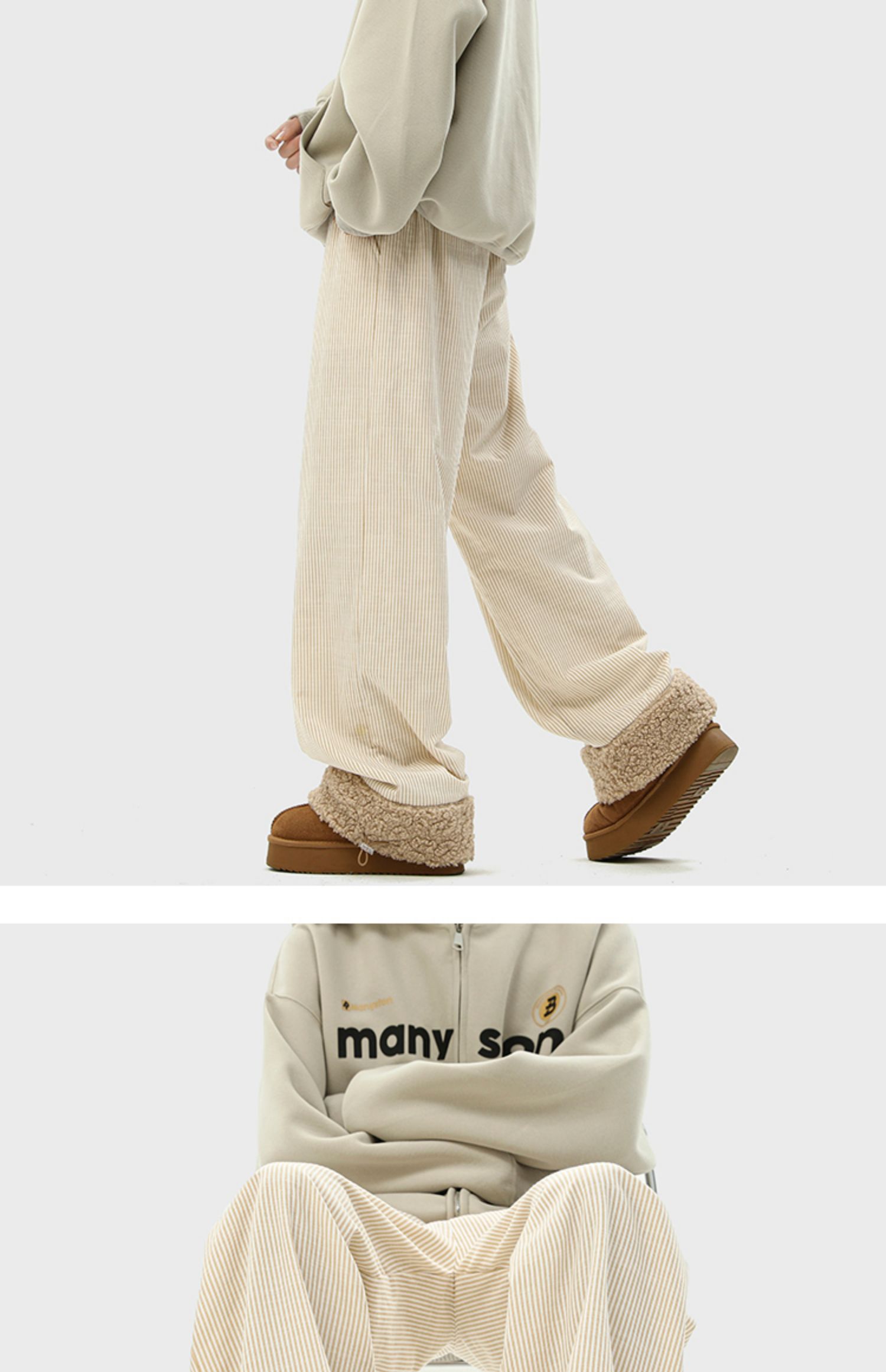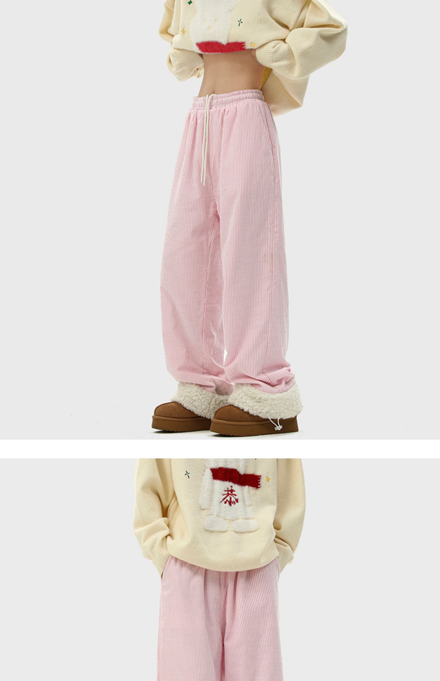 BWKA多巴胺條紋保暖棉褲女男冬季加絨加厚防寒濶腿褲慵懶風休閒褲