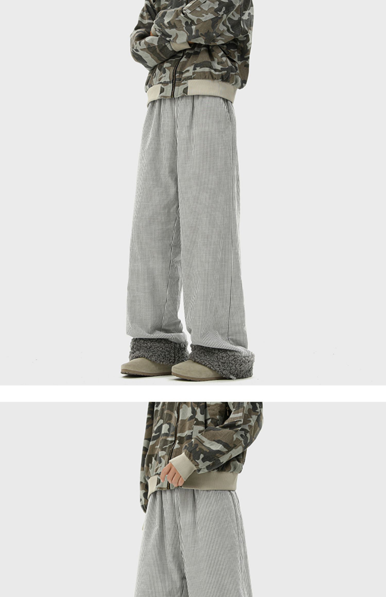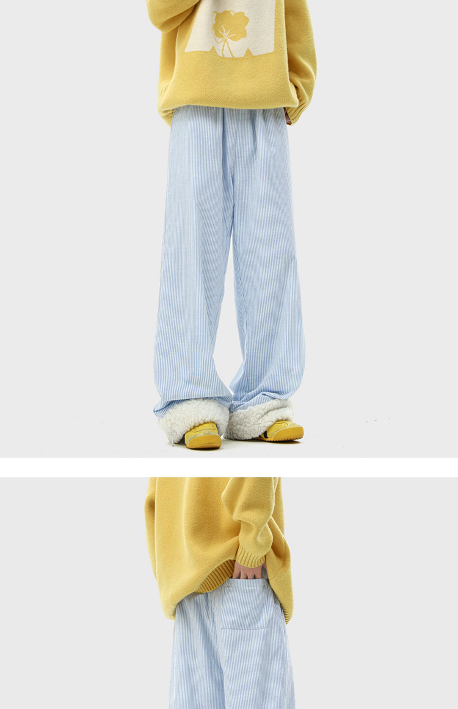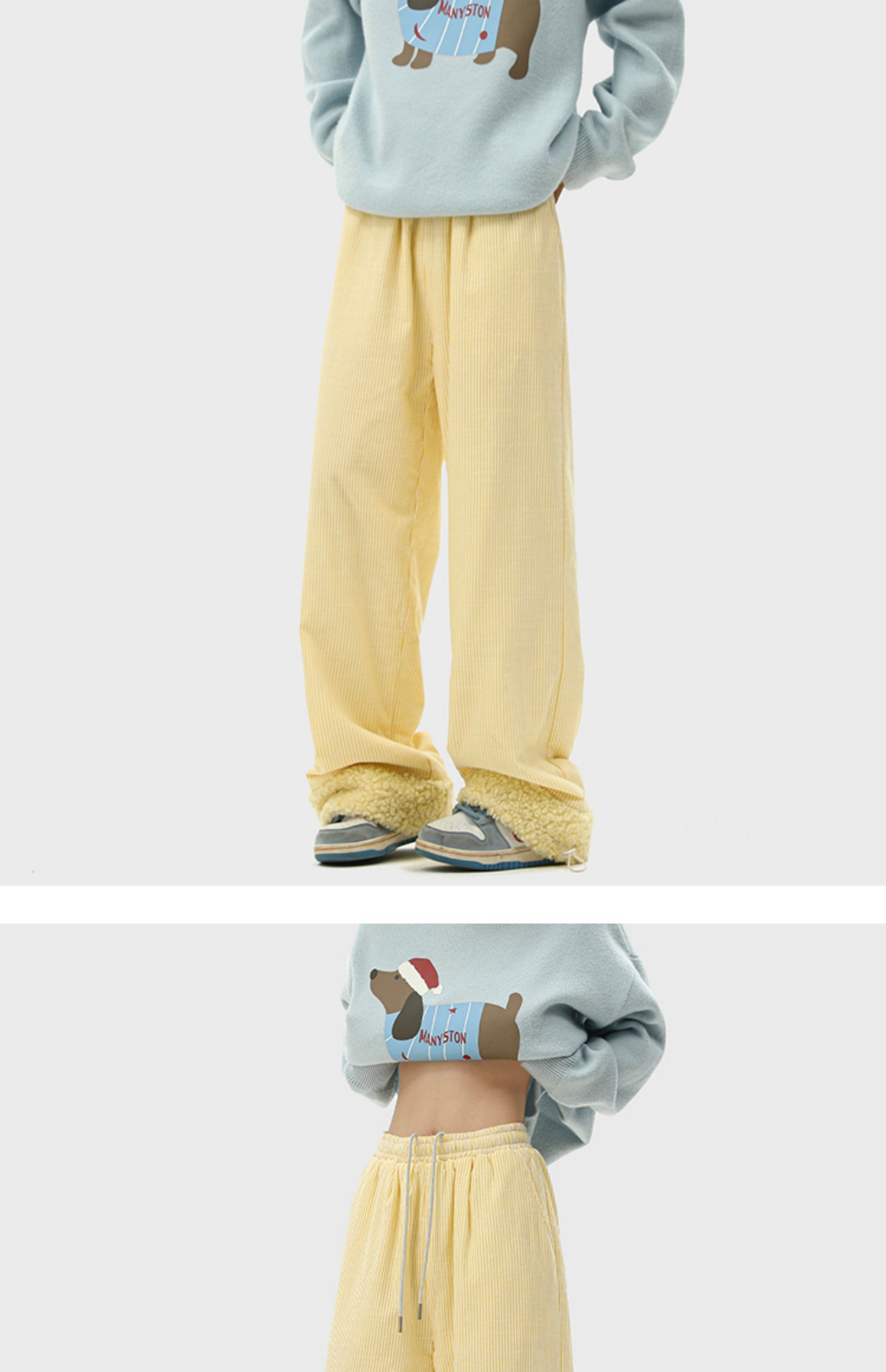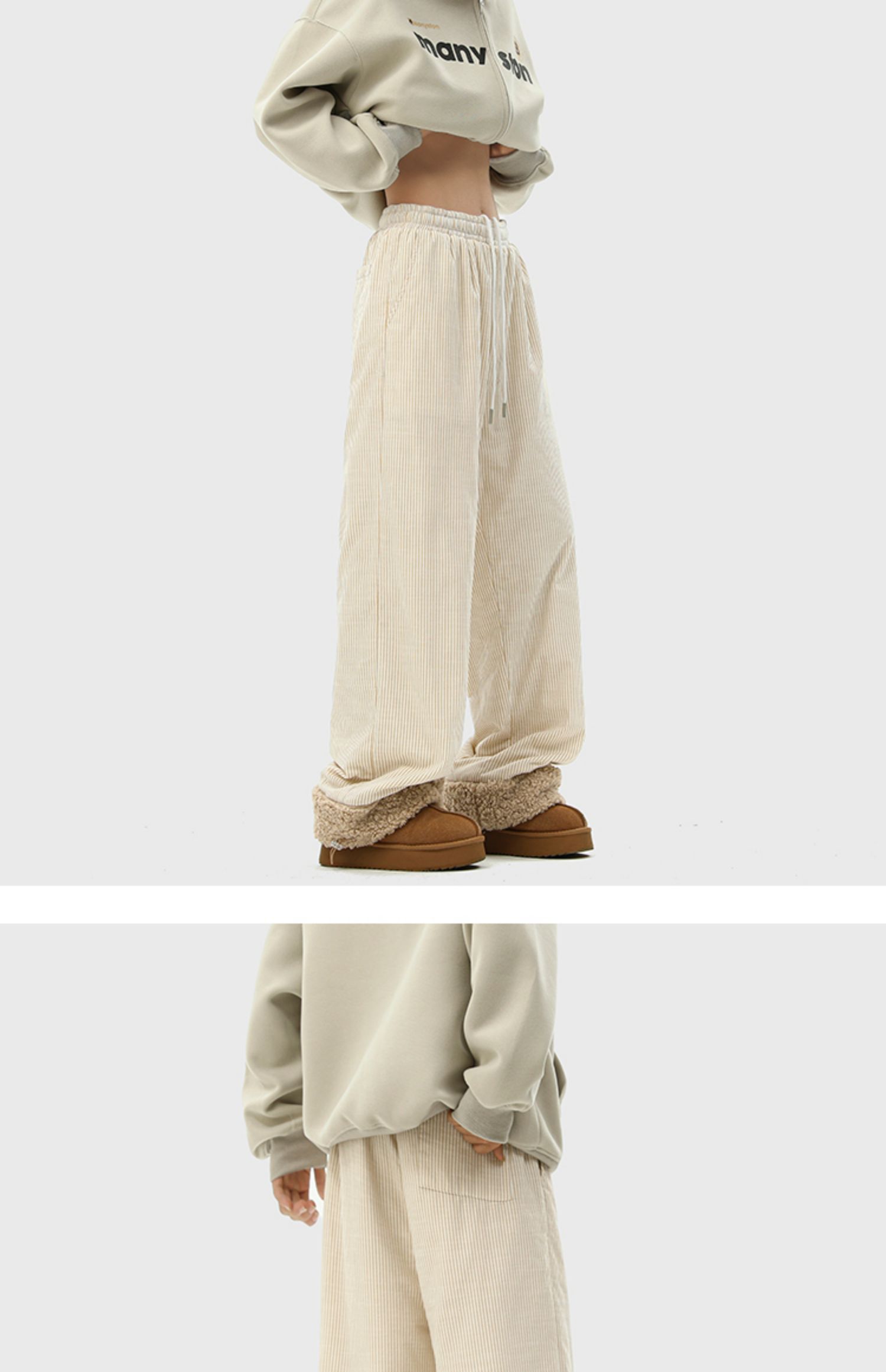 BWKA多巴胺條紋保暖棉褲女男冬季加絨加厚防寒濶腿褲慵懶風休閒褲