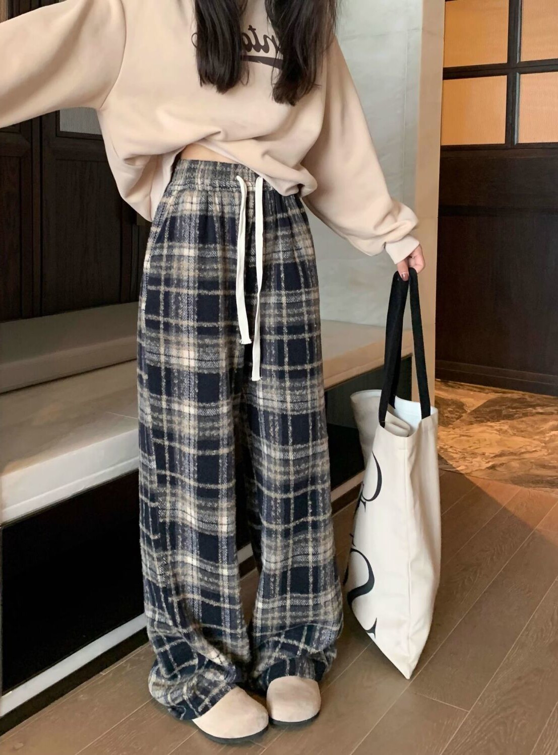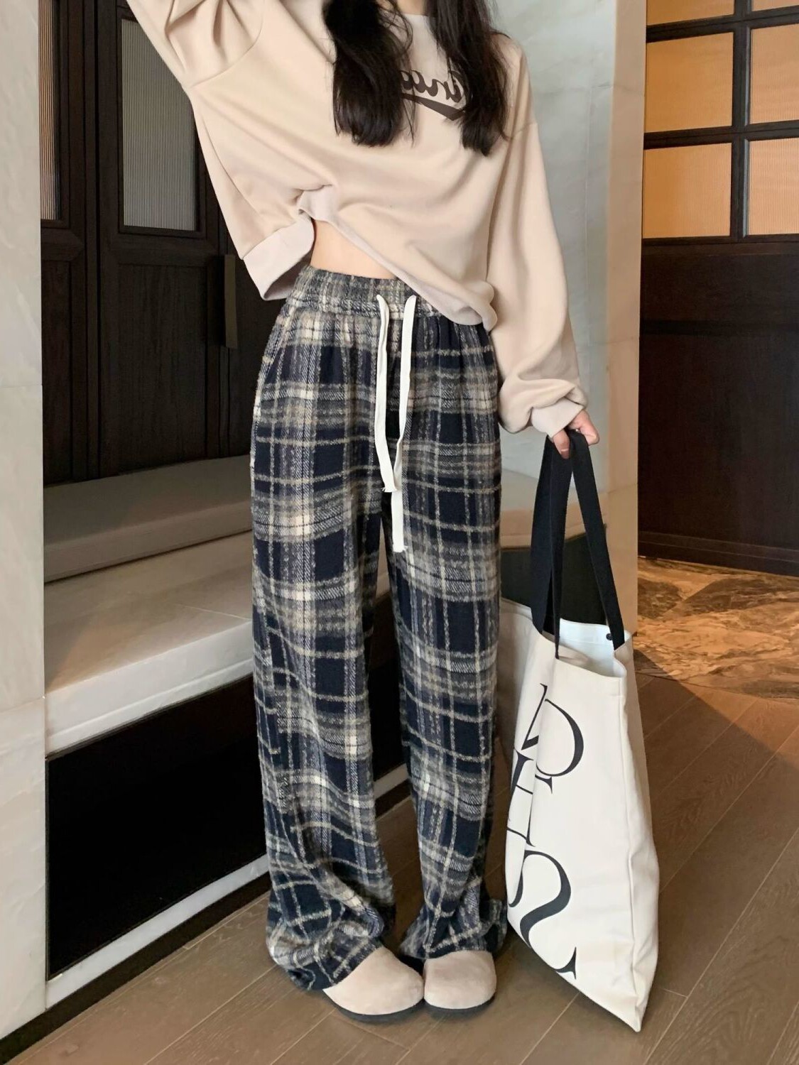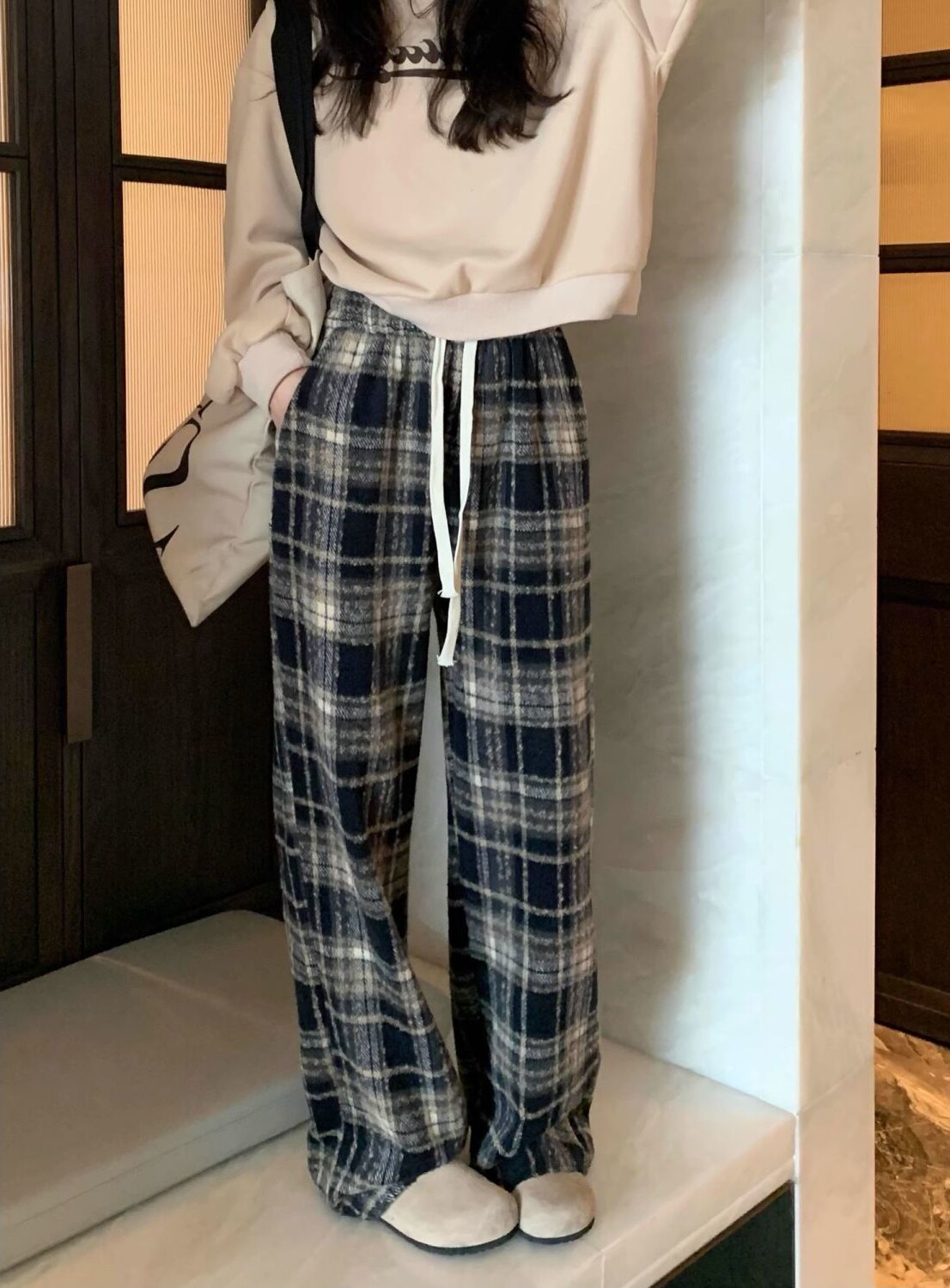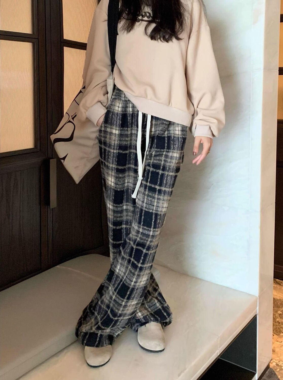 胖MM大碼2-300斤美式復古格子褲毛呢休閒褲女秋冬加厚加厚濶腿褲