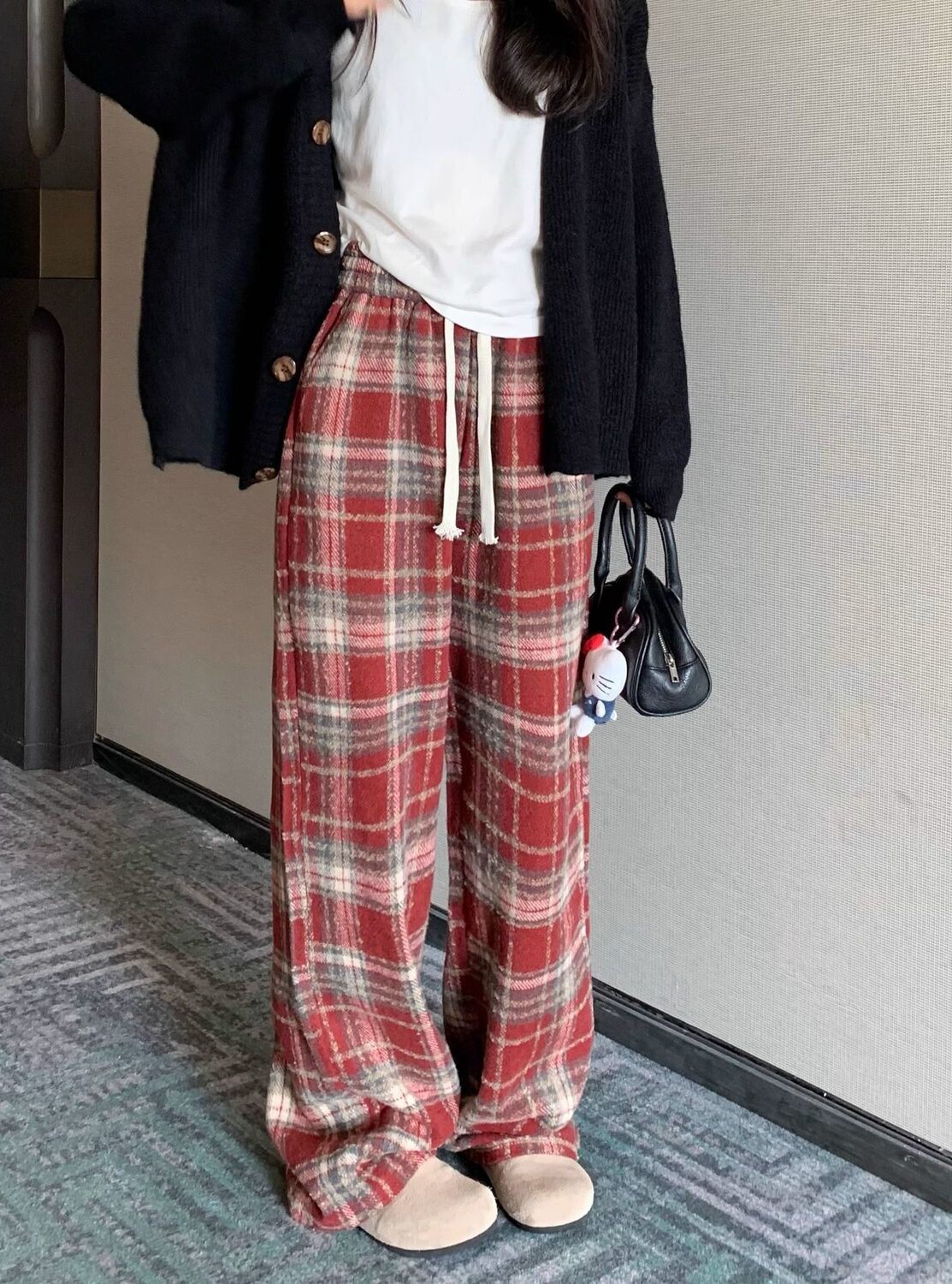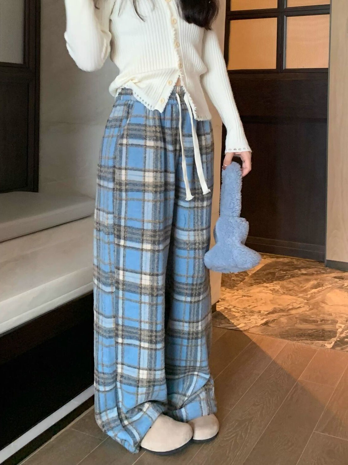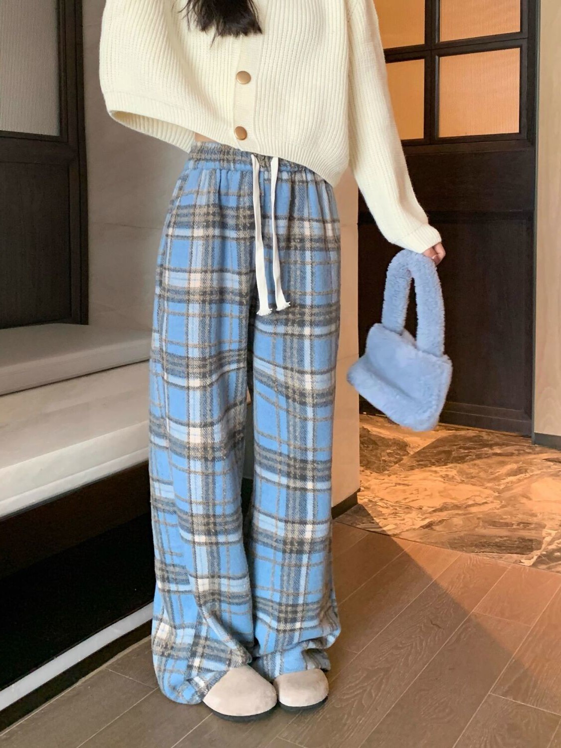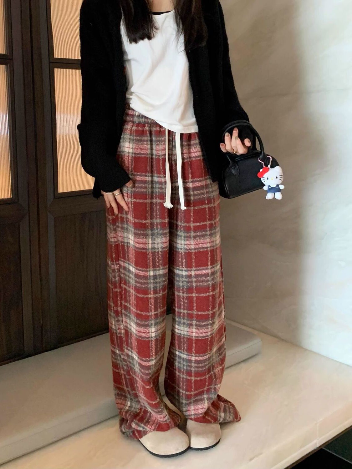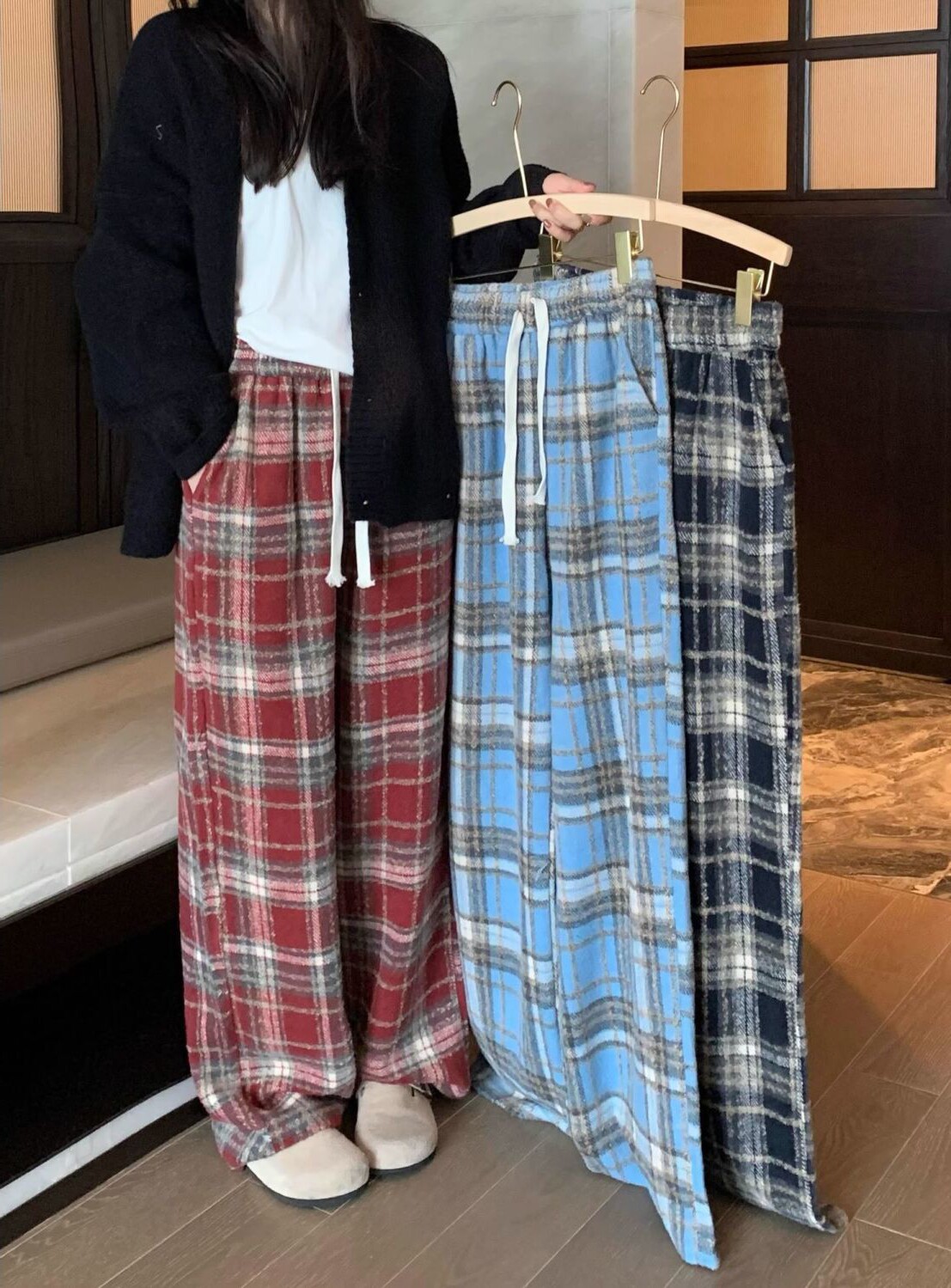胖MM大碼2-300斤美式復古格子褲毛呢休閒褲女秋冬加厚加厚濶腿褲