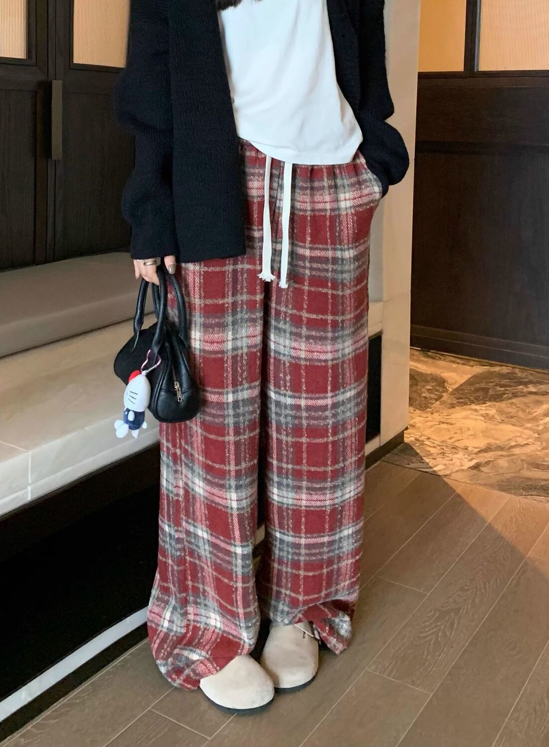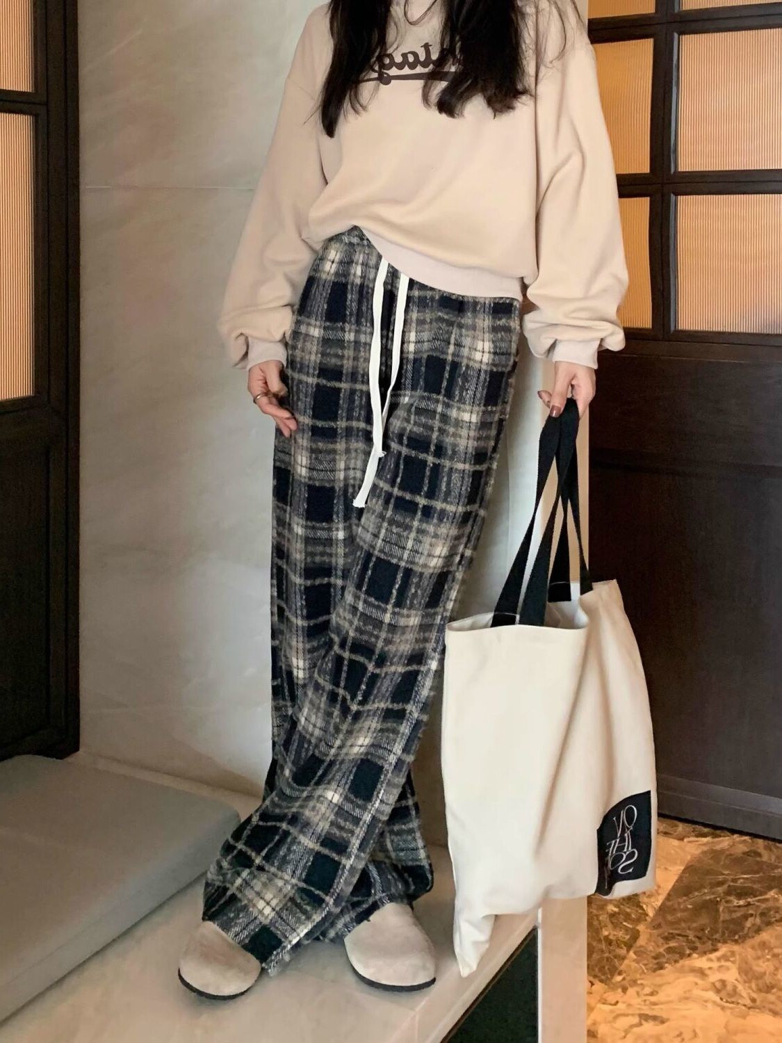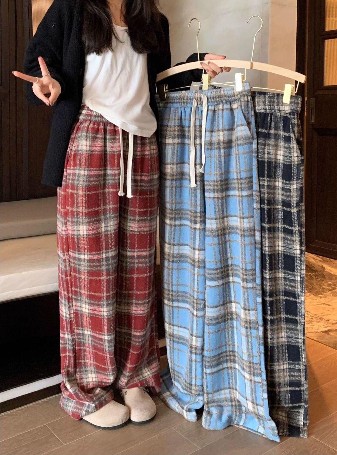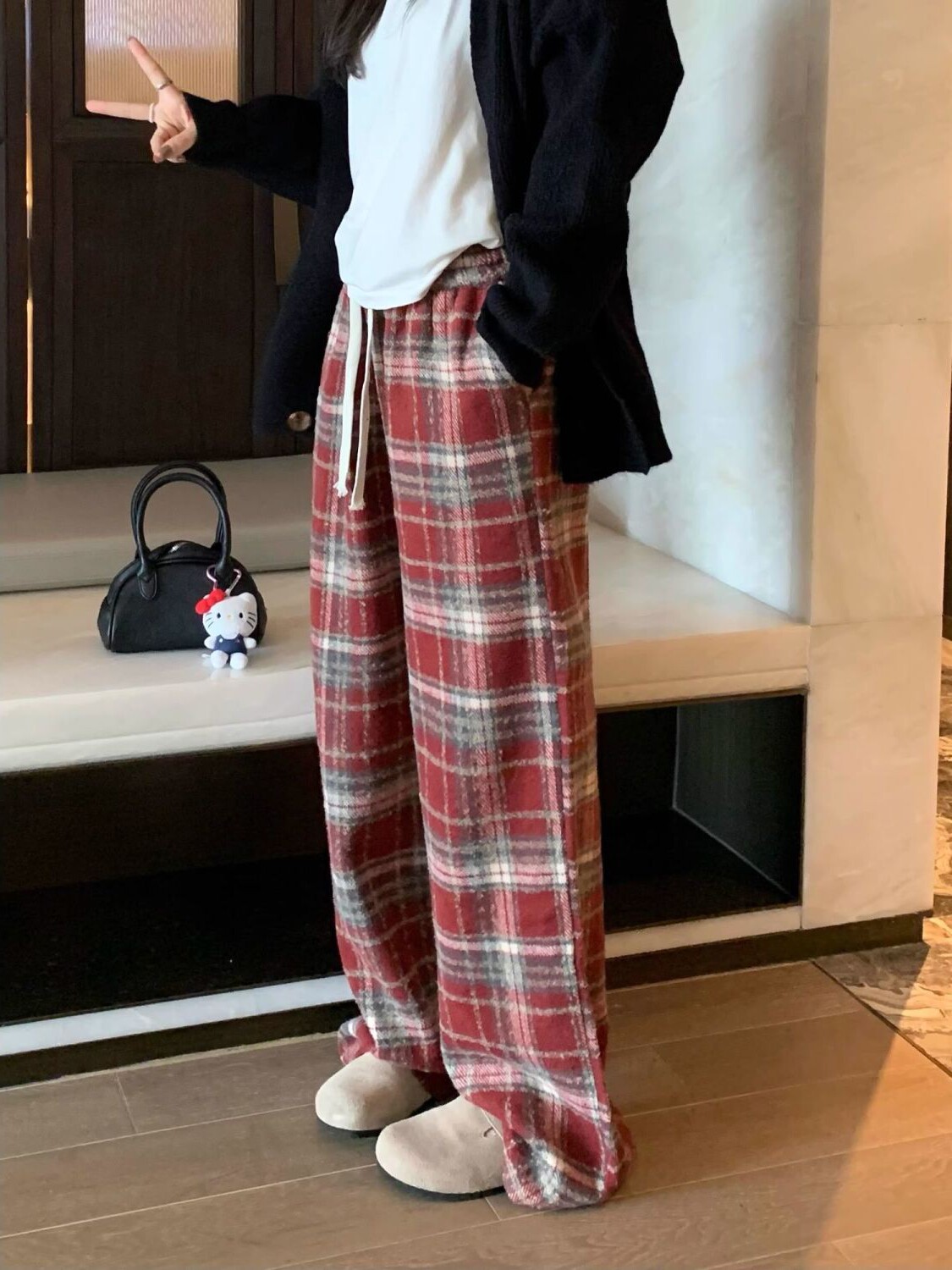 胖MM大碼2-300斤美式復古格子褲毛呢休閒褲女秋冬加厚加厚濶腿褲
