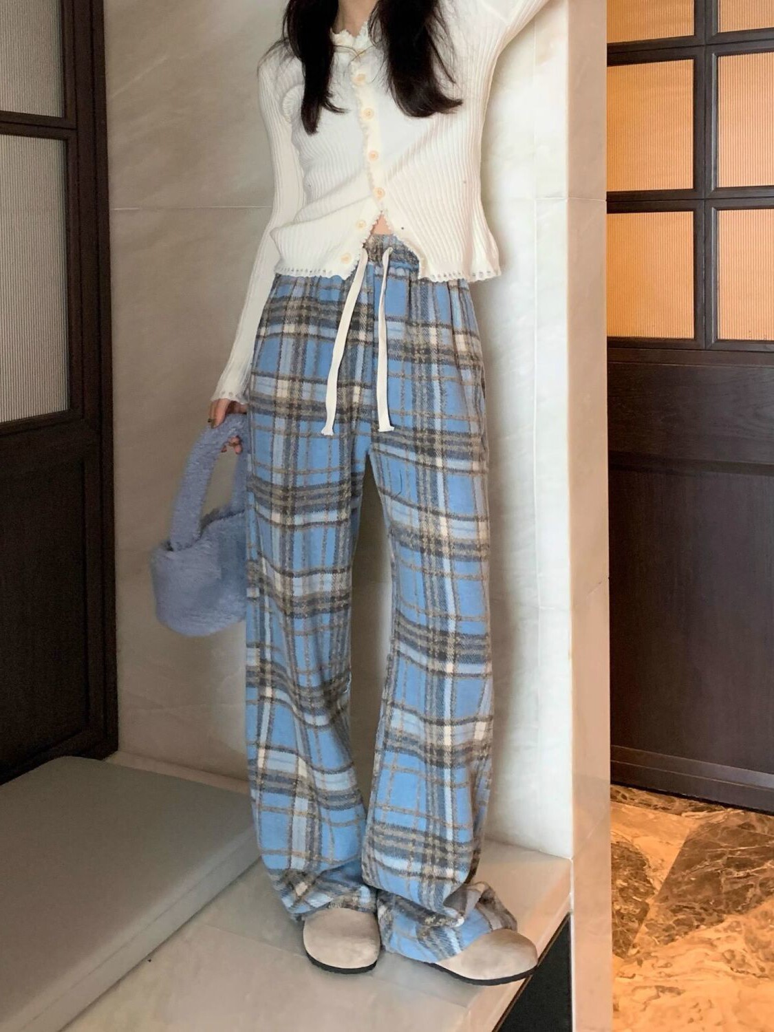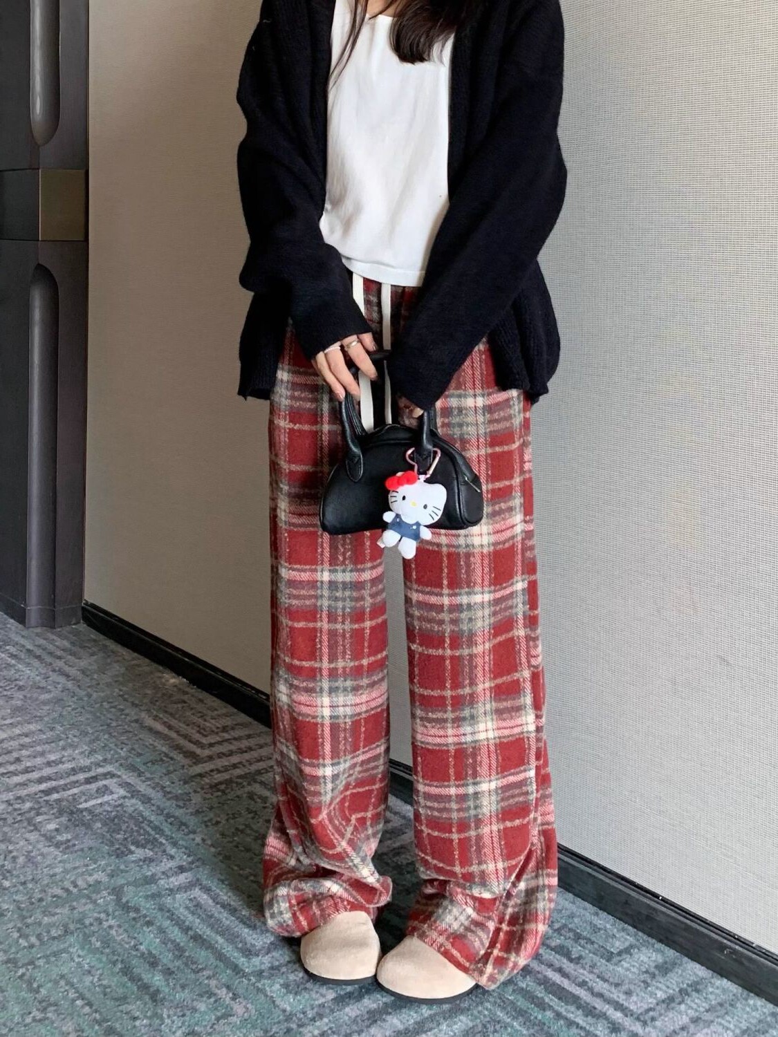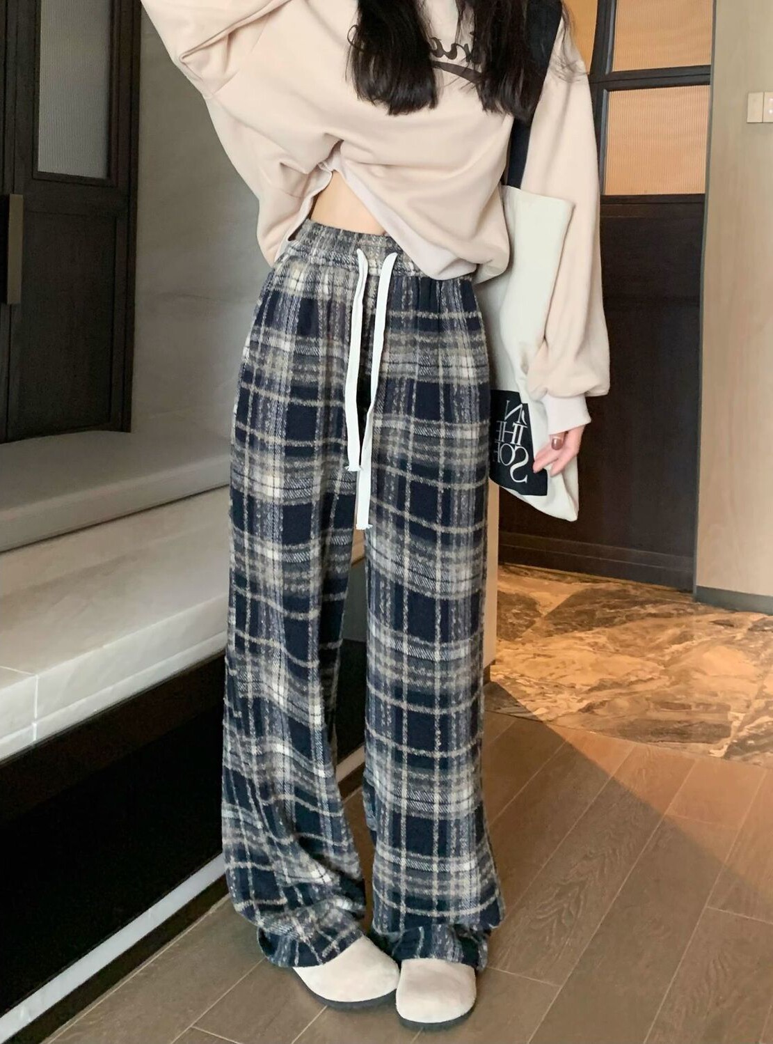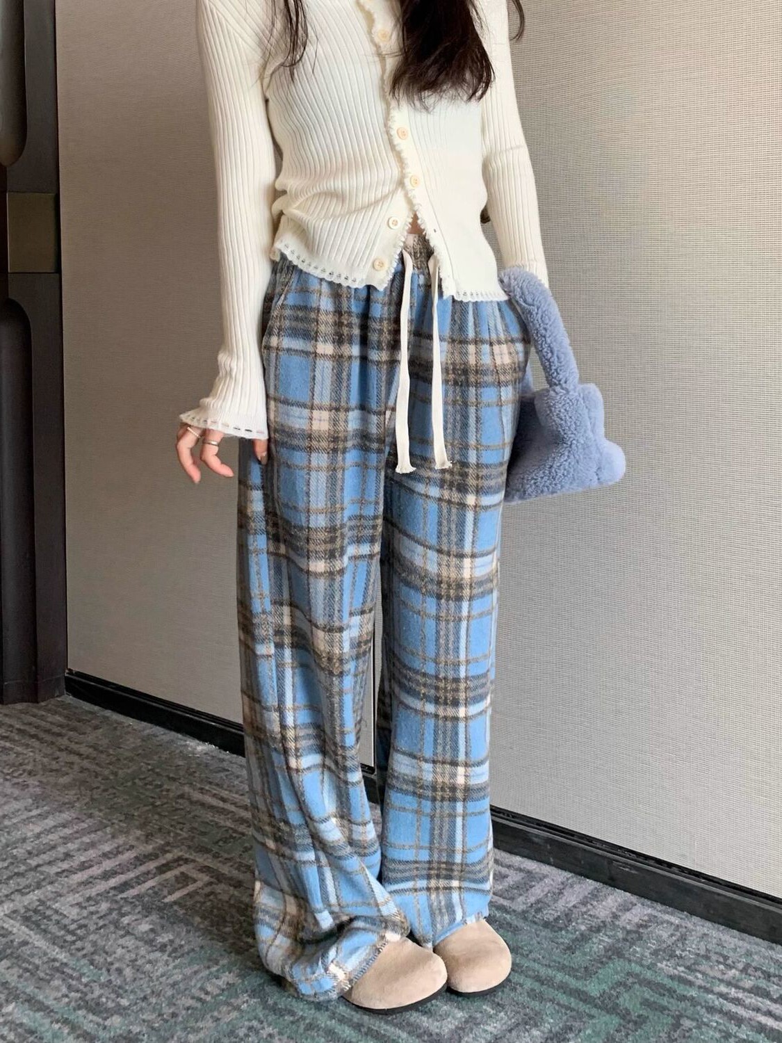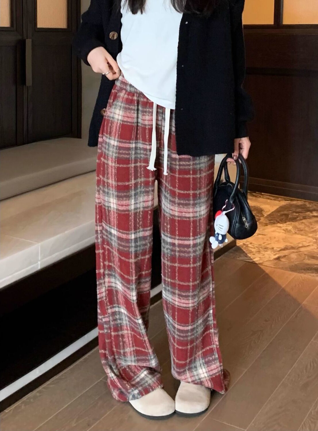 胖MM大碼2-300斤美式復古格子褲毛呢休閒褲女秋冬加厚加厚濶腿褲
