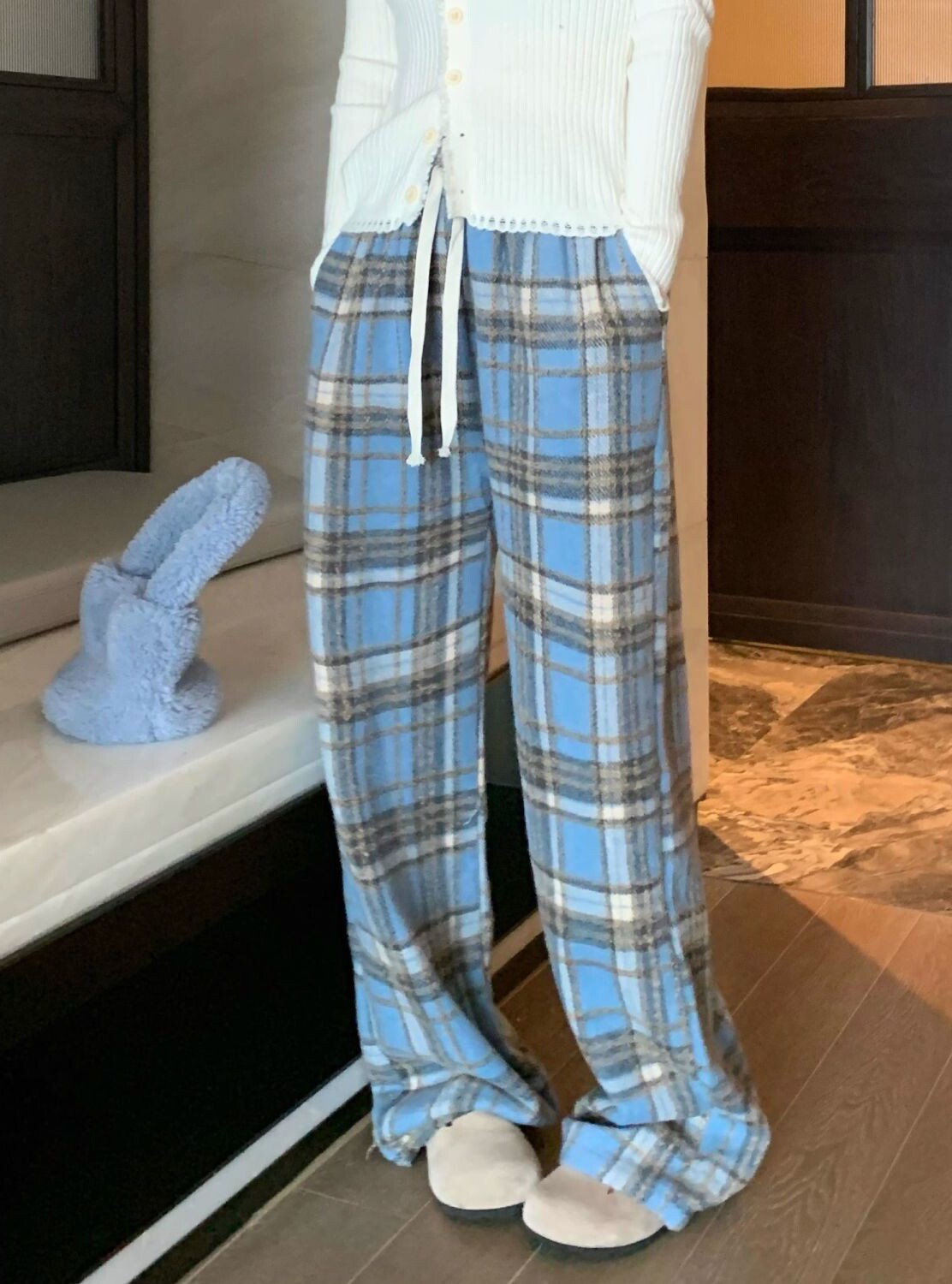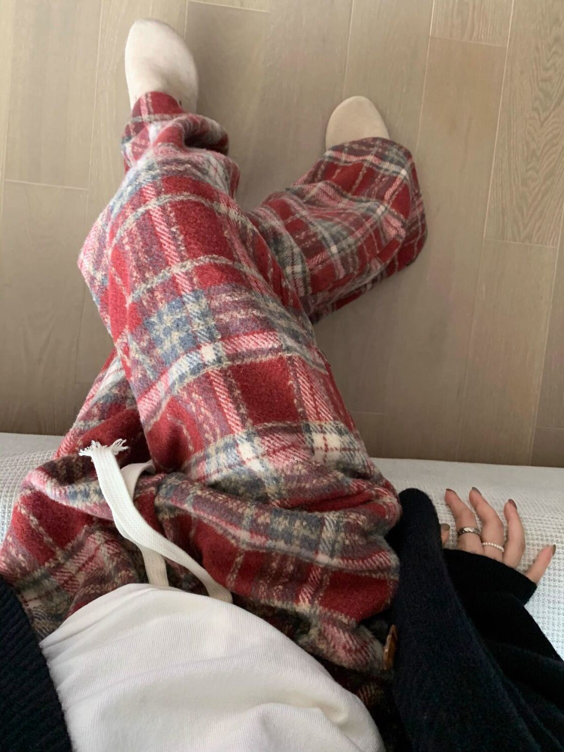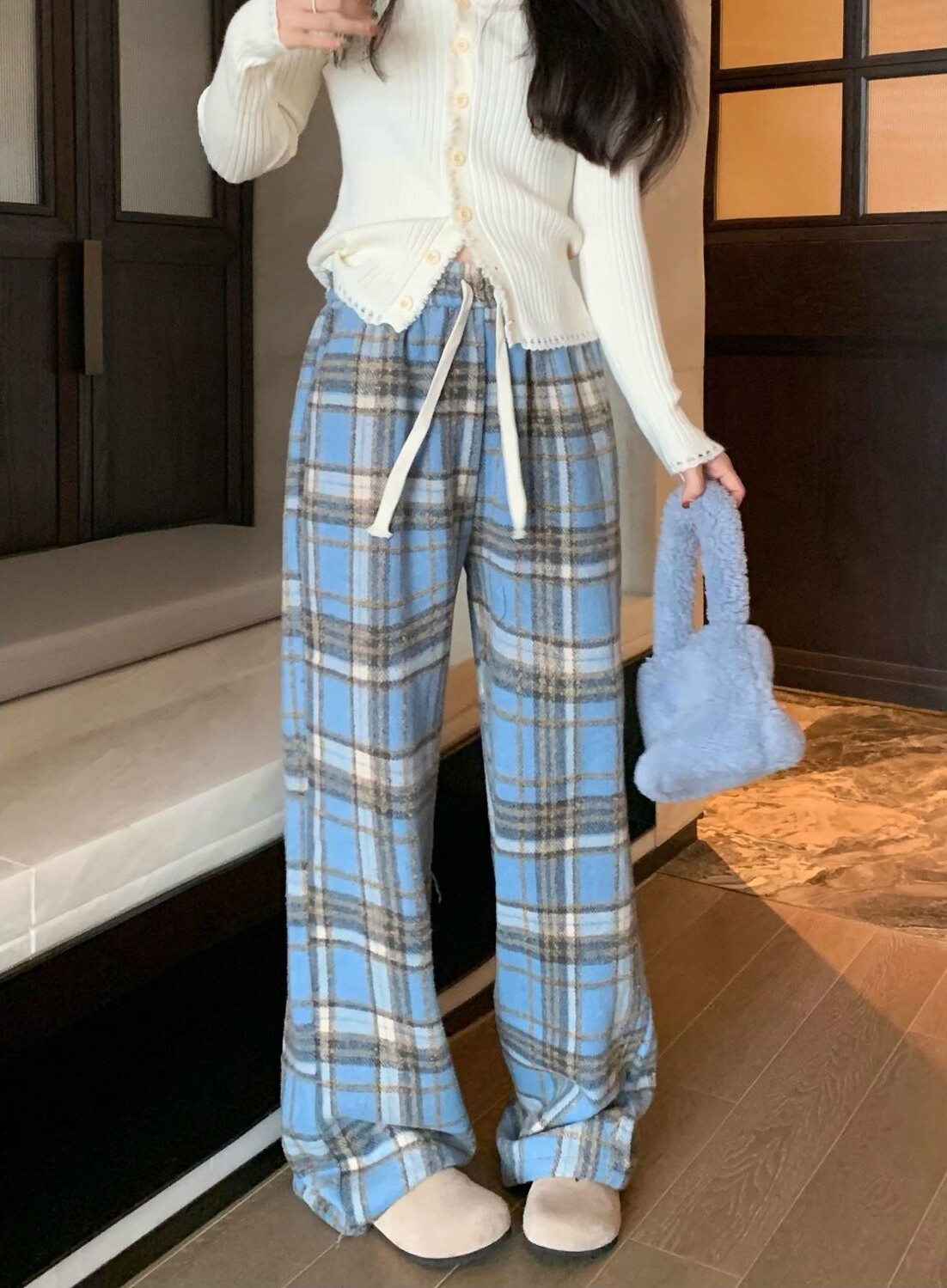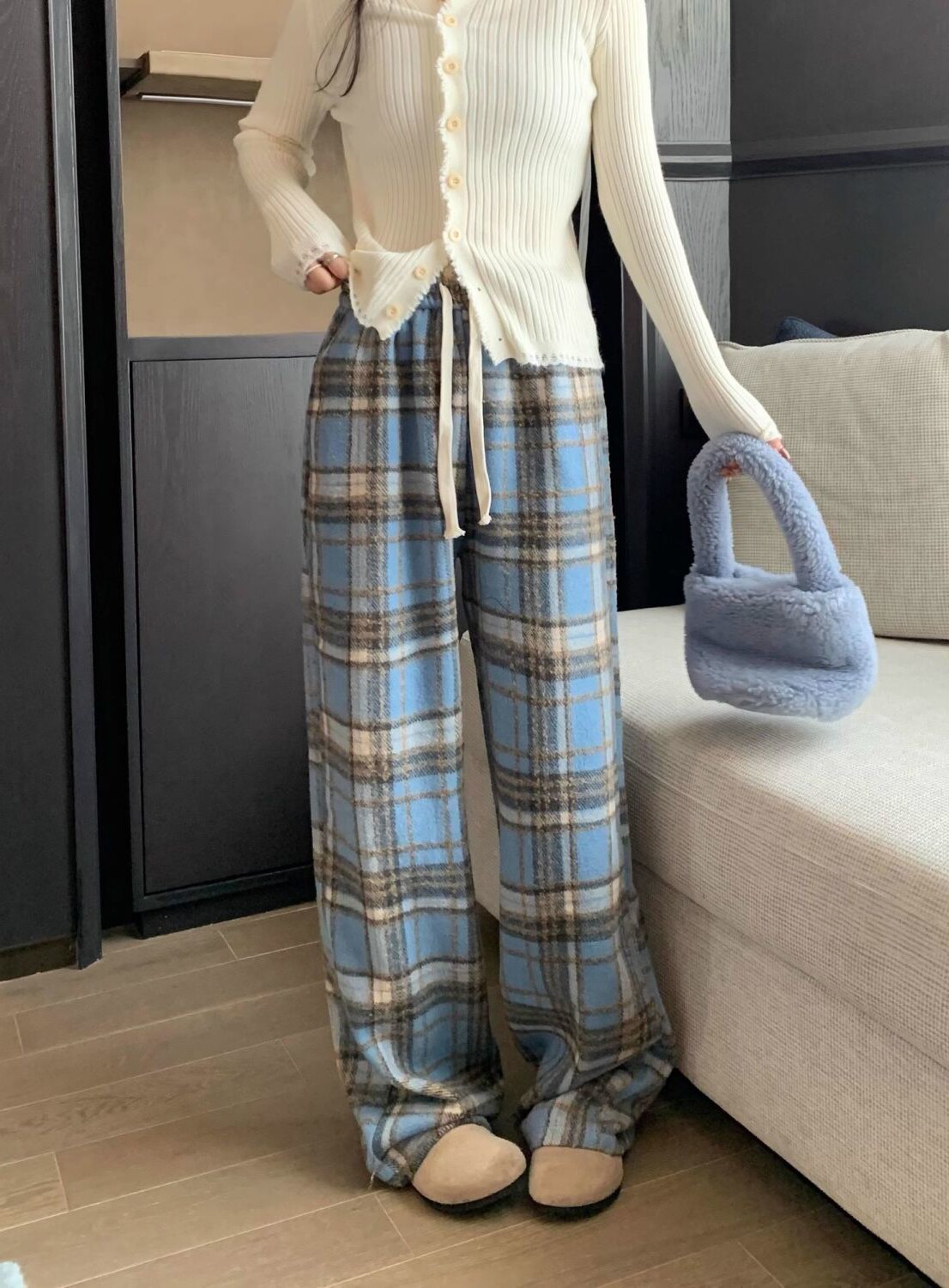胖MM大碼2-300斤美式復古格子褲毛呢休閒褲女秋冬加厚加厚濶腿褲