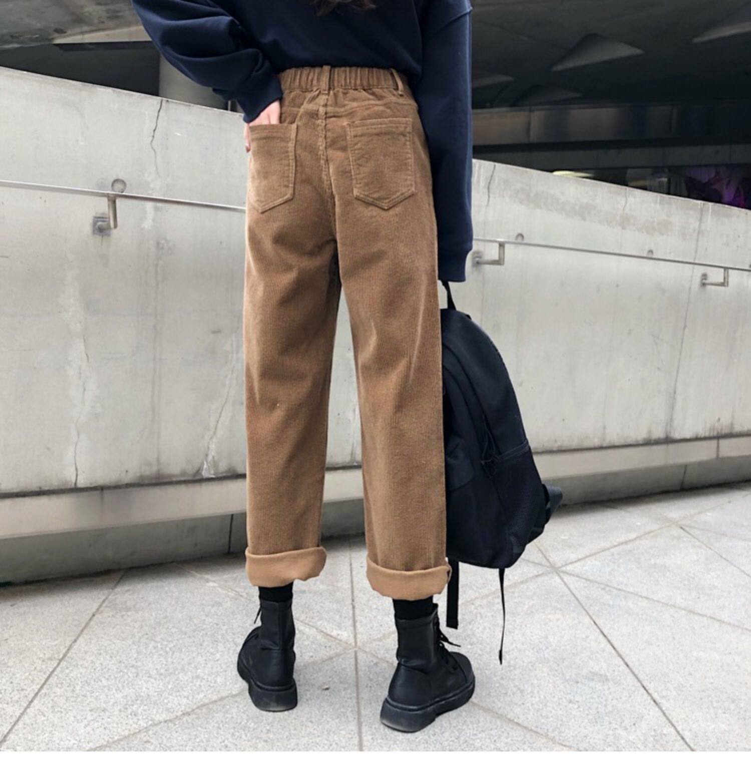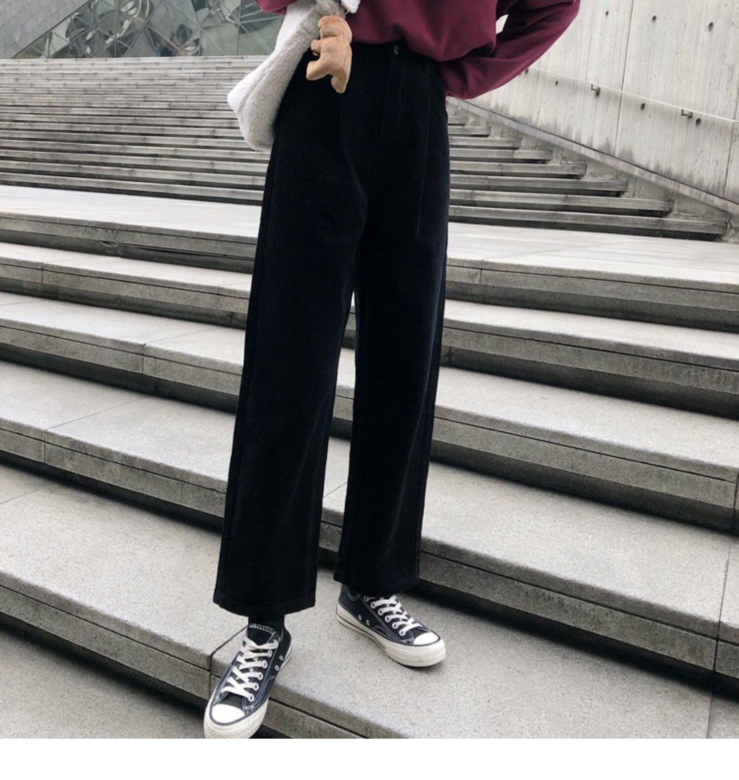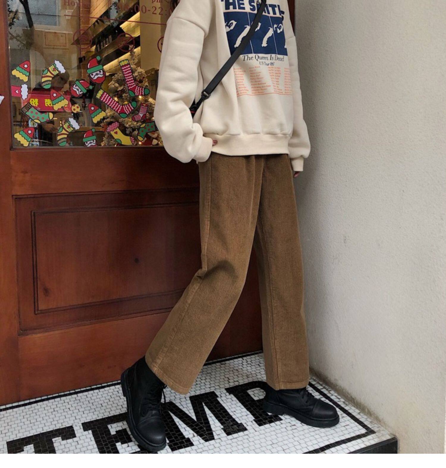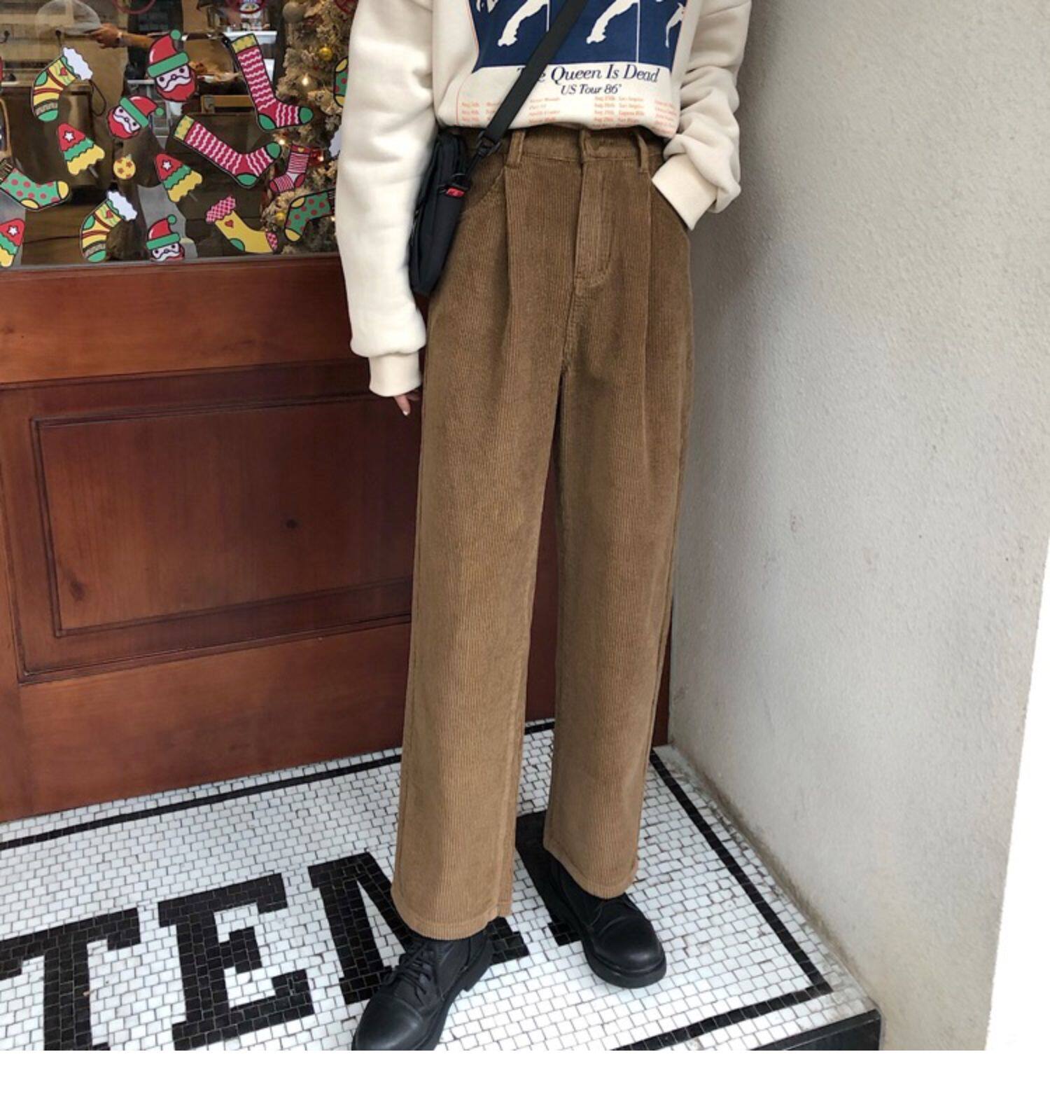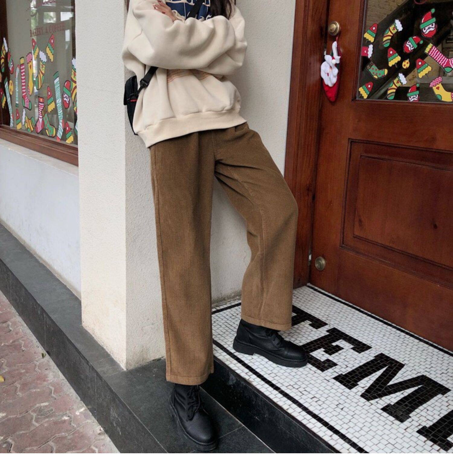 復古咖色燈芯絨褲子女秋冬加絨小個子八分濶腿顯瘦直筒垂感休閒褲