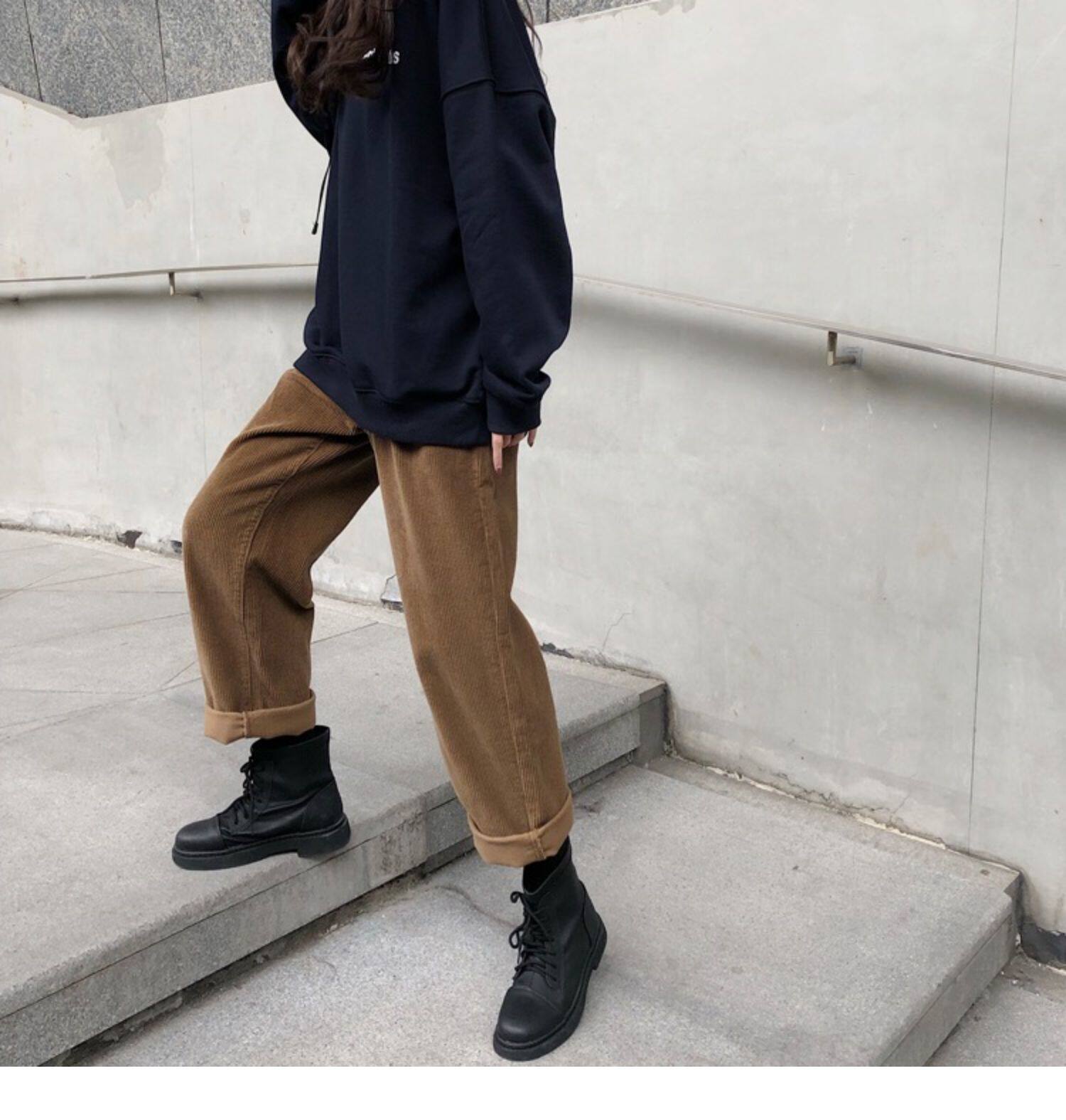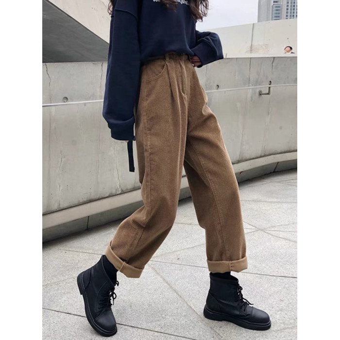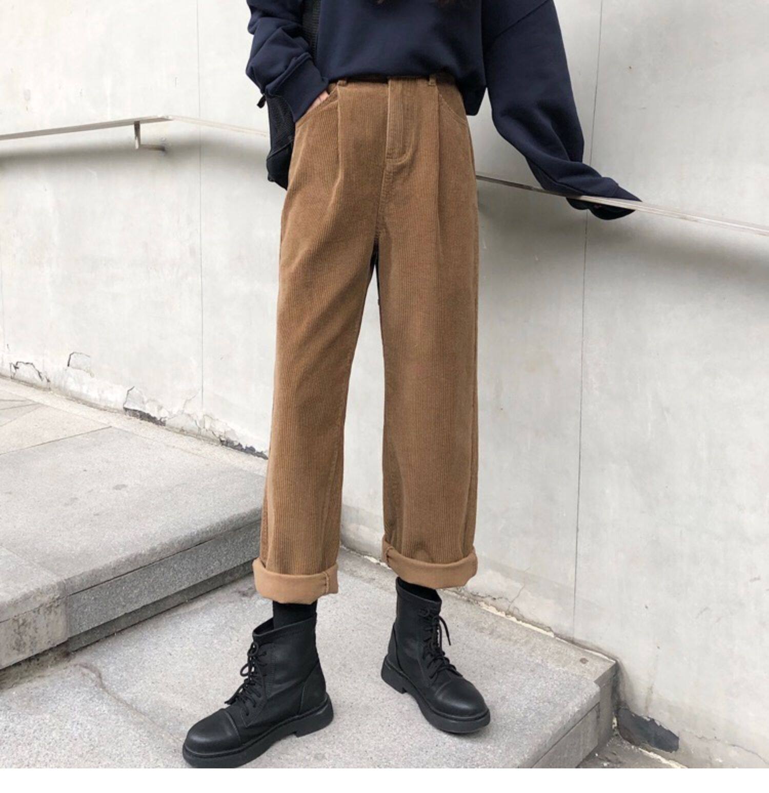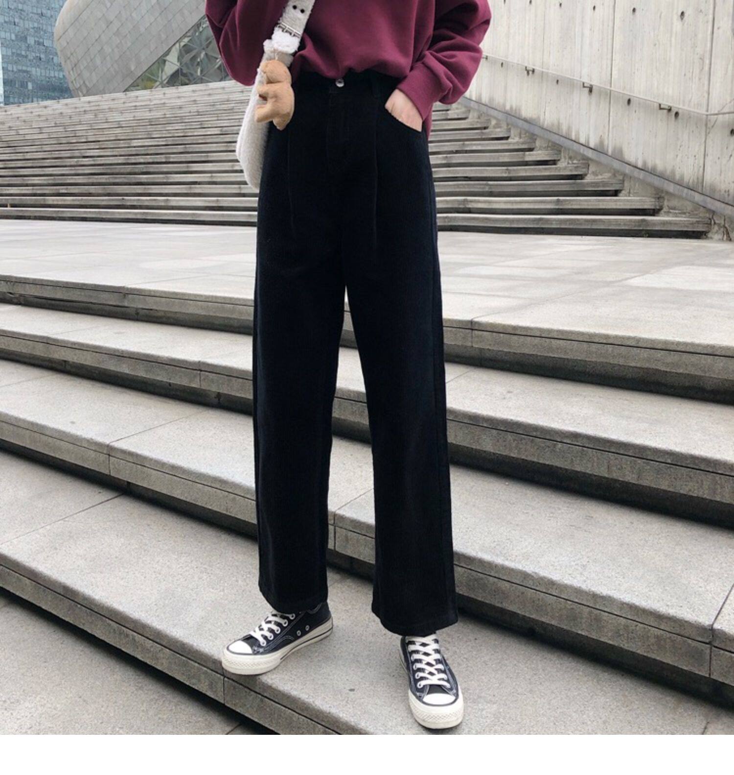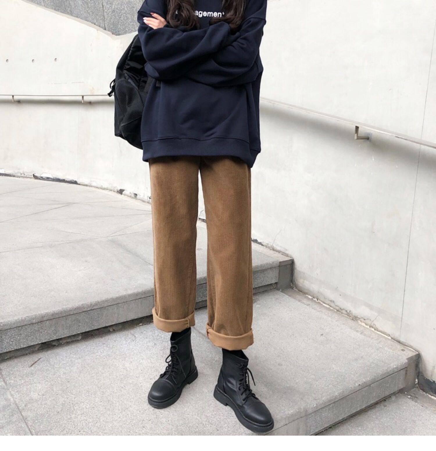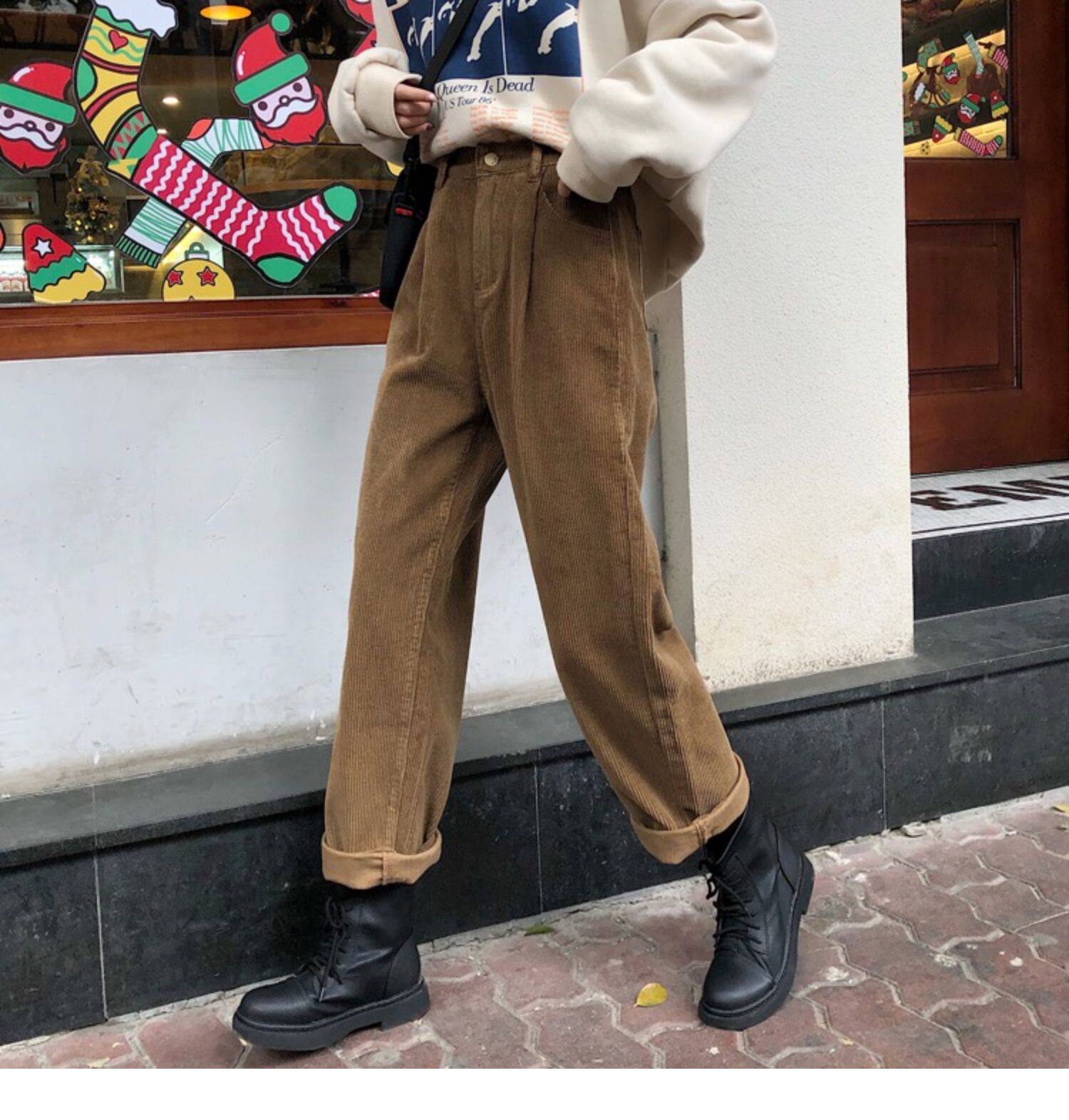 復古咖色燈芯絨褲子女秋冬加絨小個子八分濶腿顯瘦直筒垂感休閒褲