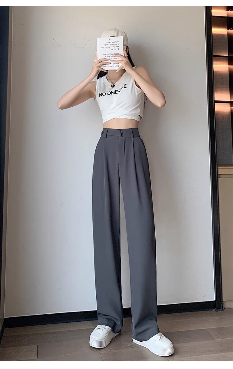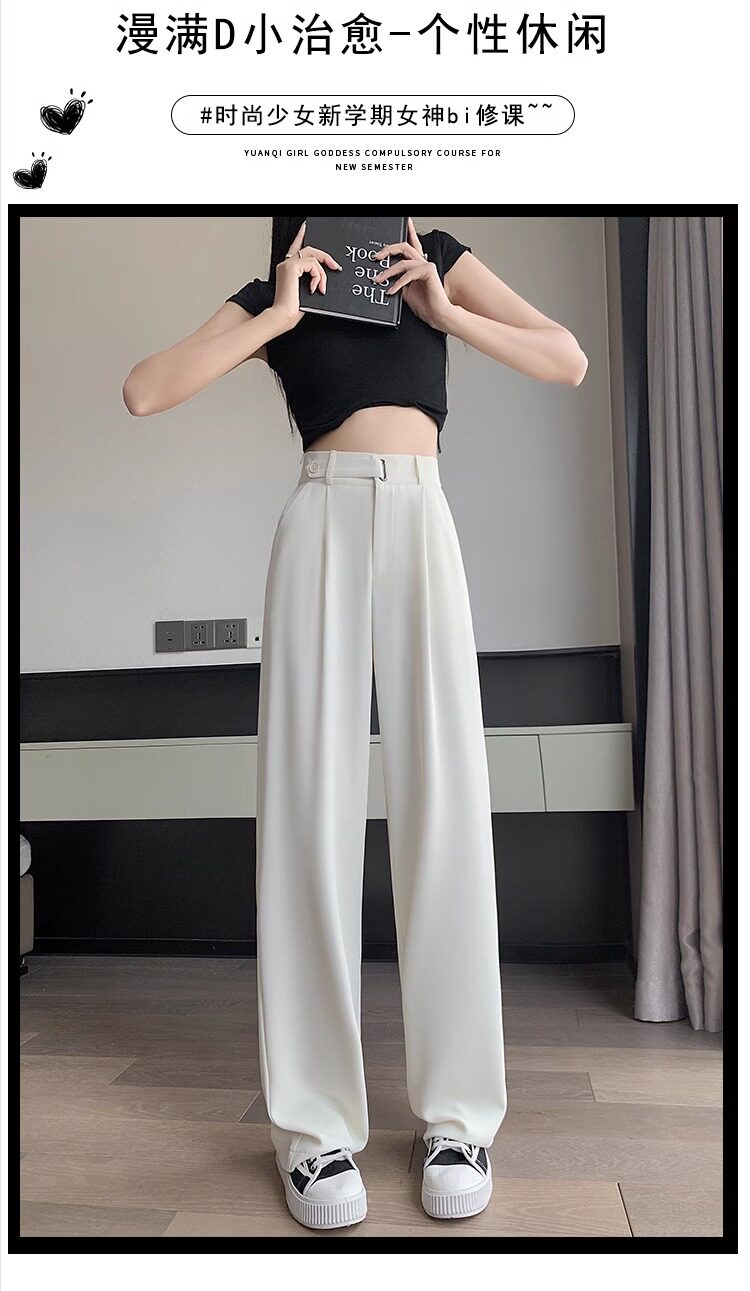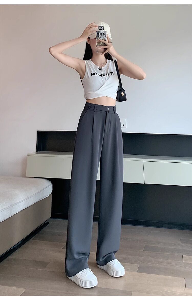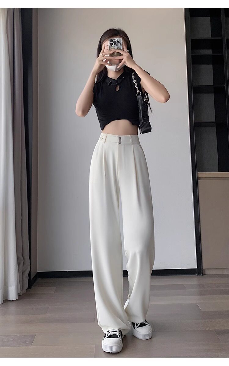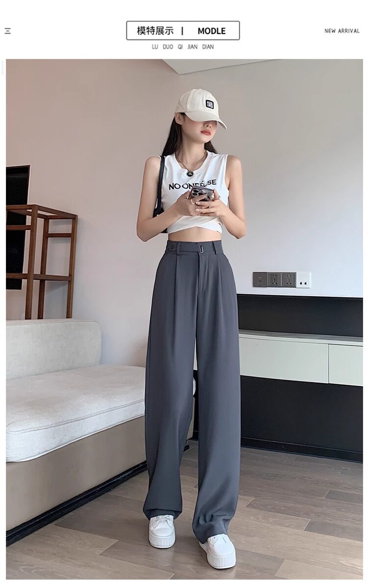 冰絲西裝濶腿褲女夏季薄款小個子高腰垂感寬鬆窄版直筒褲拖地褲子