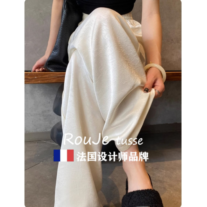 Rouje tusse肌理感褶皺三醋酸緞面濶腿褲女白色綢緞褲垂感冰絲褲