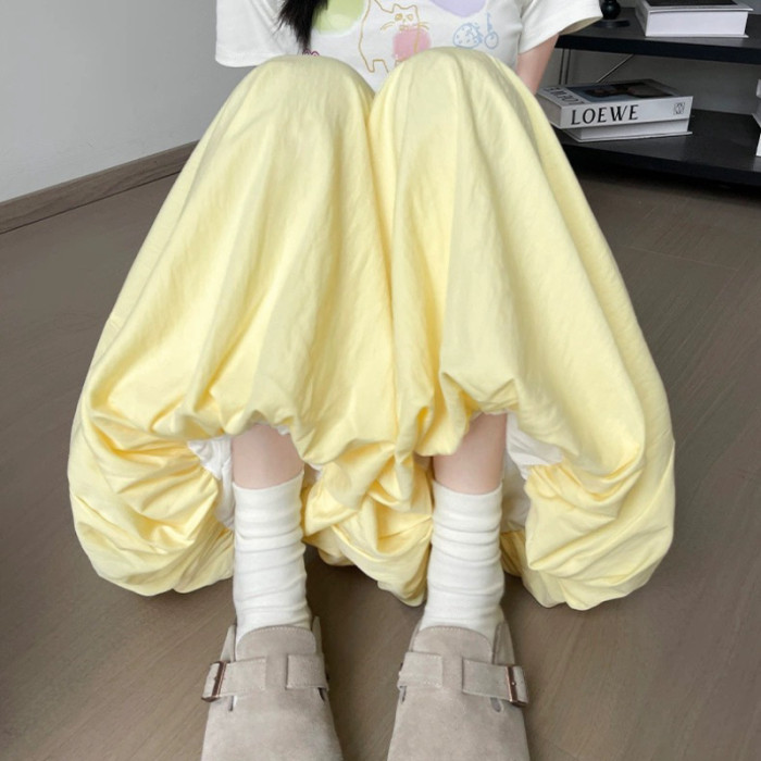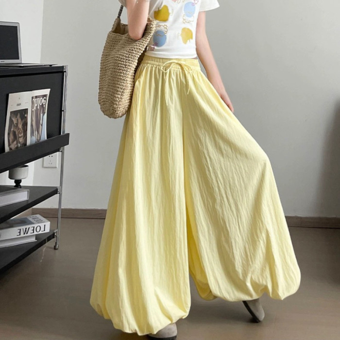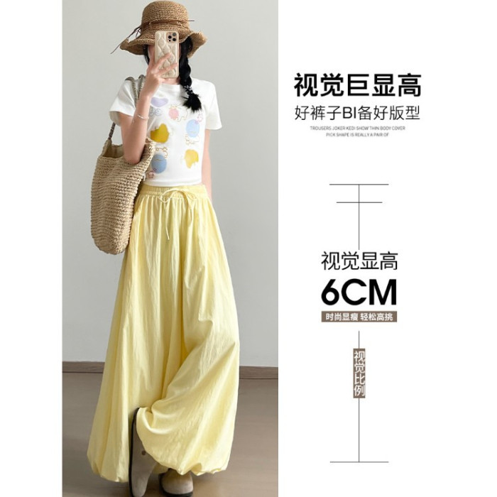黃色花苞裙褲女夏季新款高腰寬松顯瘦垂感裙褲小個子濶腿褲大碼