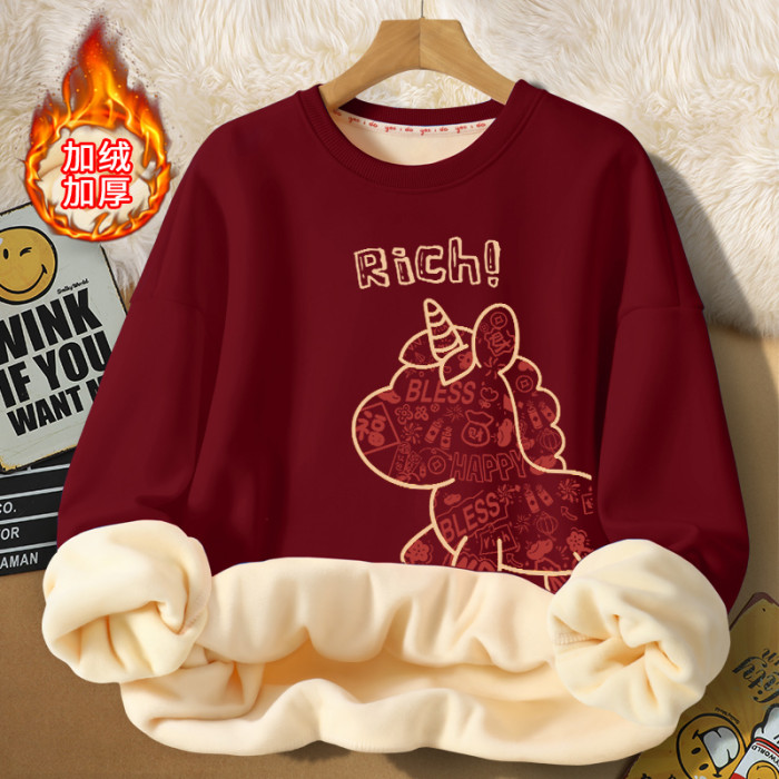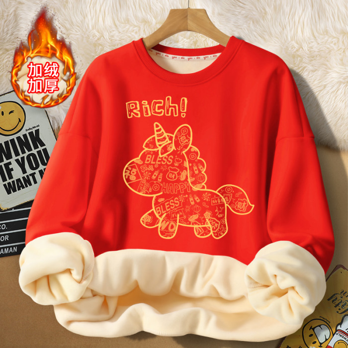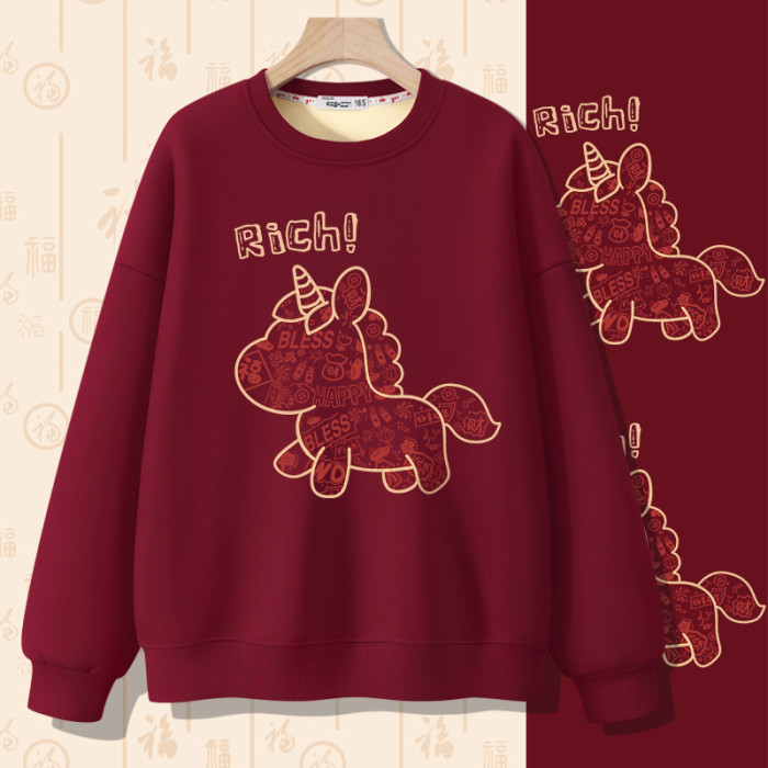 2026馬年過年喜慶圓領本命年新年衣服屬馬酒紅色秋冬加絨衛衣女裝