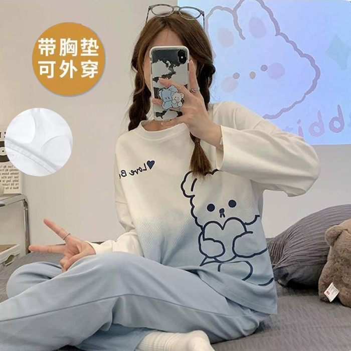 帶胸墊睡衣女春秋款純棉長袖一體防凸點條紋卡通加大碼可外穿套裝
