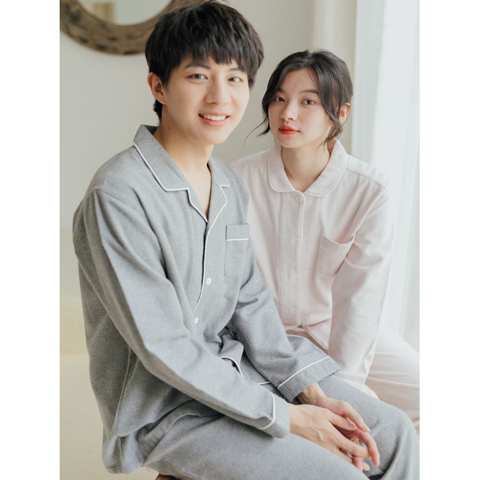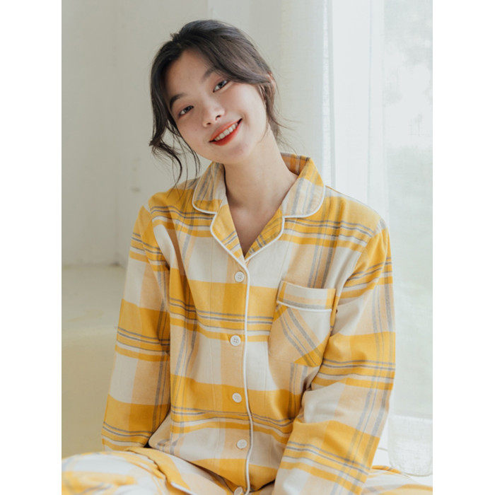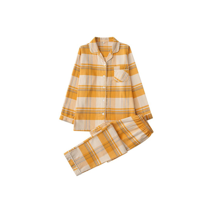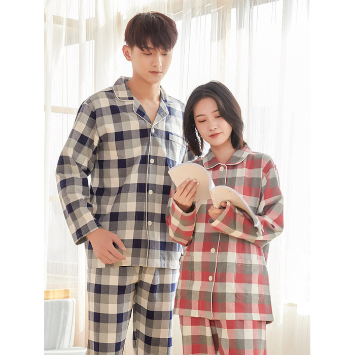 出口日本女士全棉春秋冬季純棉磨毛絨布情侶長袖睡衣格子家居服男