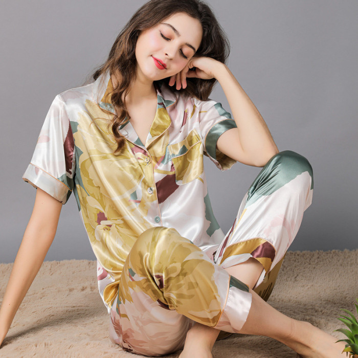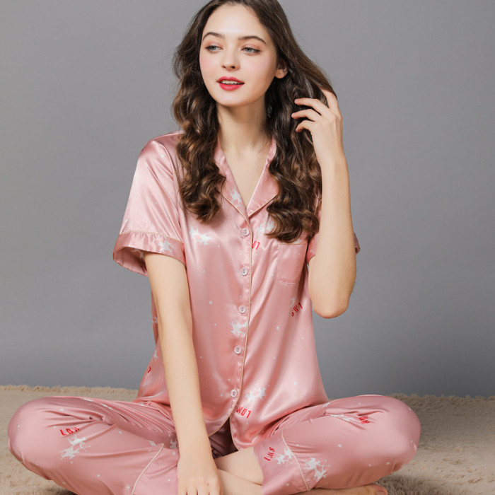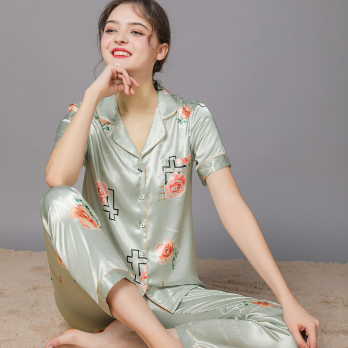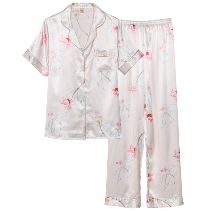 女夏絲綢睡衣短袖印花冰絲套裝春季絲質開衫休閒薄款家居服