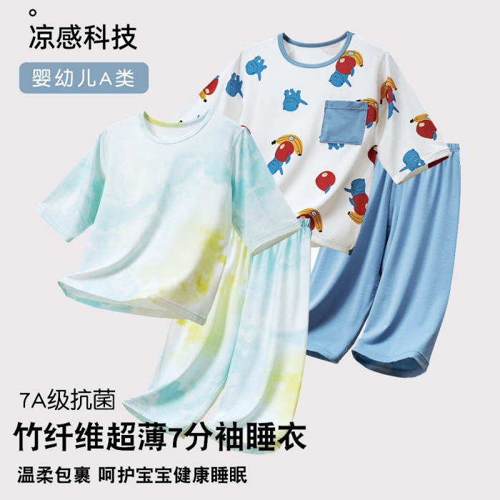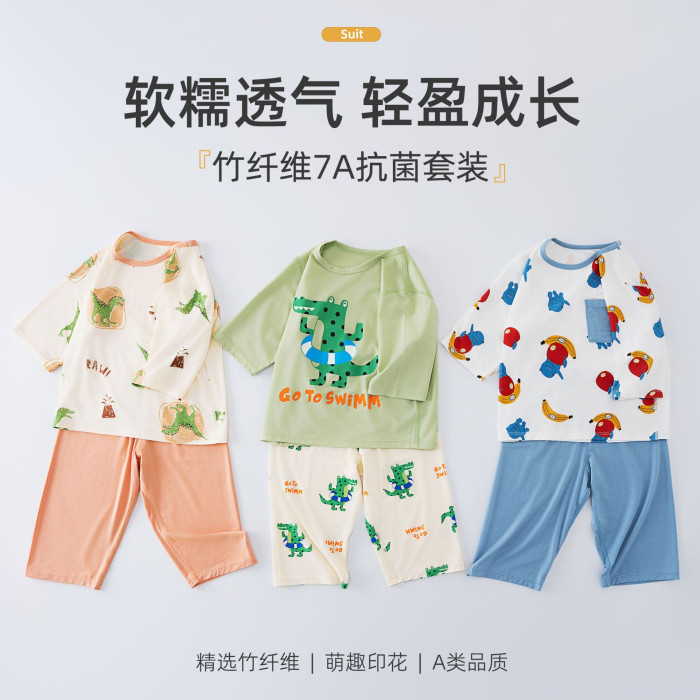 竹纖維男童薄款七分袖家居服套裝夏季兒童a類天絲透氣睡衣