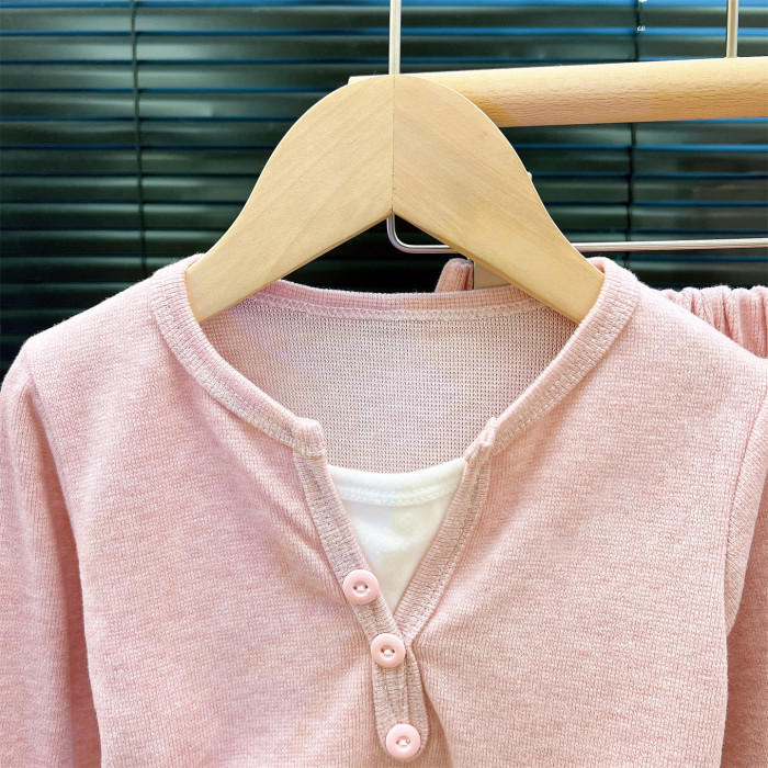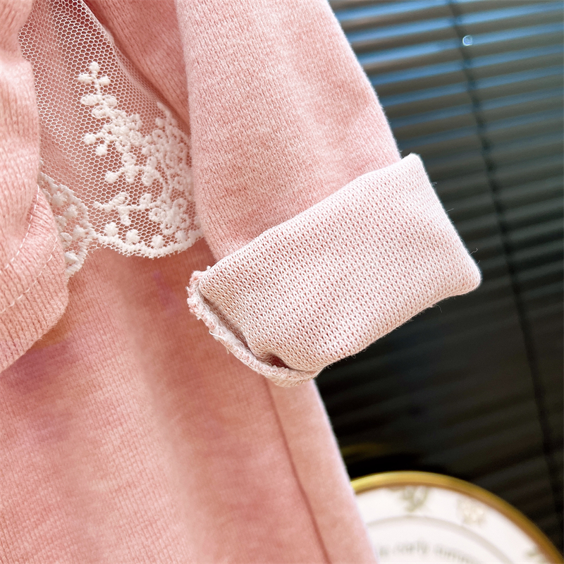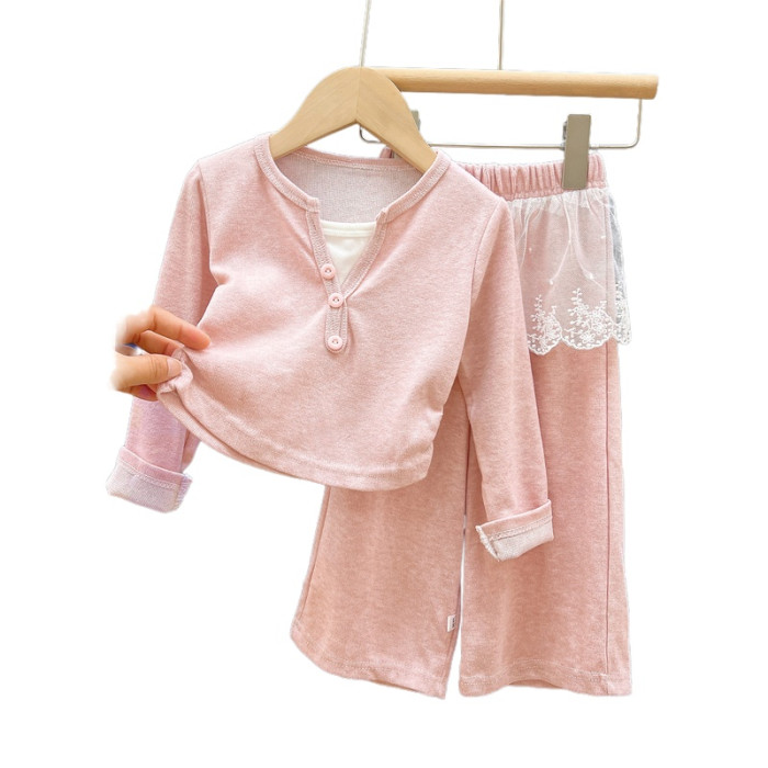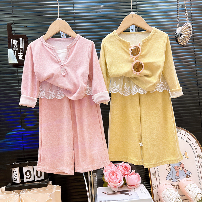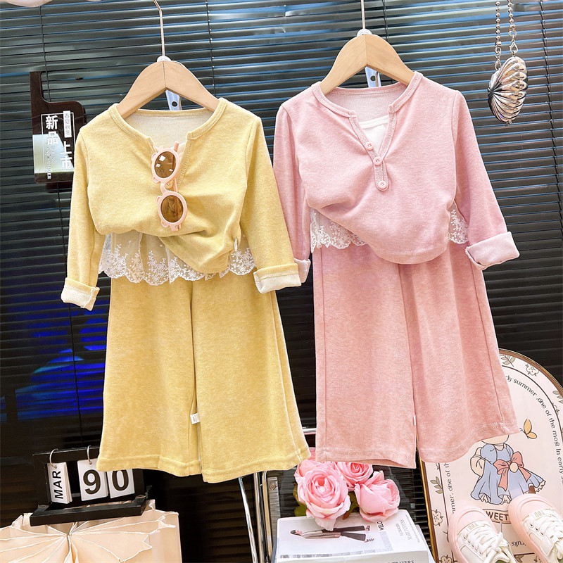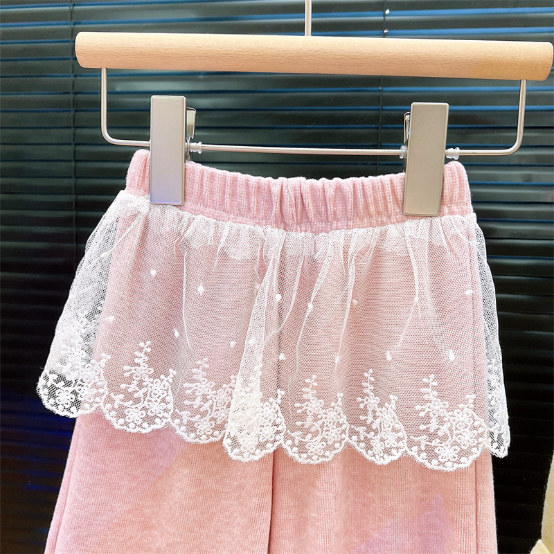 韓韓良品親子裝套裝2025秋季新款假兩件上衣蕾絲屁簾濶腿褲兩件套