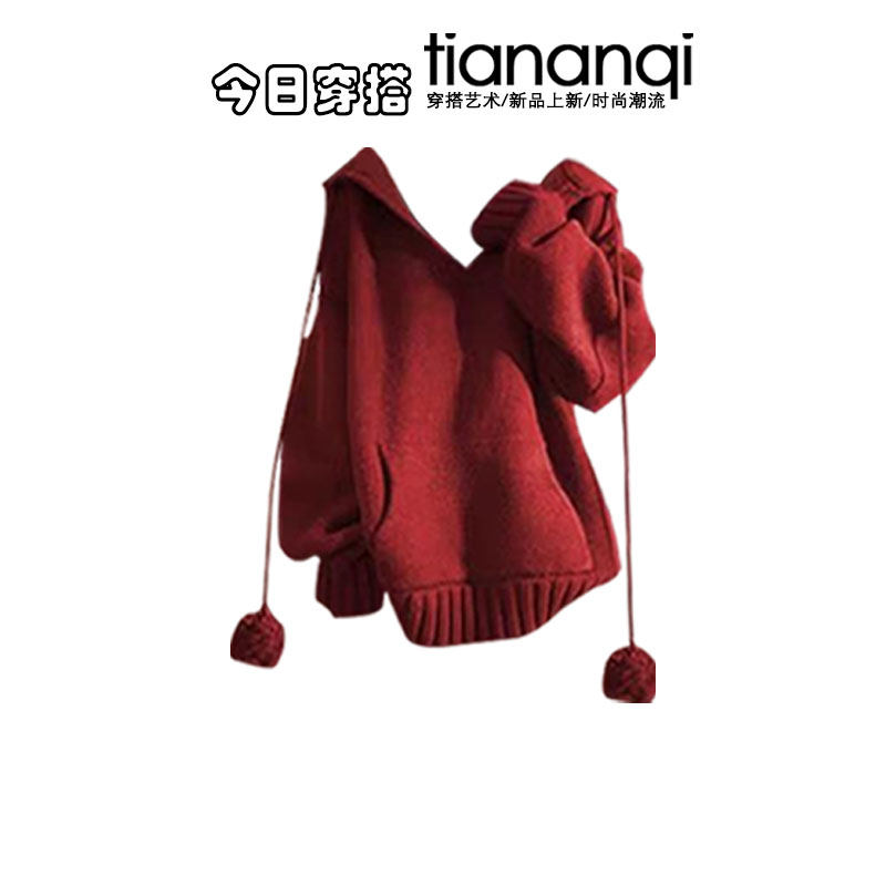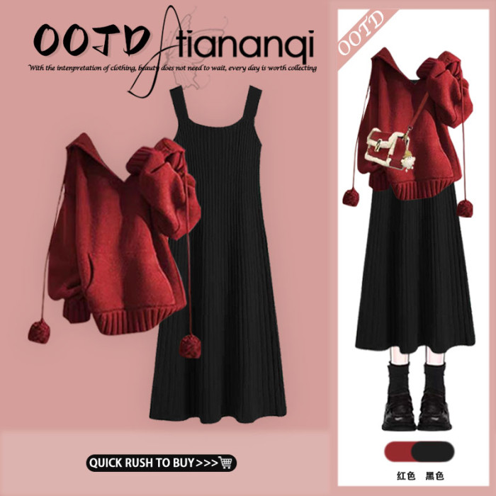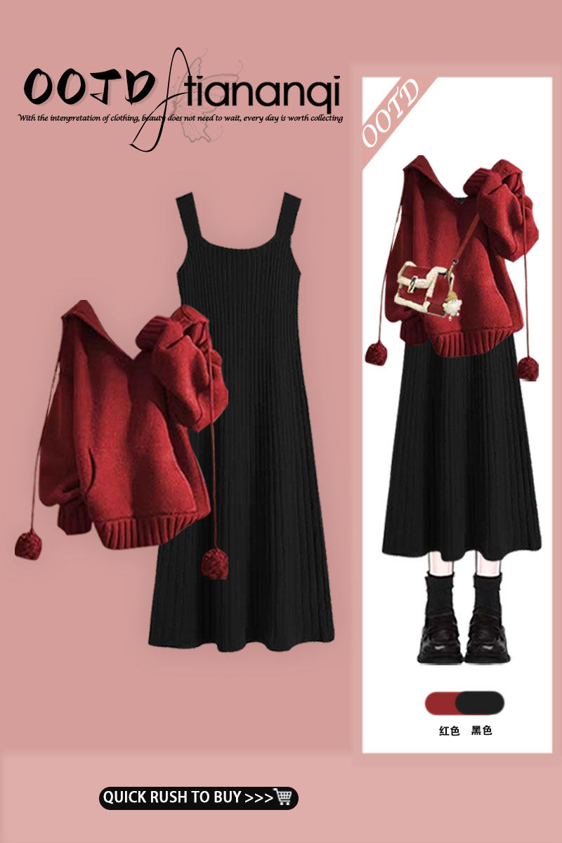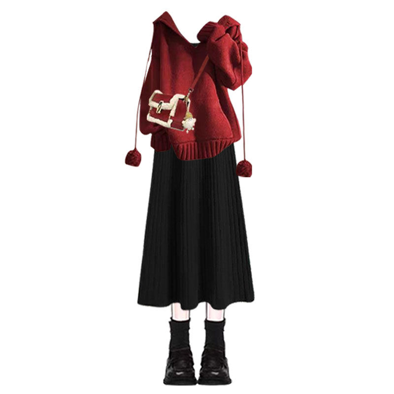 大碼秋冬套裝女聖誕紅色連帽針織衫毛衣氣質顯瘦黑色連衣裙兩件套