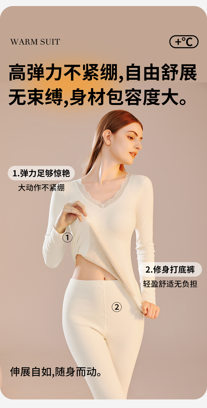 帶胸墊羊絨蠶絲保暖內衣套裝女秋冬髮熱秋衣秋褲蕾絲V領內搭打底