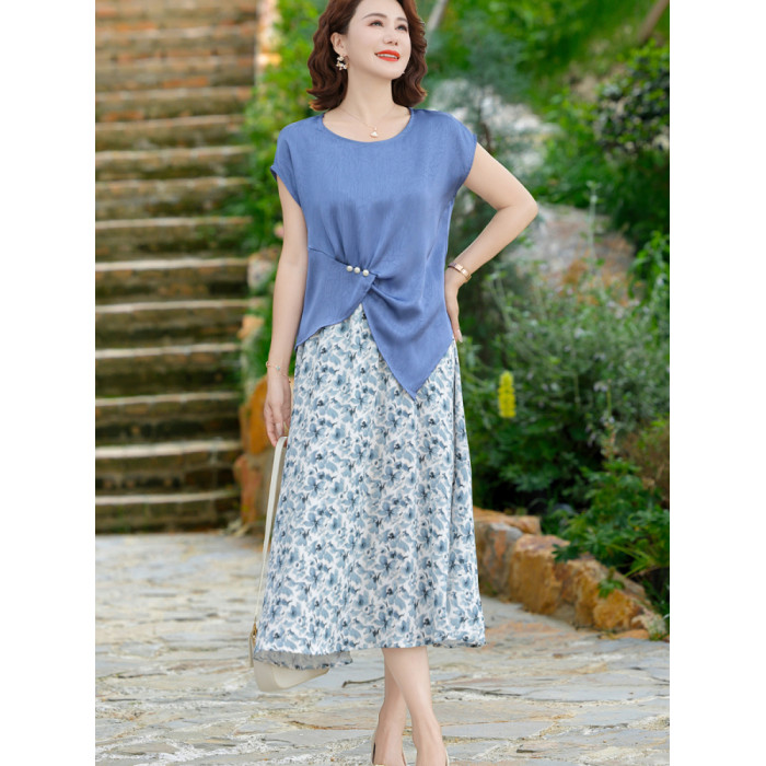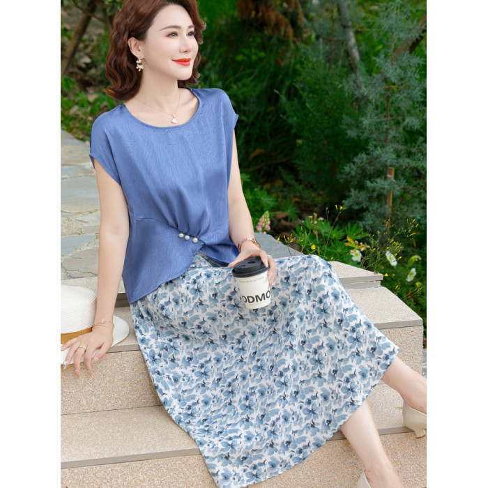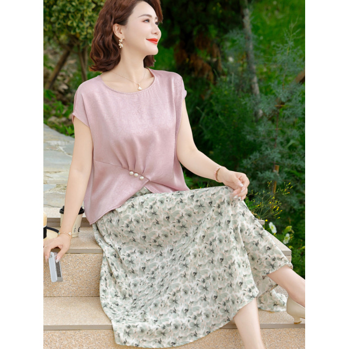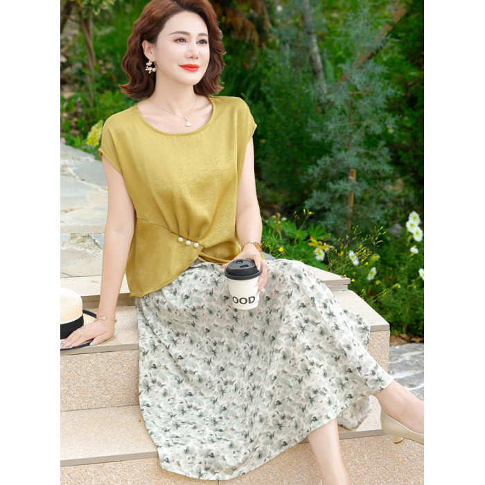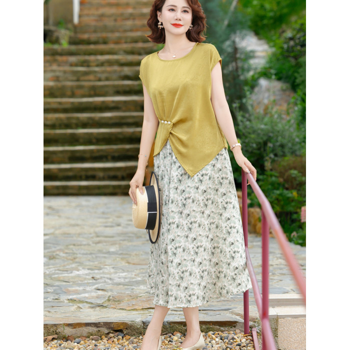 媽媽夏裝新款套裝裙中老年女裝夏季洋氣百搭連衣裙碎花裙子兩件套