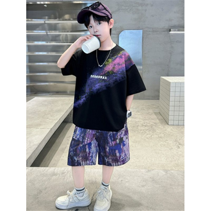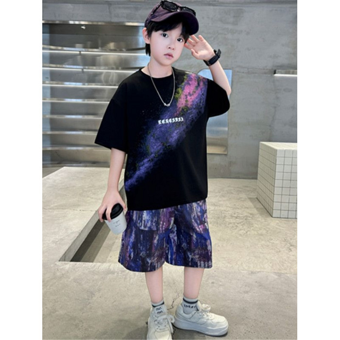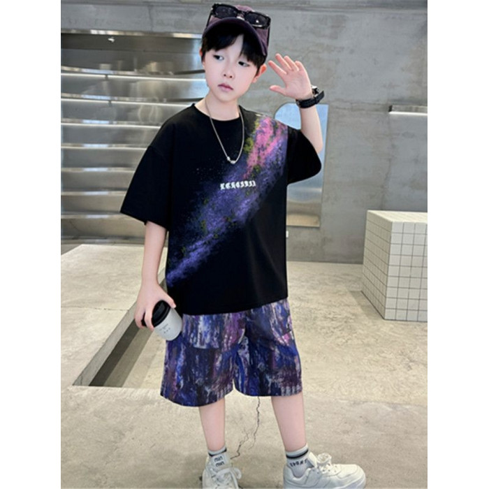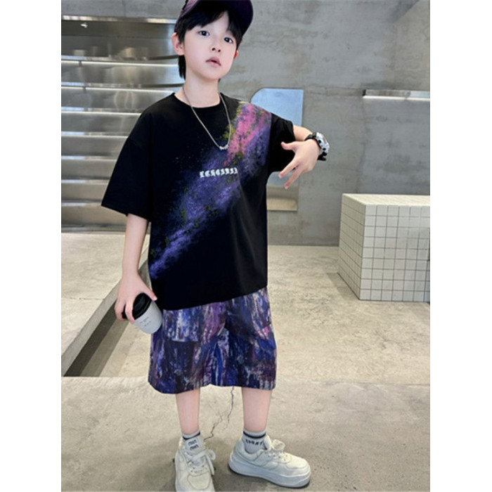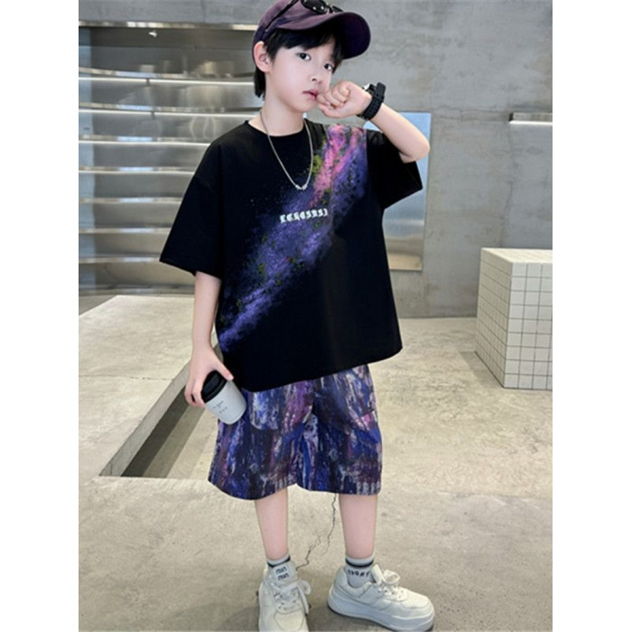 安哼安哼男童夏季套裝中大童潮酷漸變短袖T恤寬松短褲兩件套帥氣