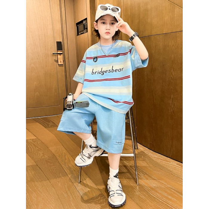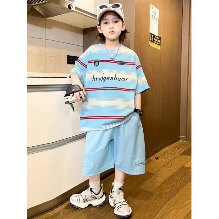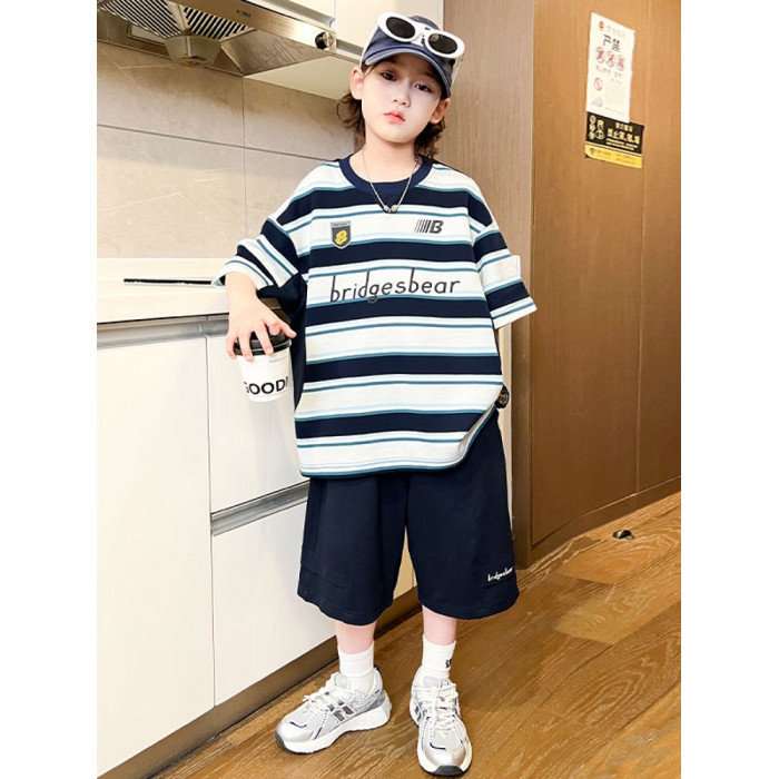 安哼安哼男童夏款套裝2025新款夏季條紋短袖中大兒童男孩夏裝兩件