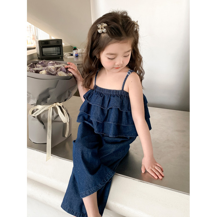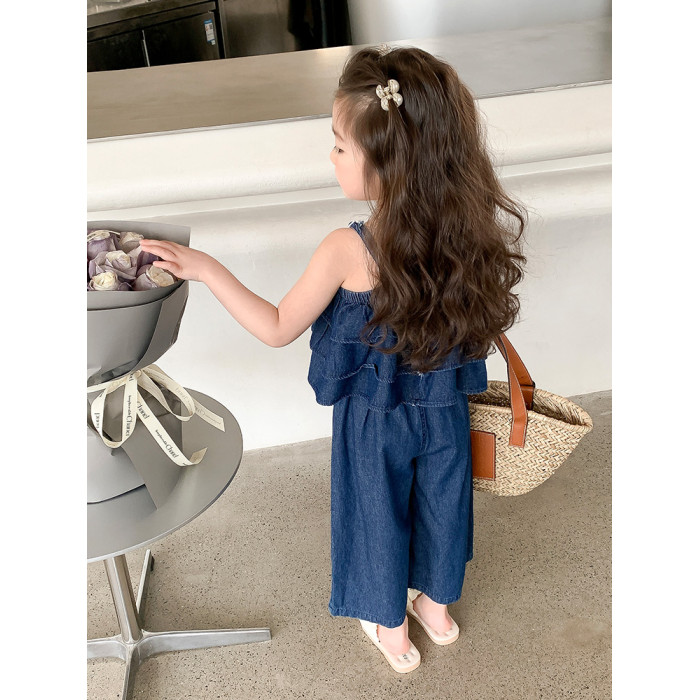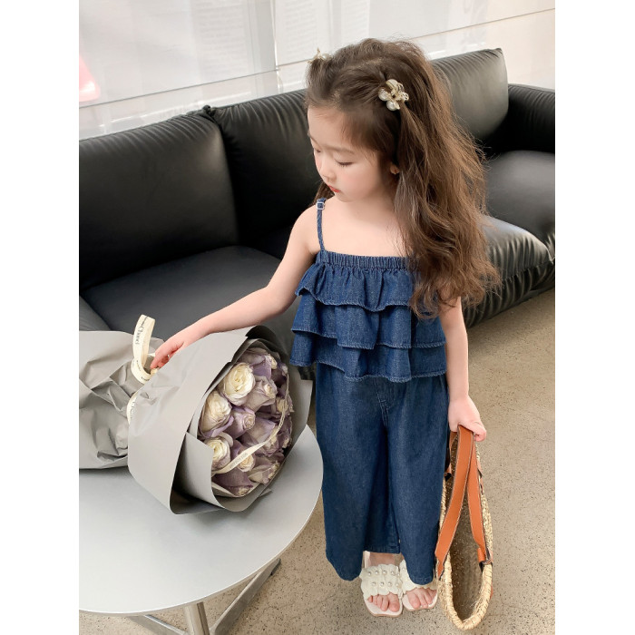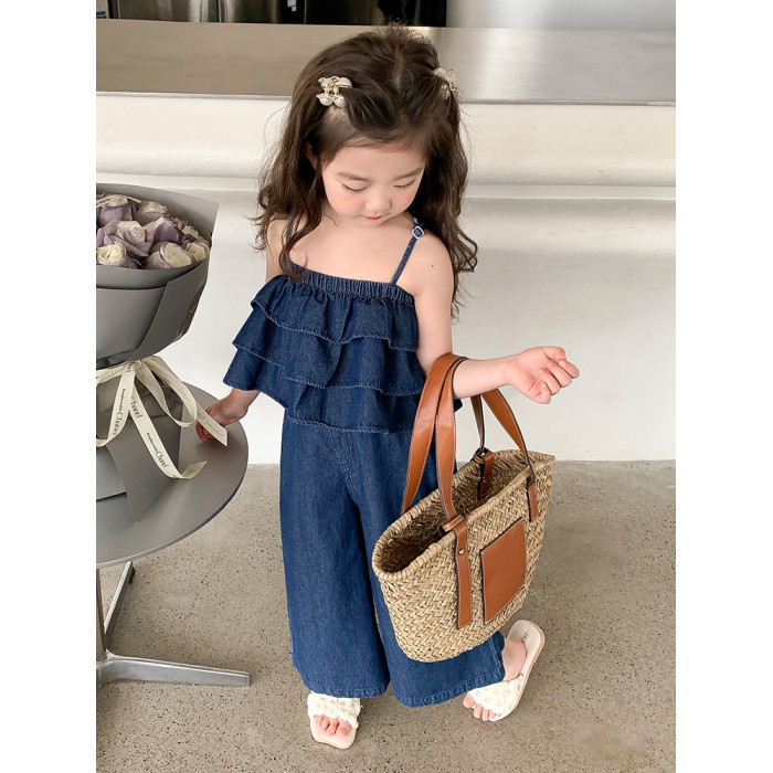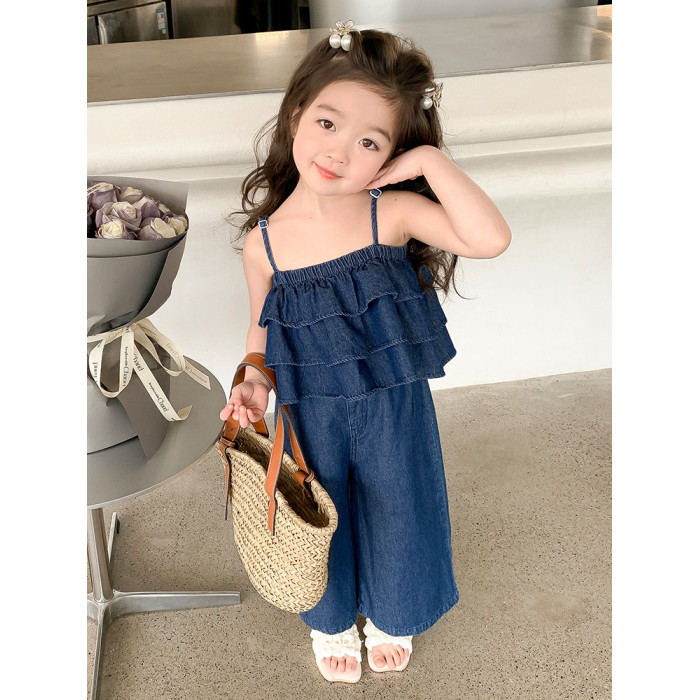 女童套裝夏季洋氣2025新款女寶寶夏裝時髦夏吊帶濶腿褲牛仔兒童裝