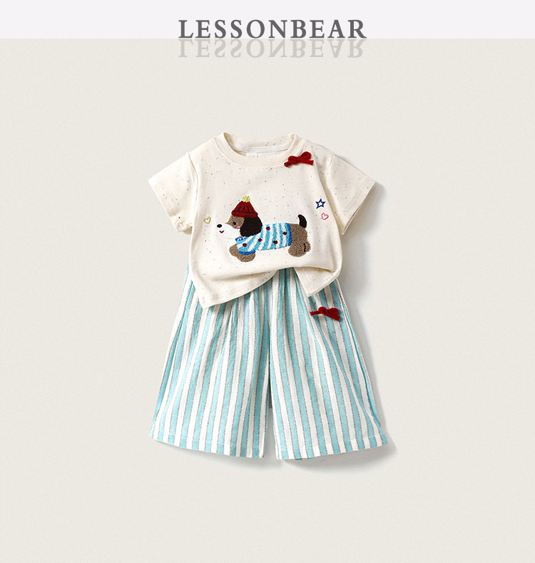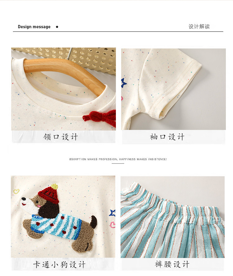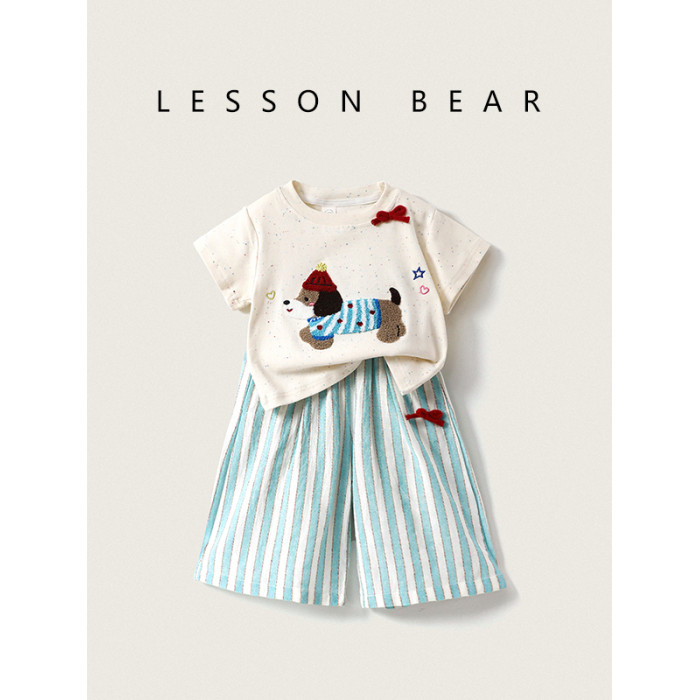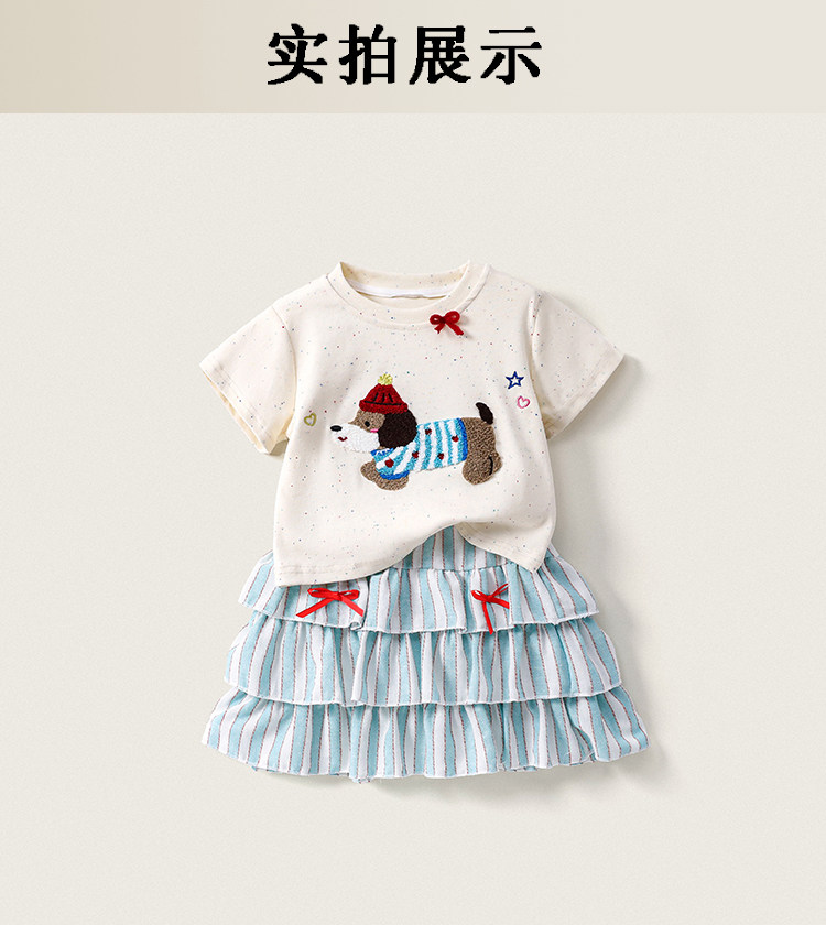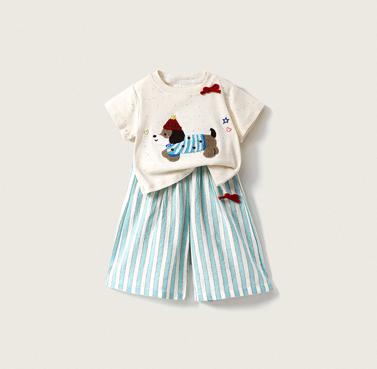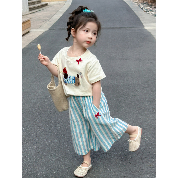 女童夏季套裝2025新款T恤卡通臘腸狗兒童條紋濶腿褲女寶裙子套裝