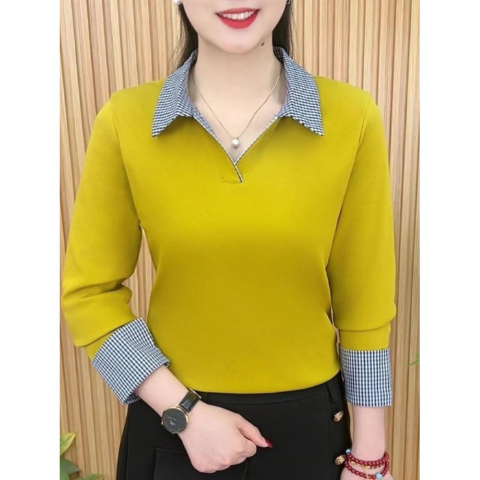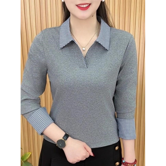 2026春季新款繙領長袖拼色格子襯衫洋氣媽媽裝T恤百搭打底上衣女