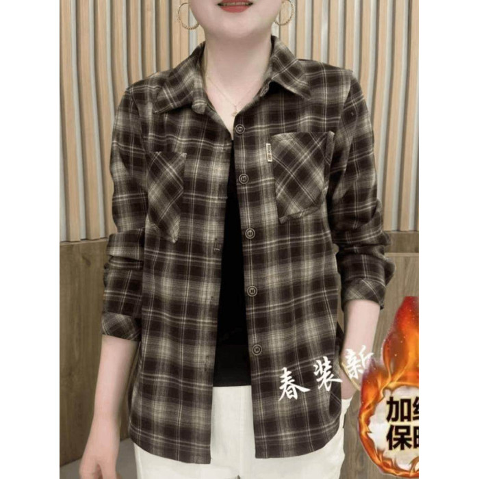 媽媽裝格子襯衫女2025春秋款中老年女裝洋氣打底衫繙領長袖上衣