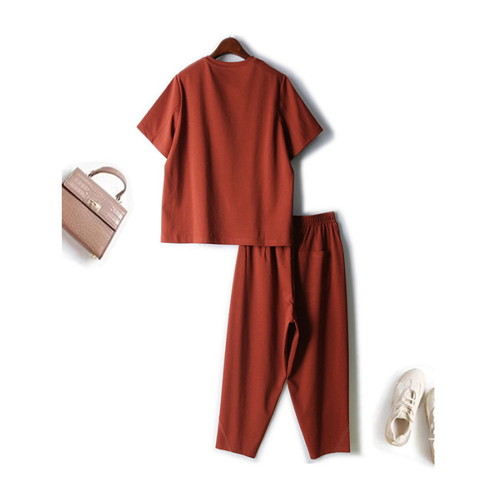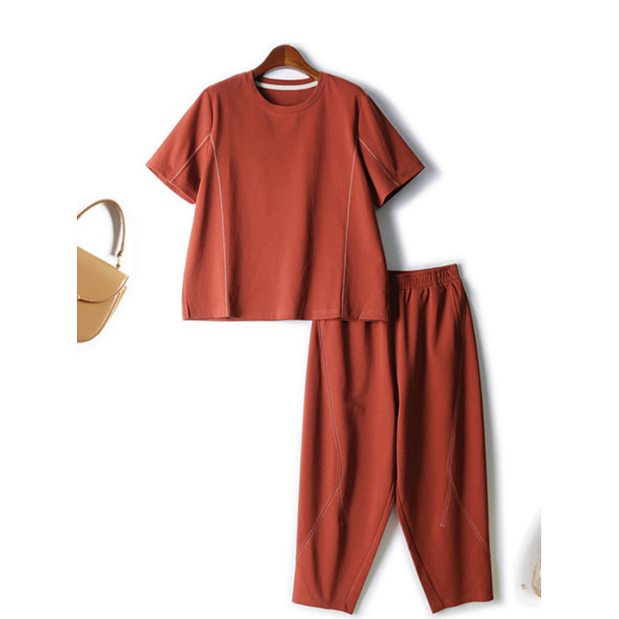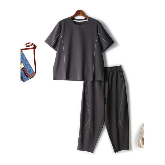 休閒運動套裝明線設計親膚舒適短袖T恤配九分褲顯瘦兩件套女裝夏