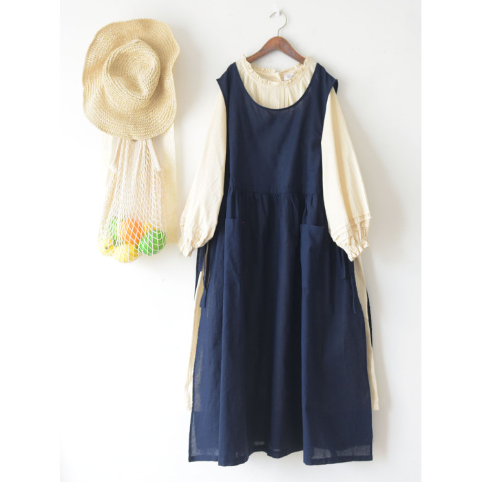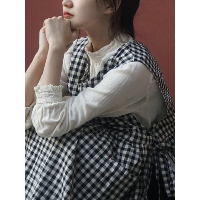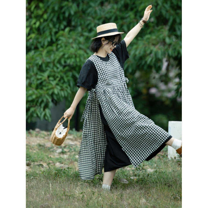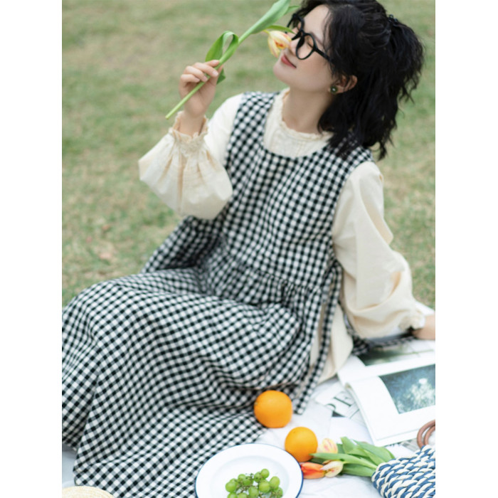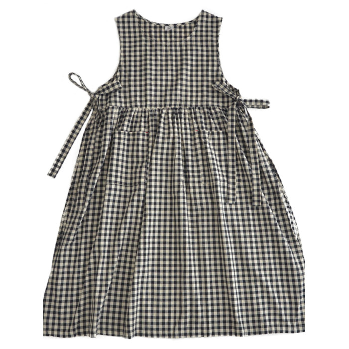 那圖蘭森系曡穿背心裙長裙大擺裙格子純棉罩裙522系帶A字連衣裙