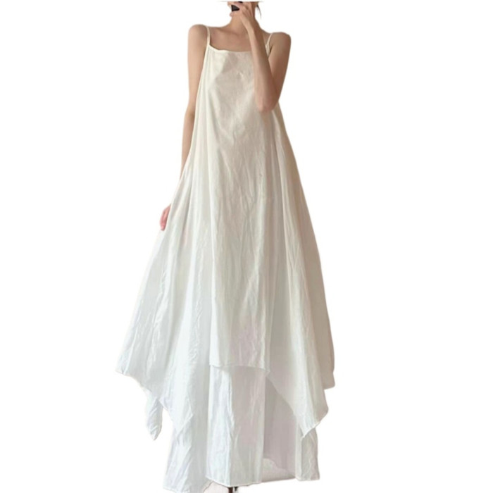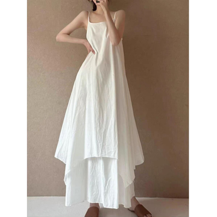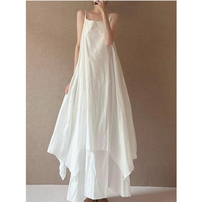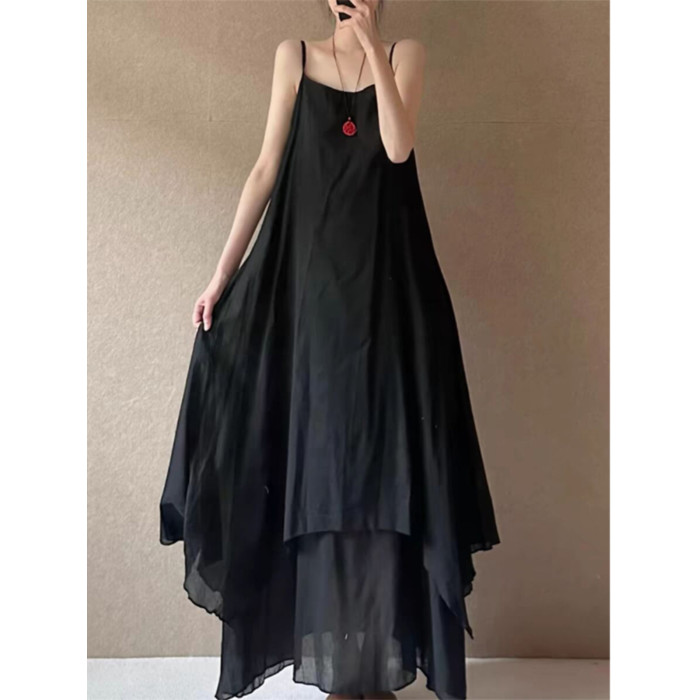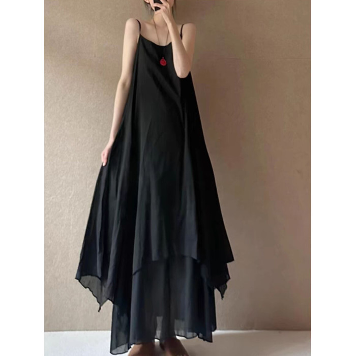 法式設計感雙層大擺吊帶裙女夏季高級感不規則下擺飄逸無袖連衣裙