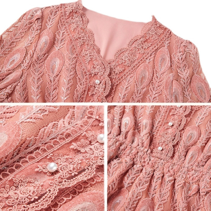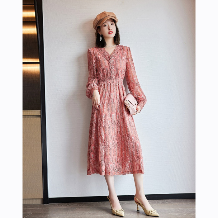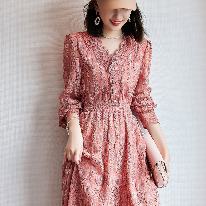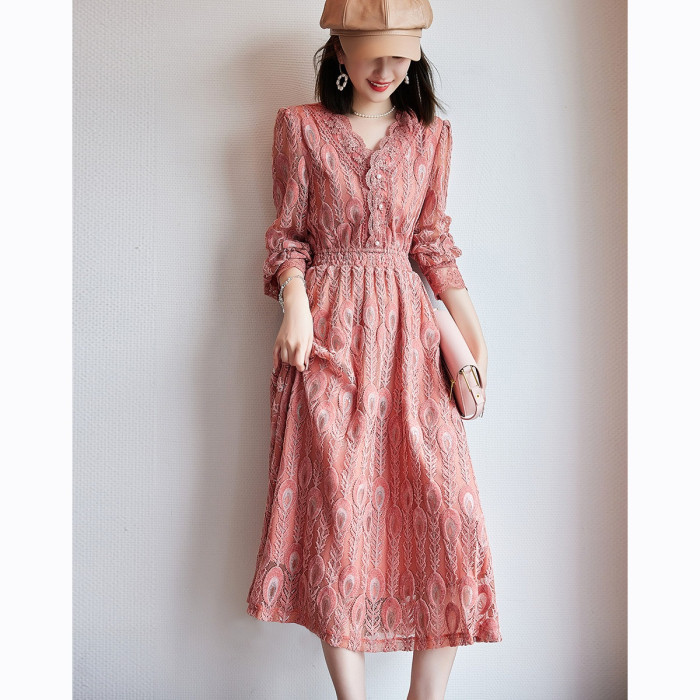 特價原單法式蕾絲連衣裙女春秋新款高級感刺綉V領長袖設計感A字裙