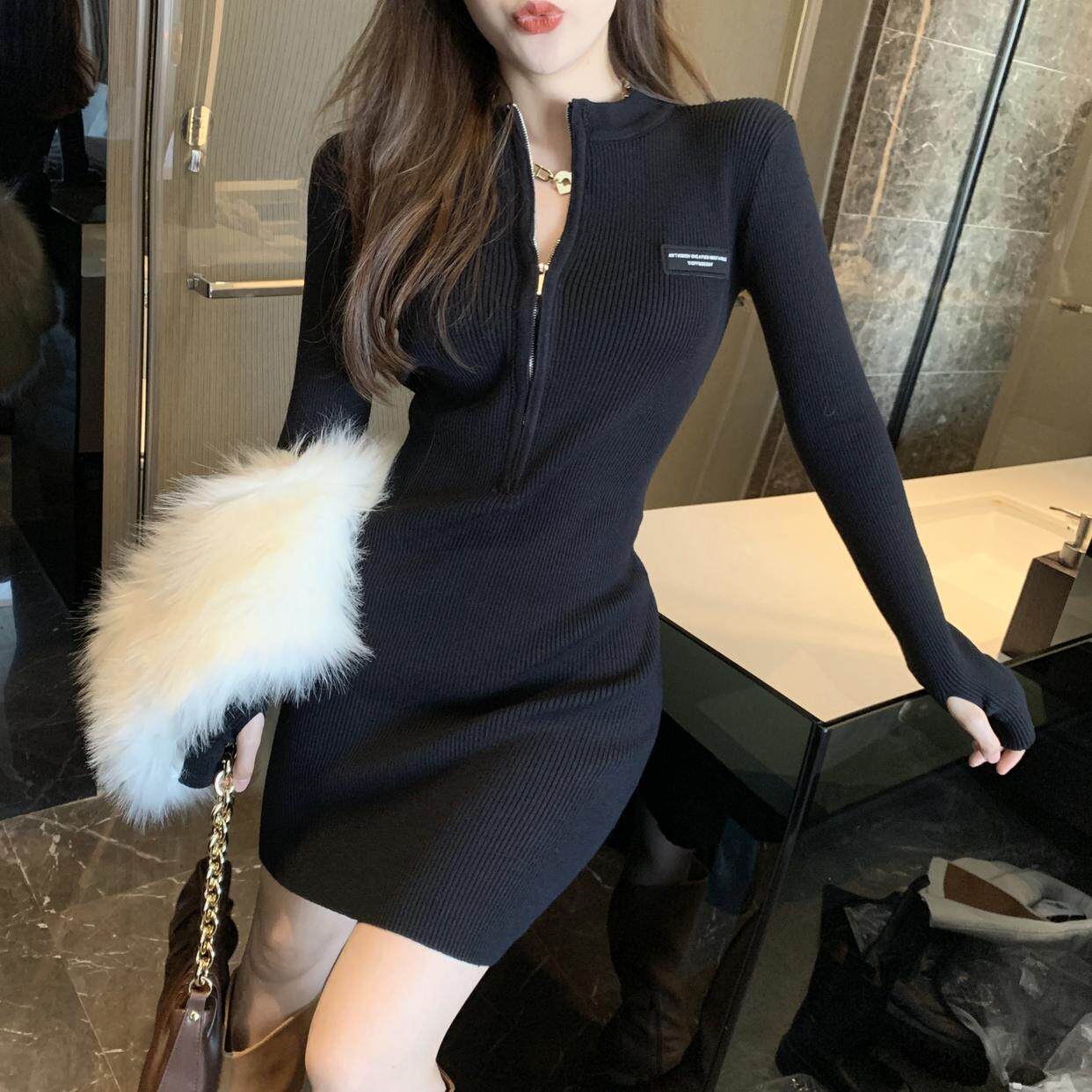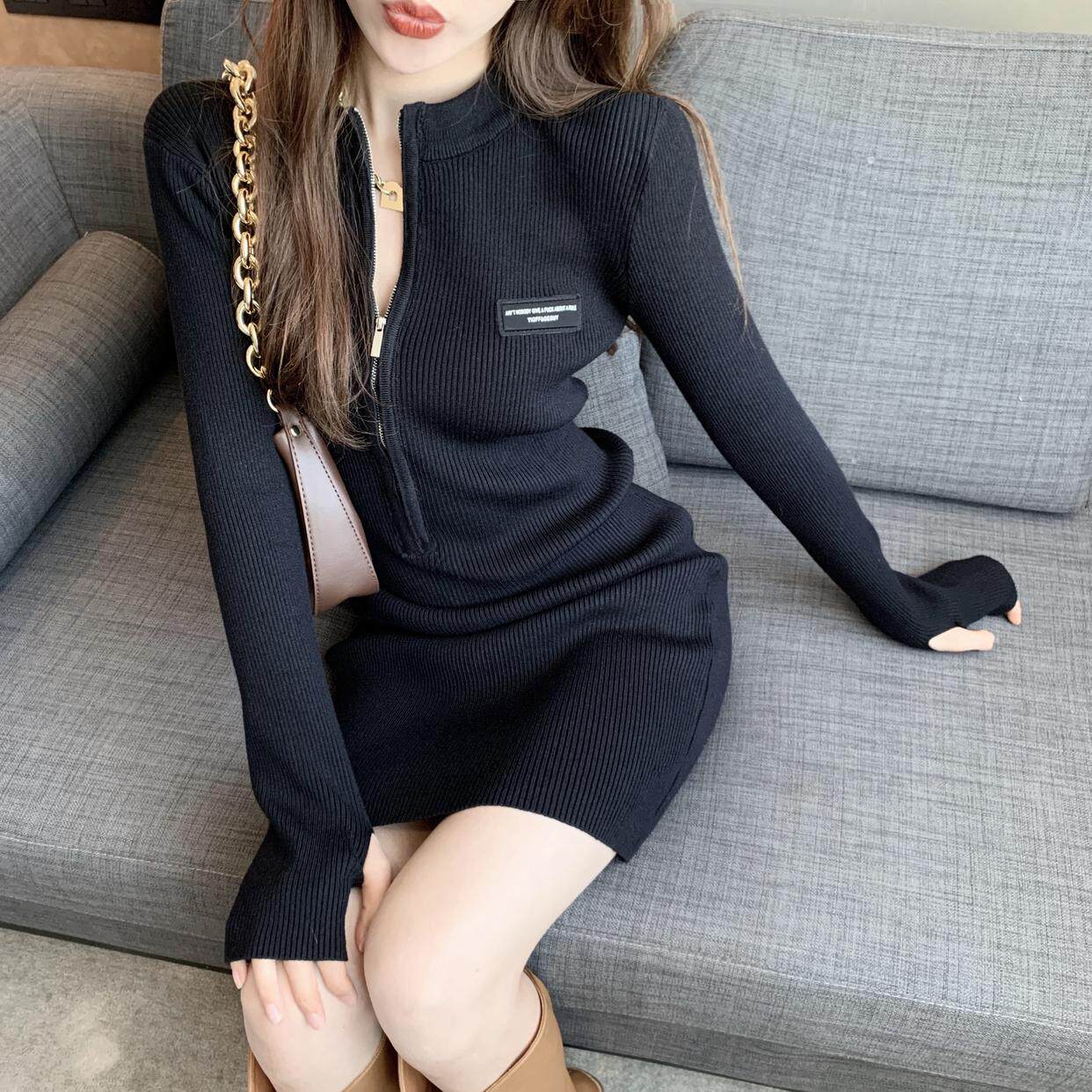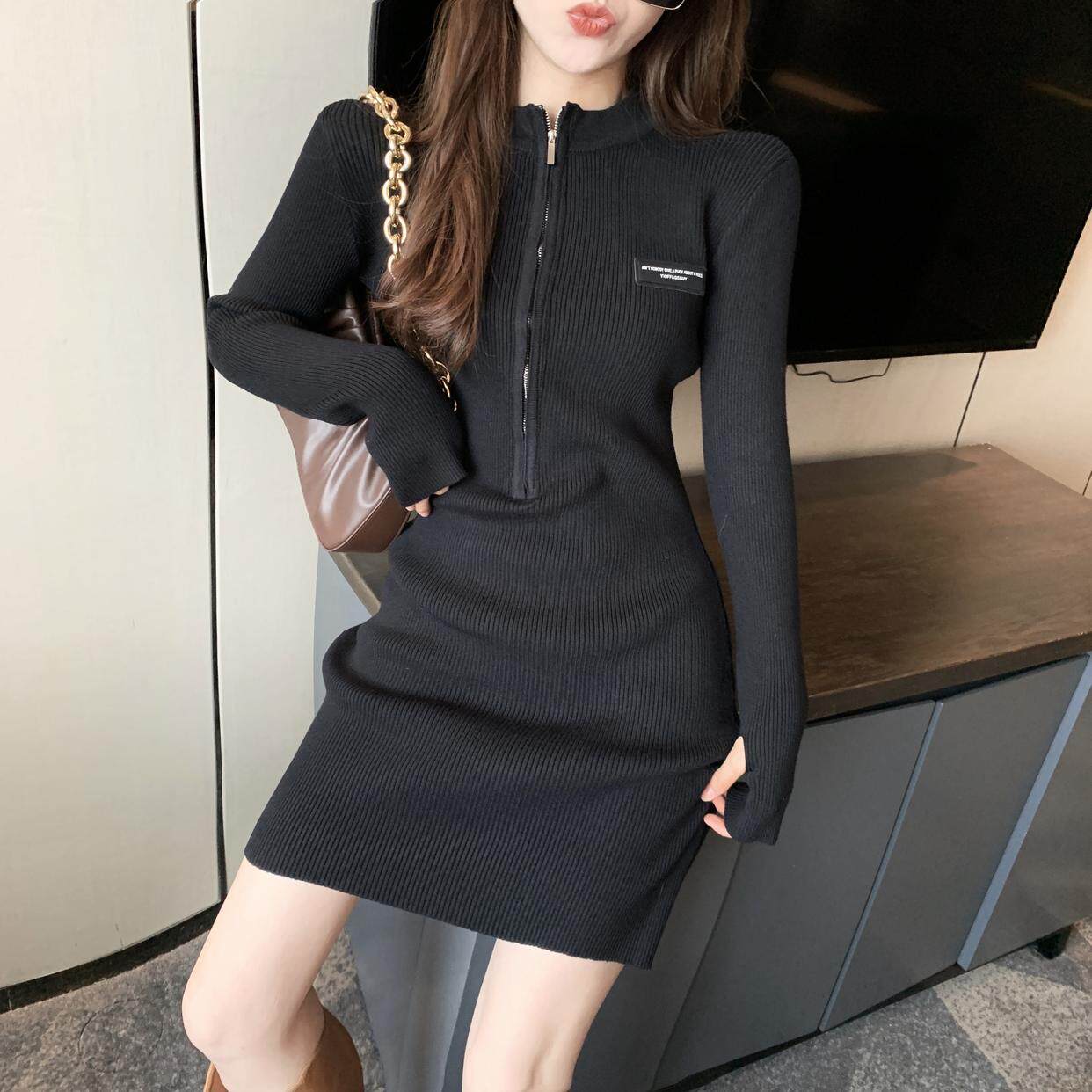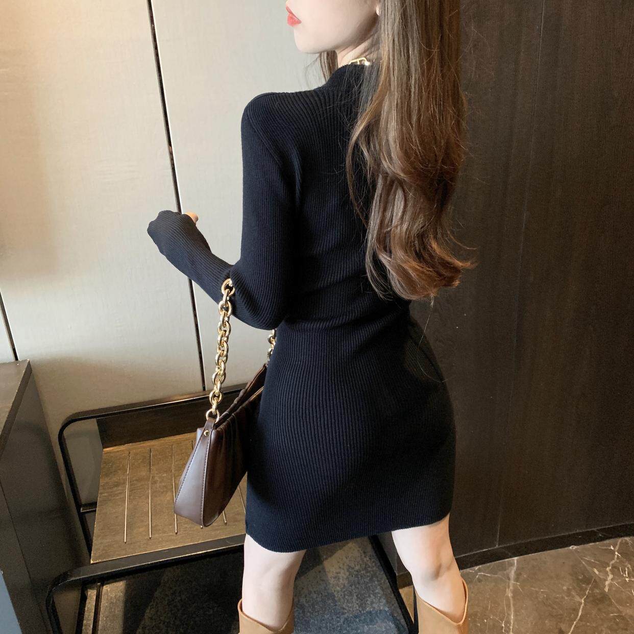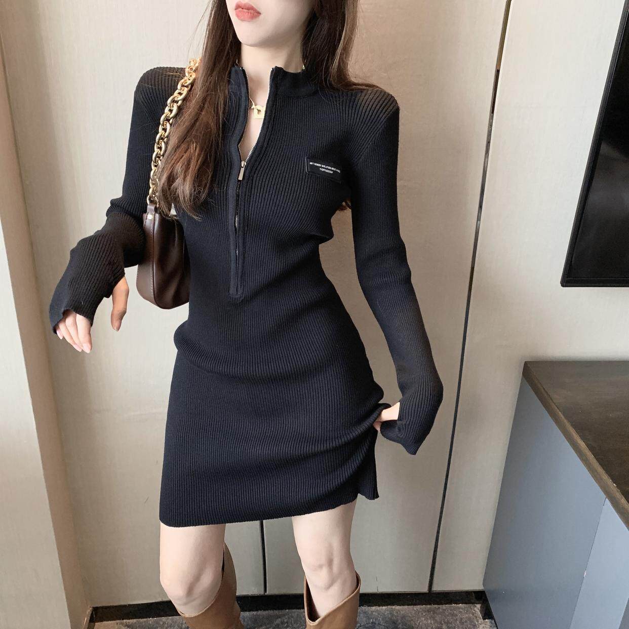 秋冬禦姐高級感純欲風黑色包臀裙子收腰修身內搭針織打底連衣裙女