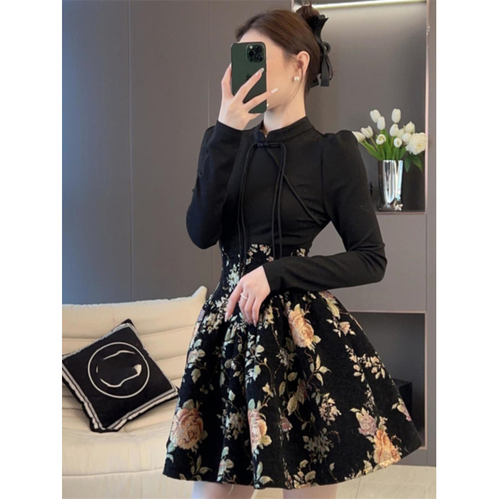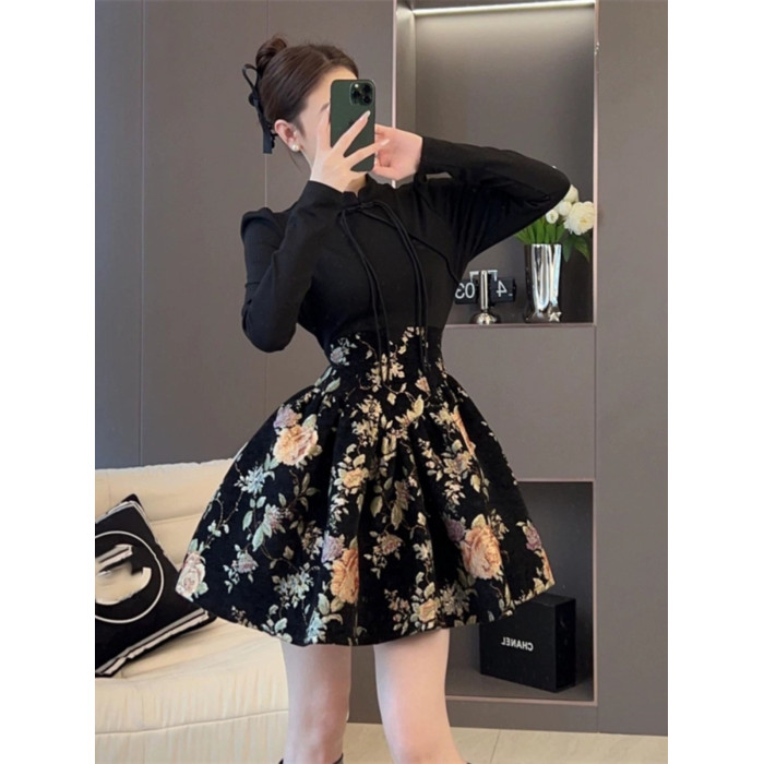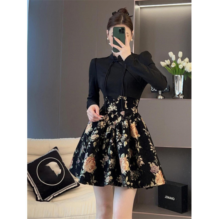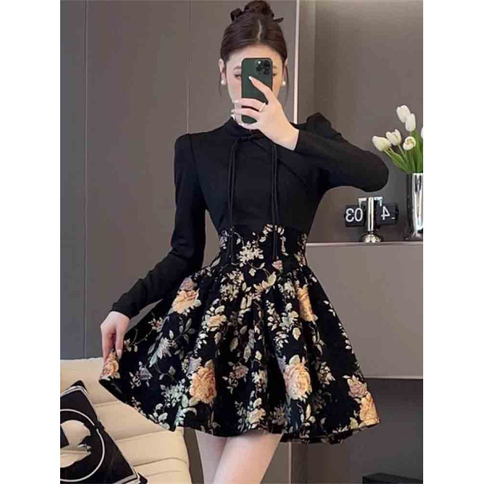 春秋季新品法式赫本風拼色復古連衣裙秋小衆收腰假兩件短裙拼接裙