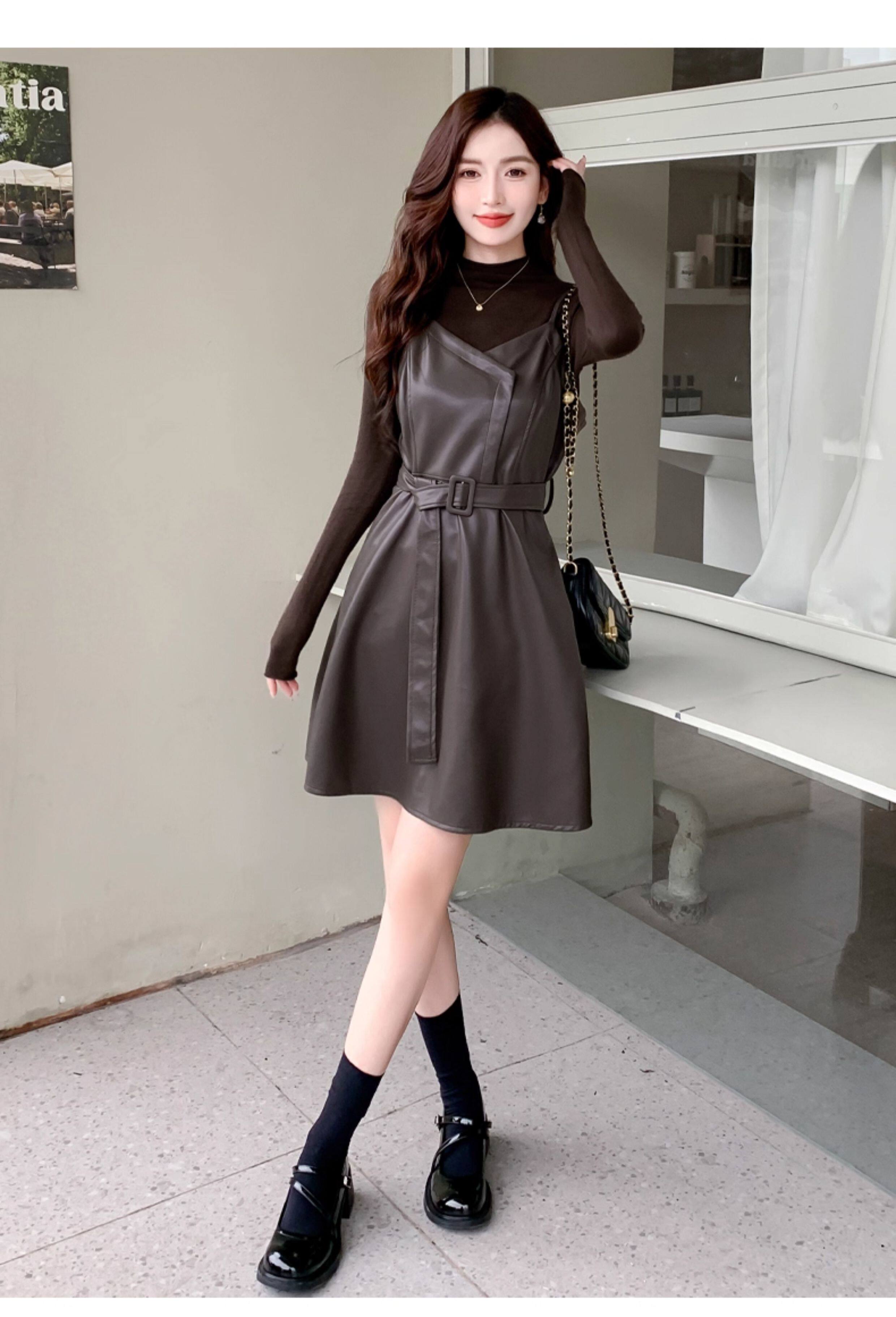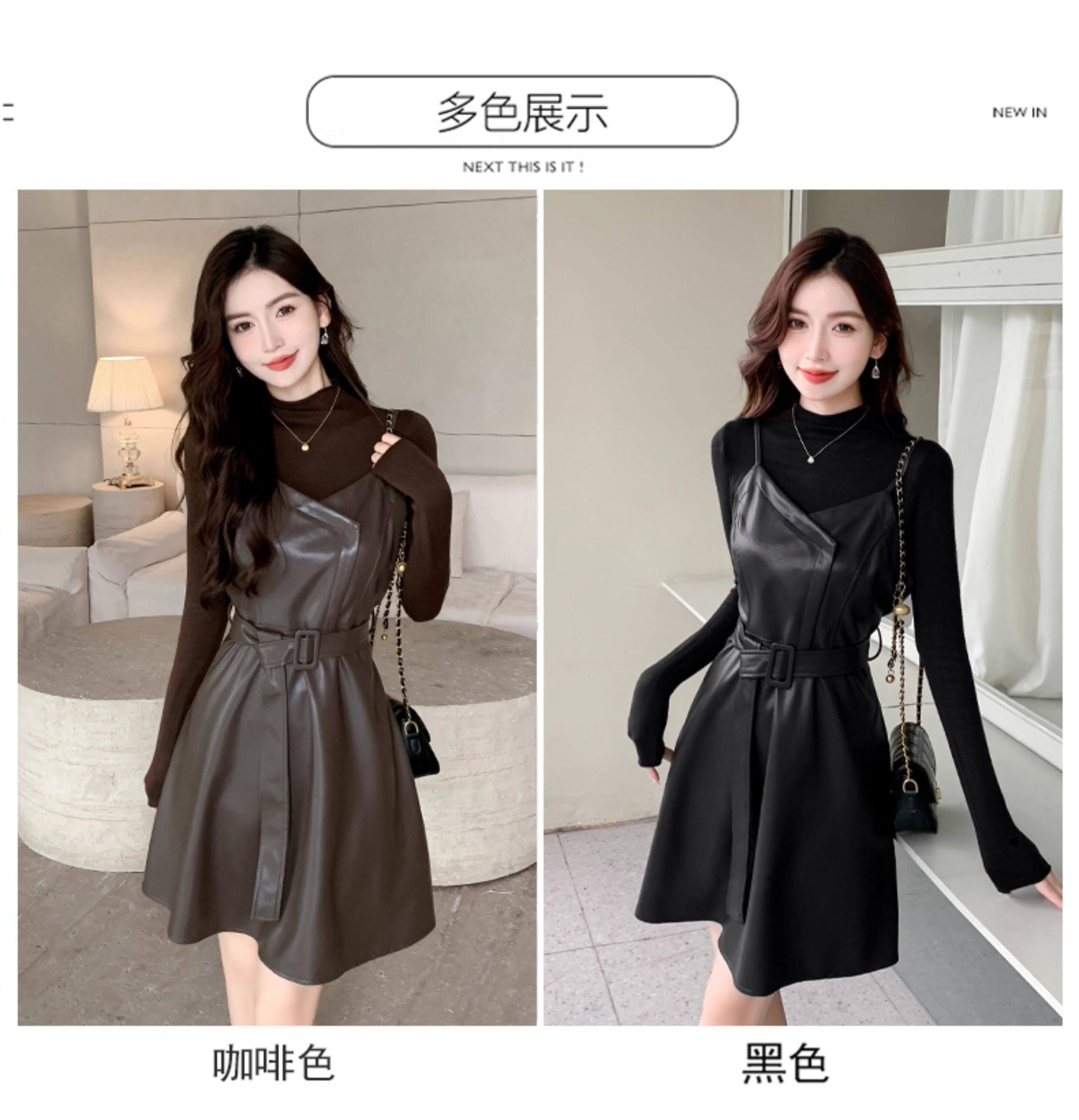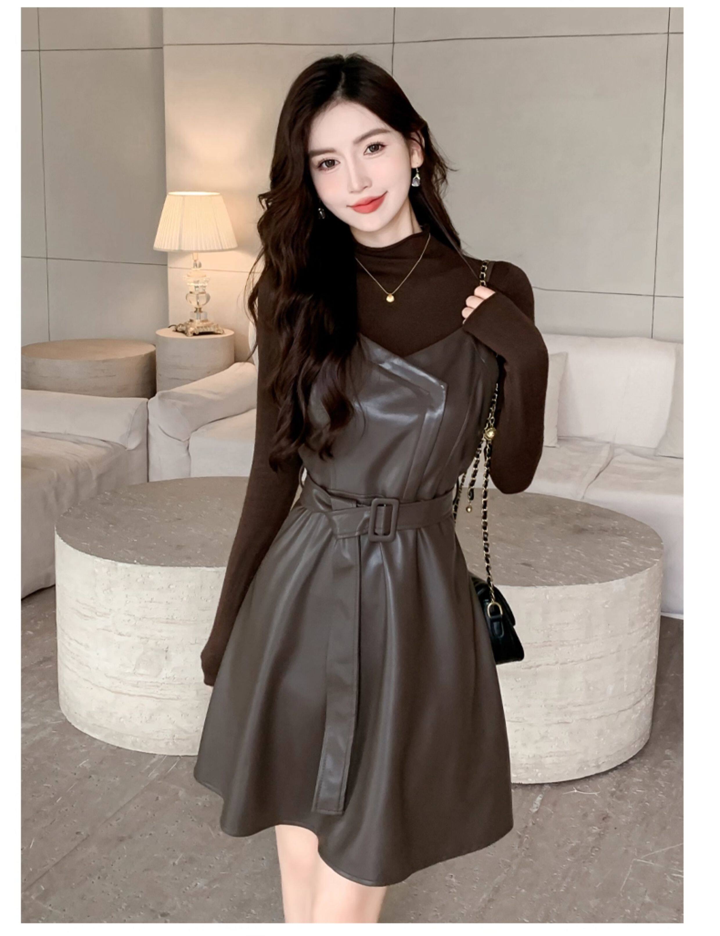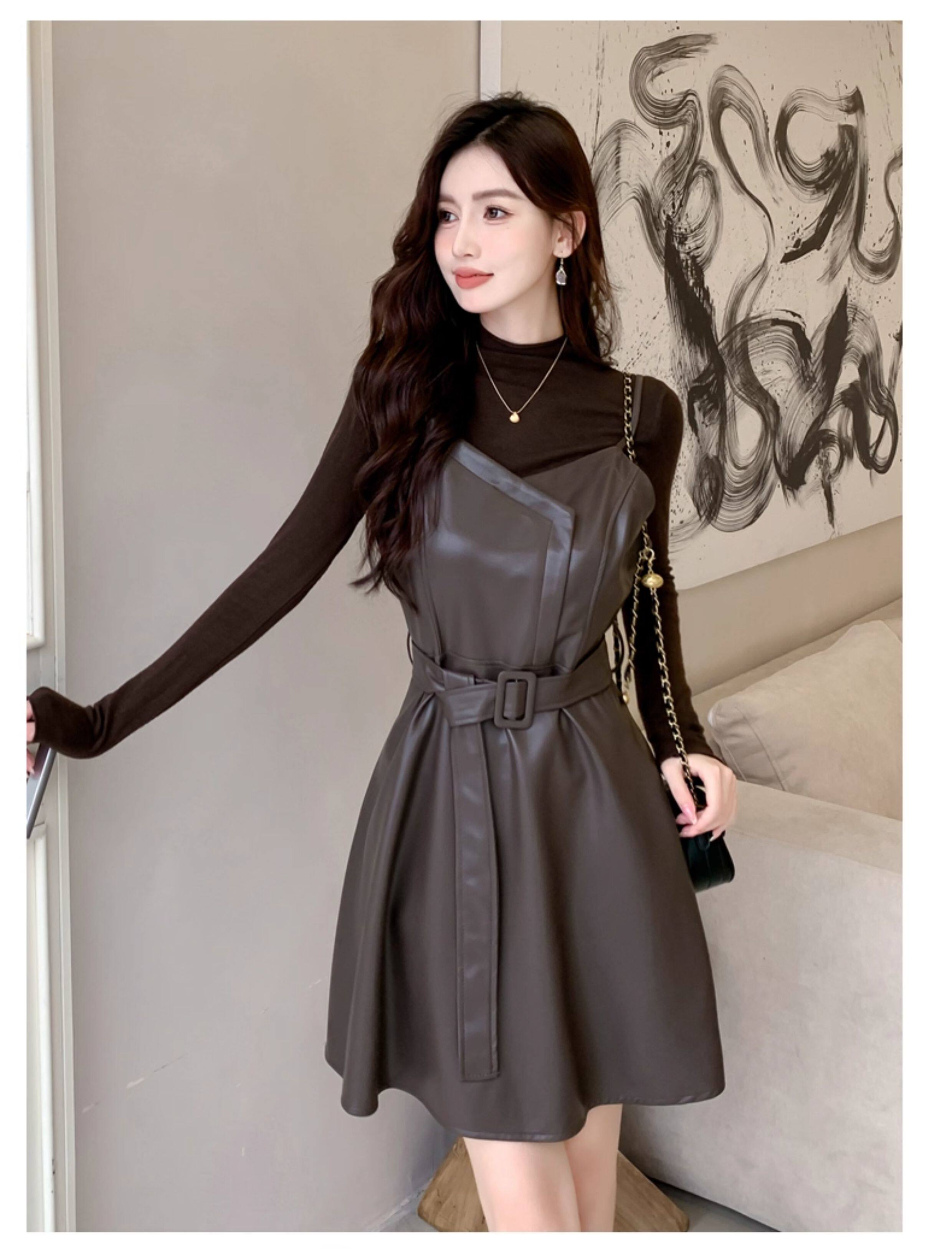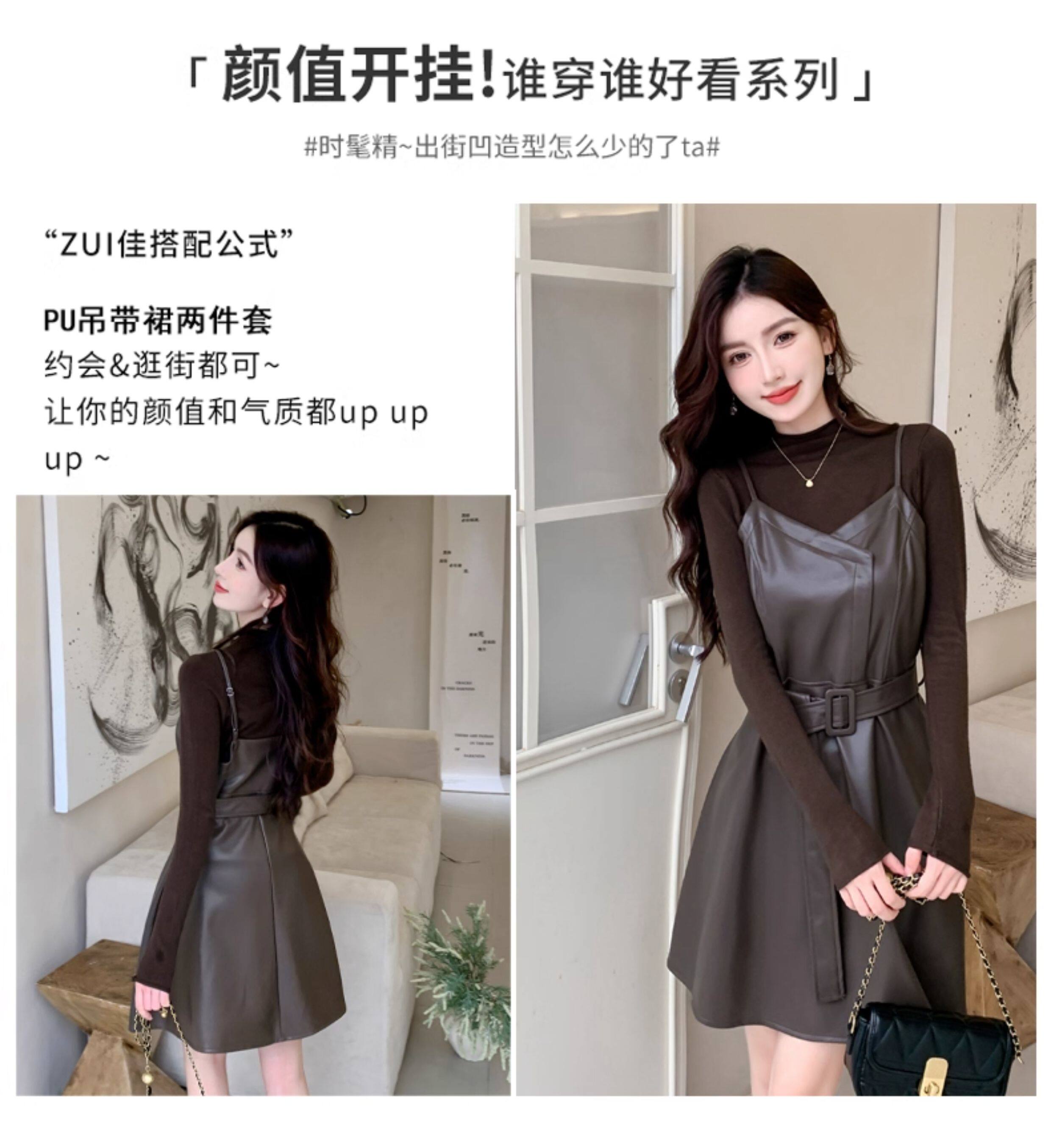 pu皮兩件套連衣裙子秋冬季新款2025女士長袖收腰顯瘦小個子時尚春