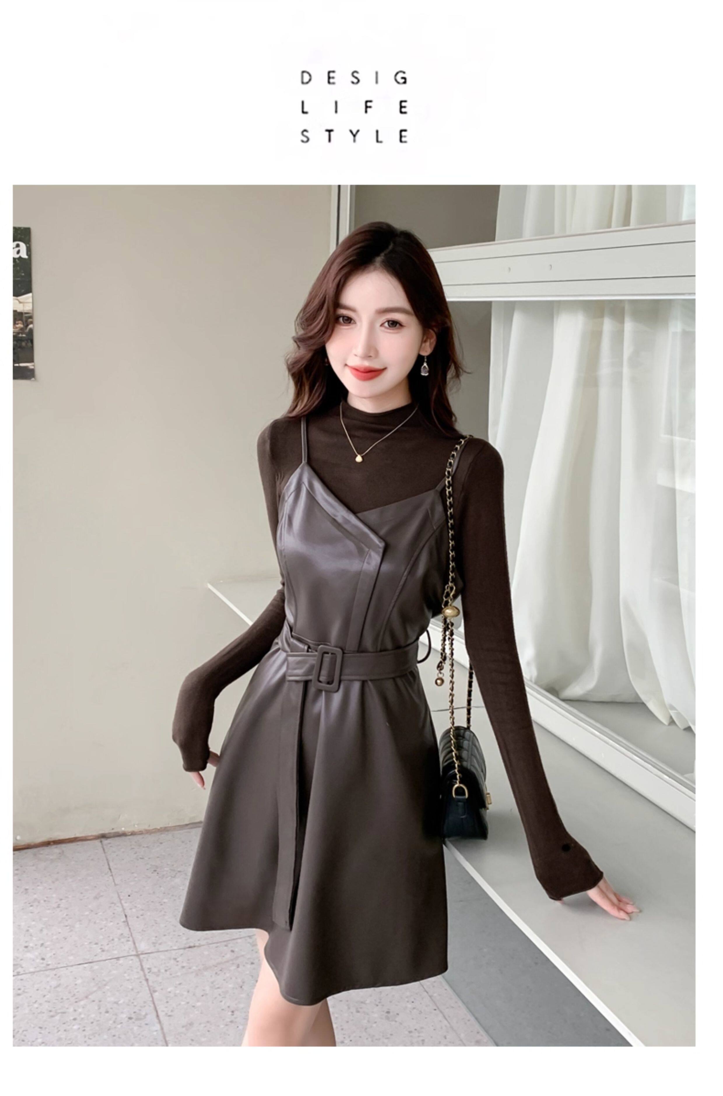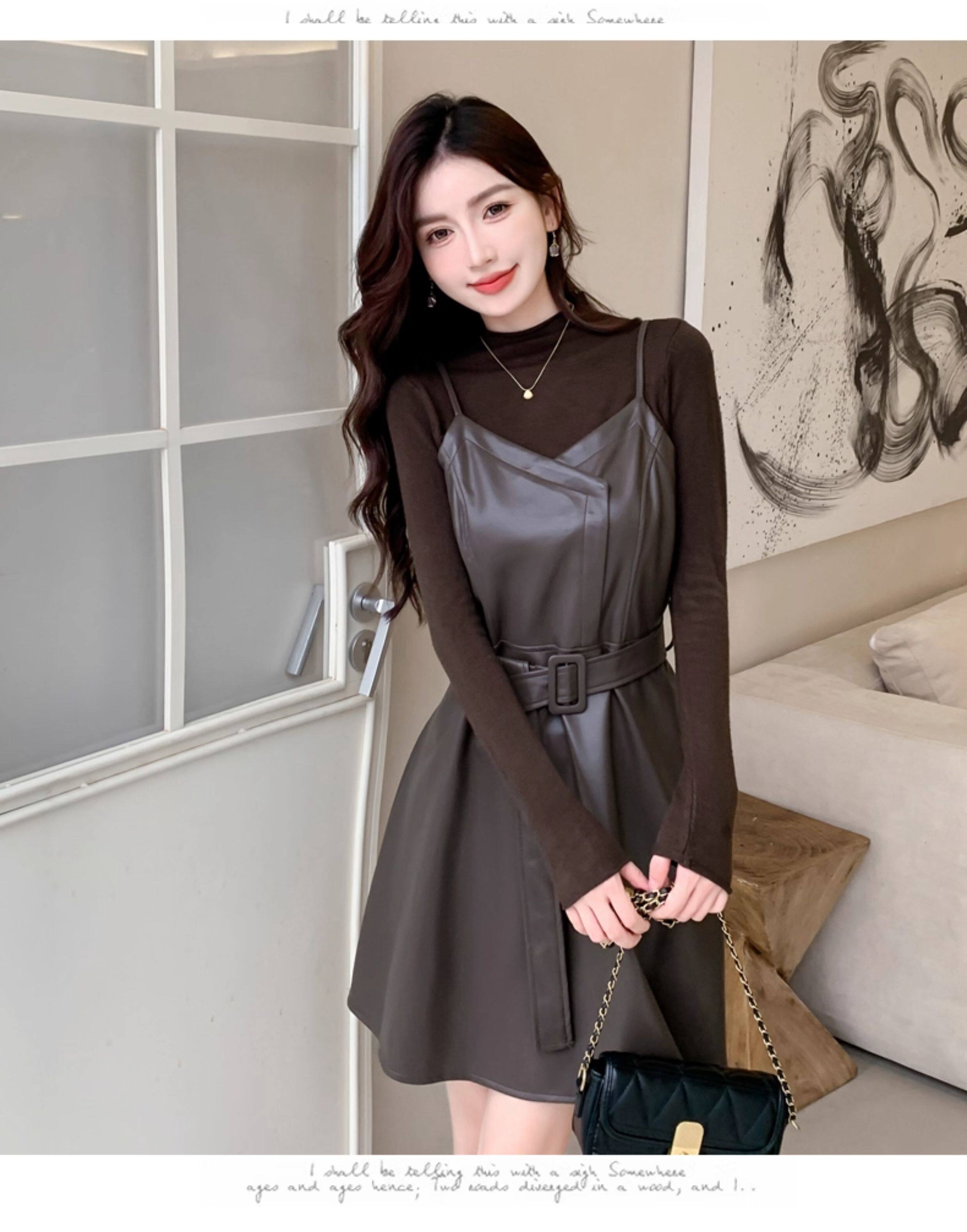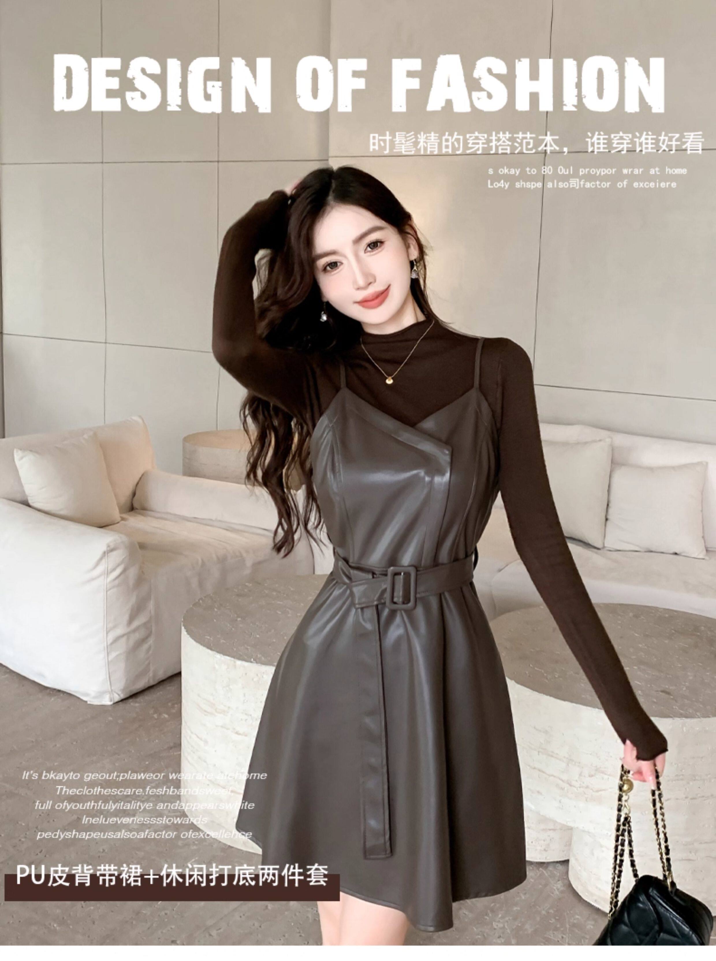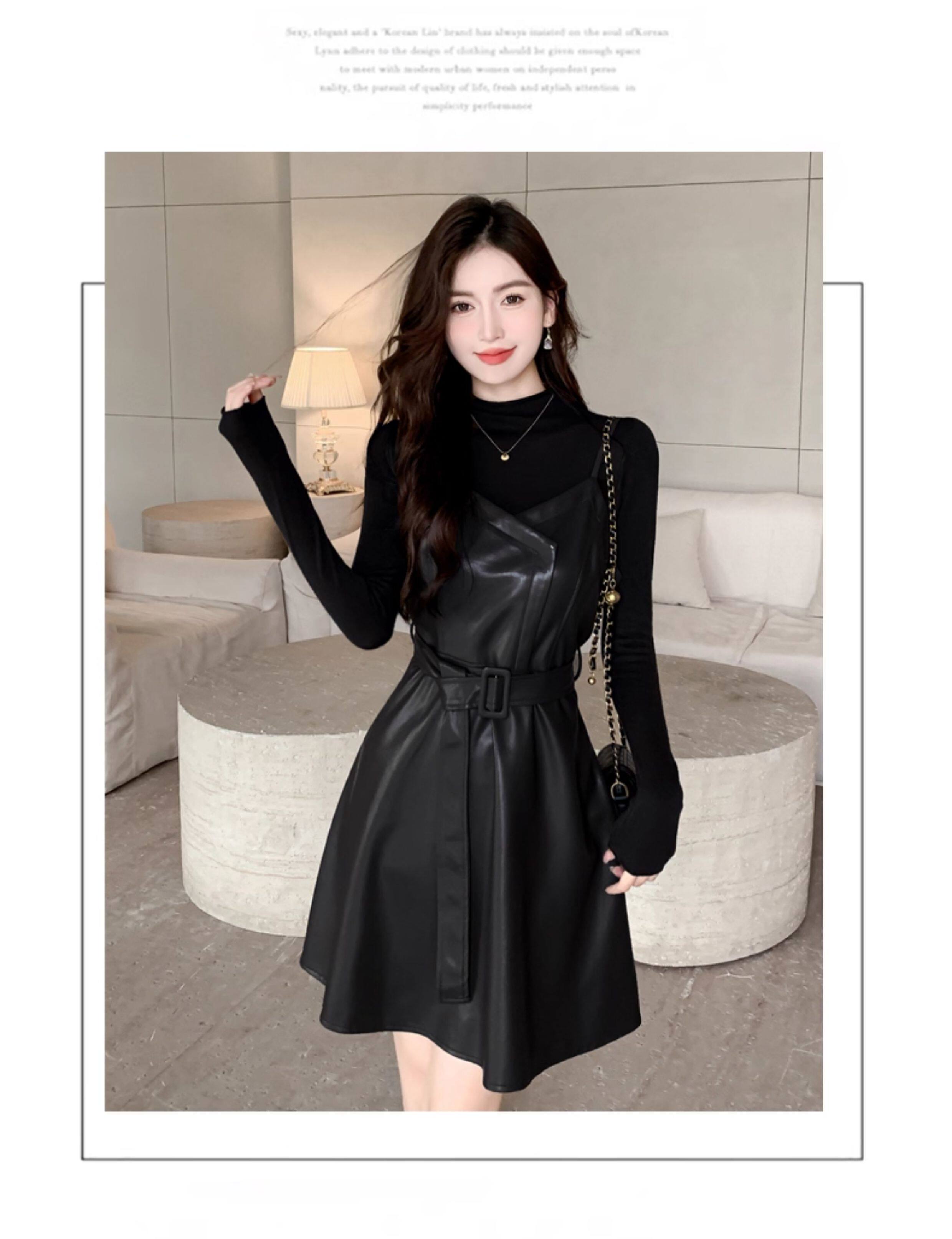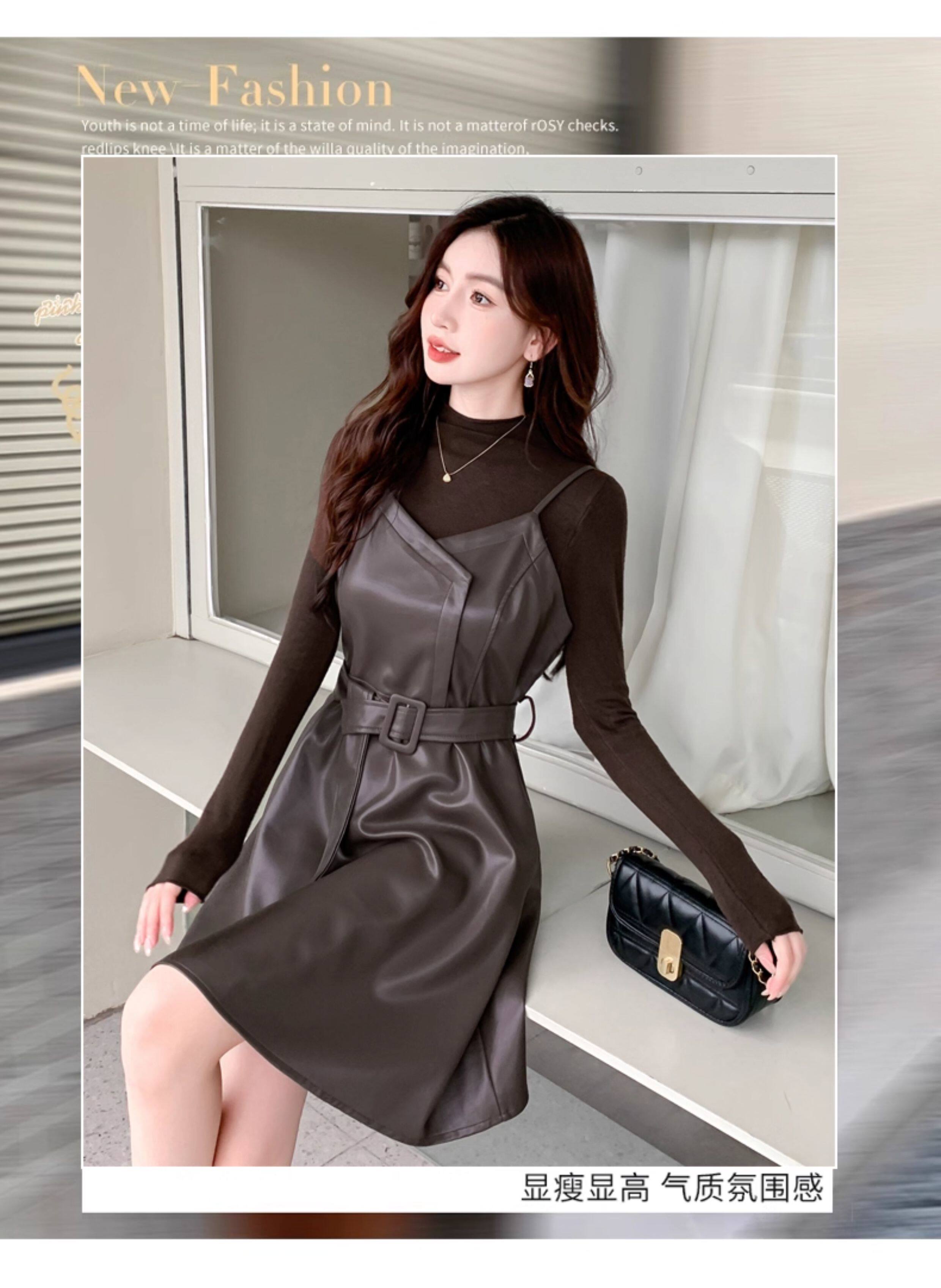 pu皮兩件套連衣裙子秋冬季新款2025女士長袖收腰顯瘦小個子時尚春