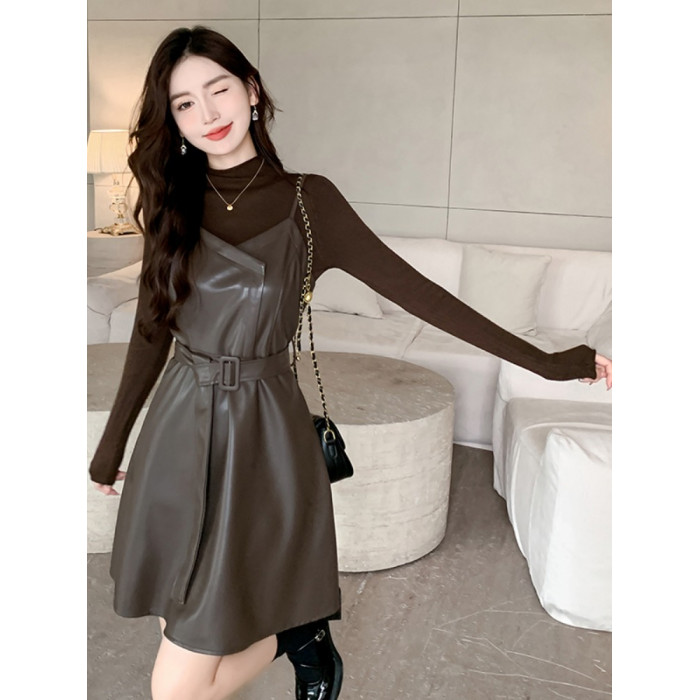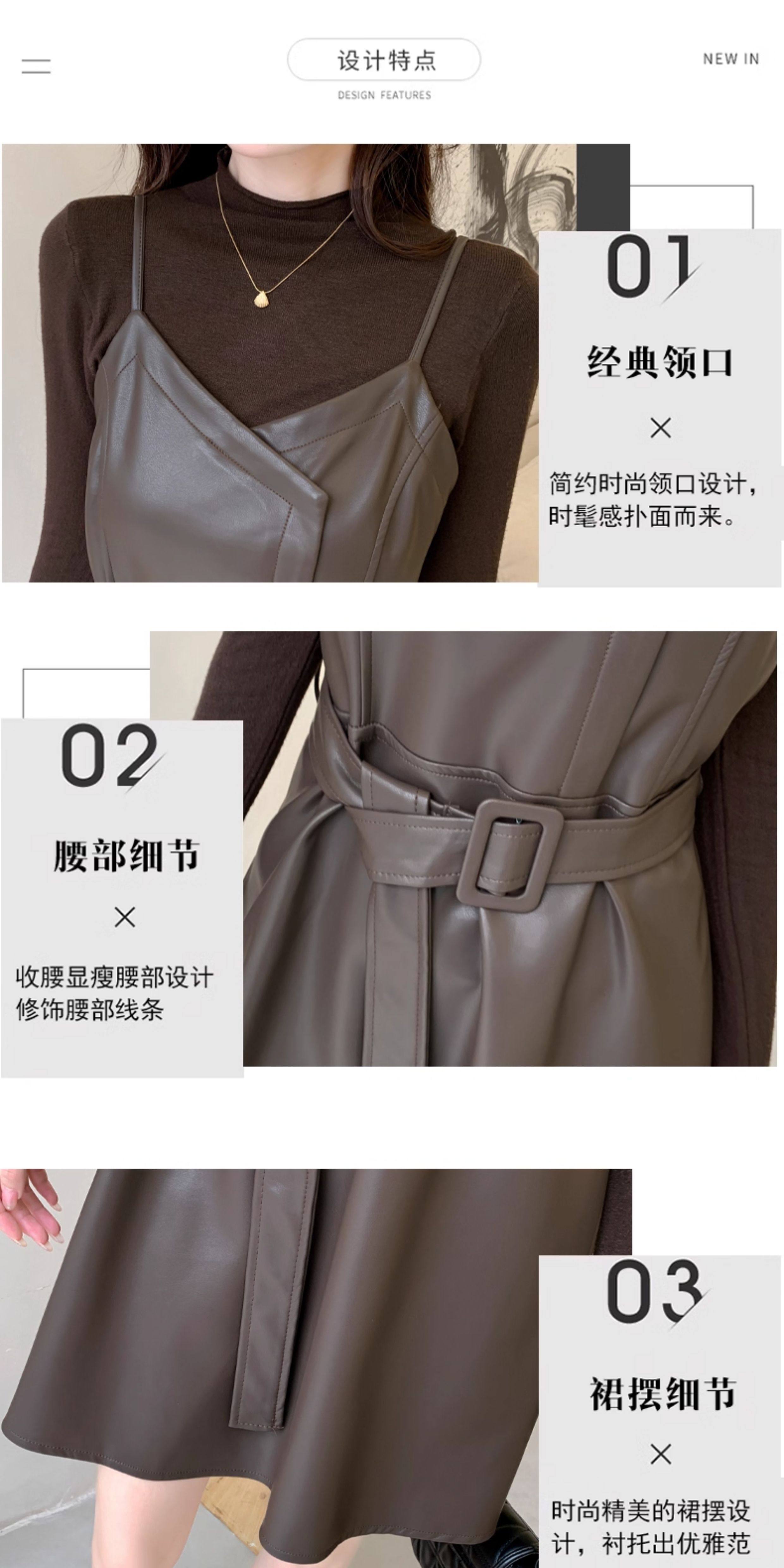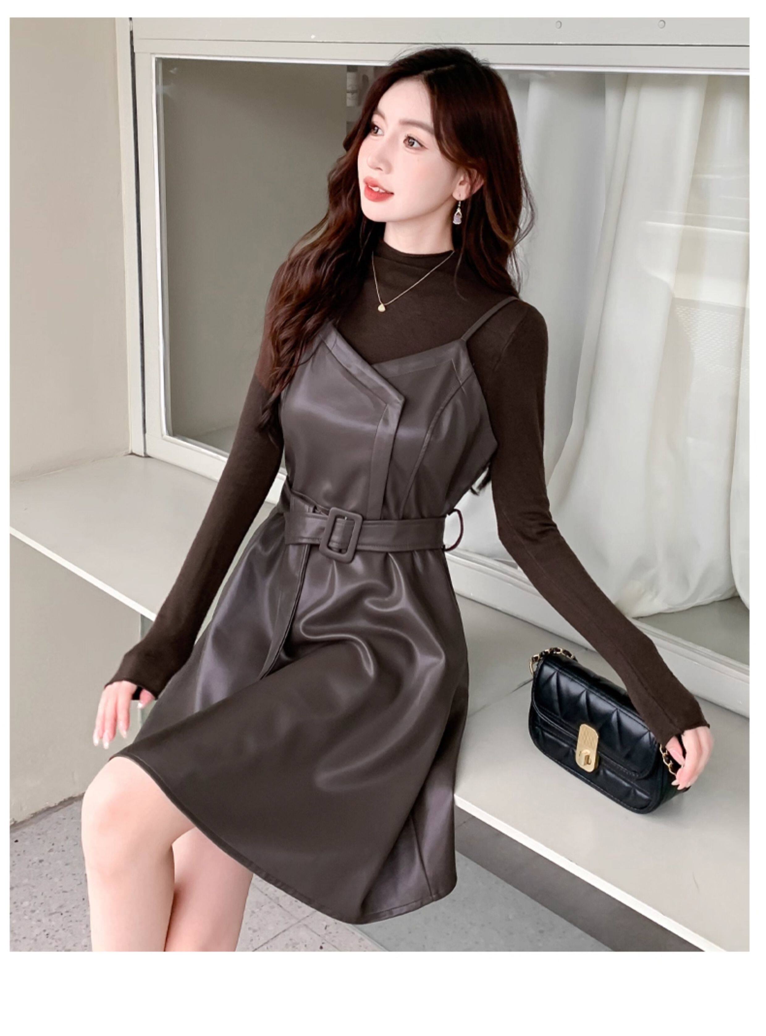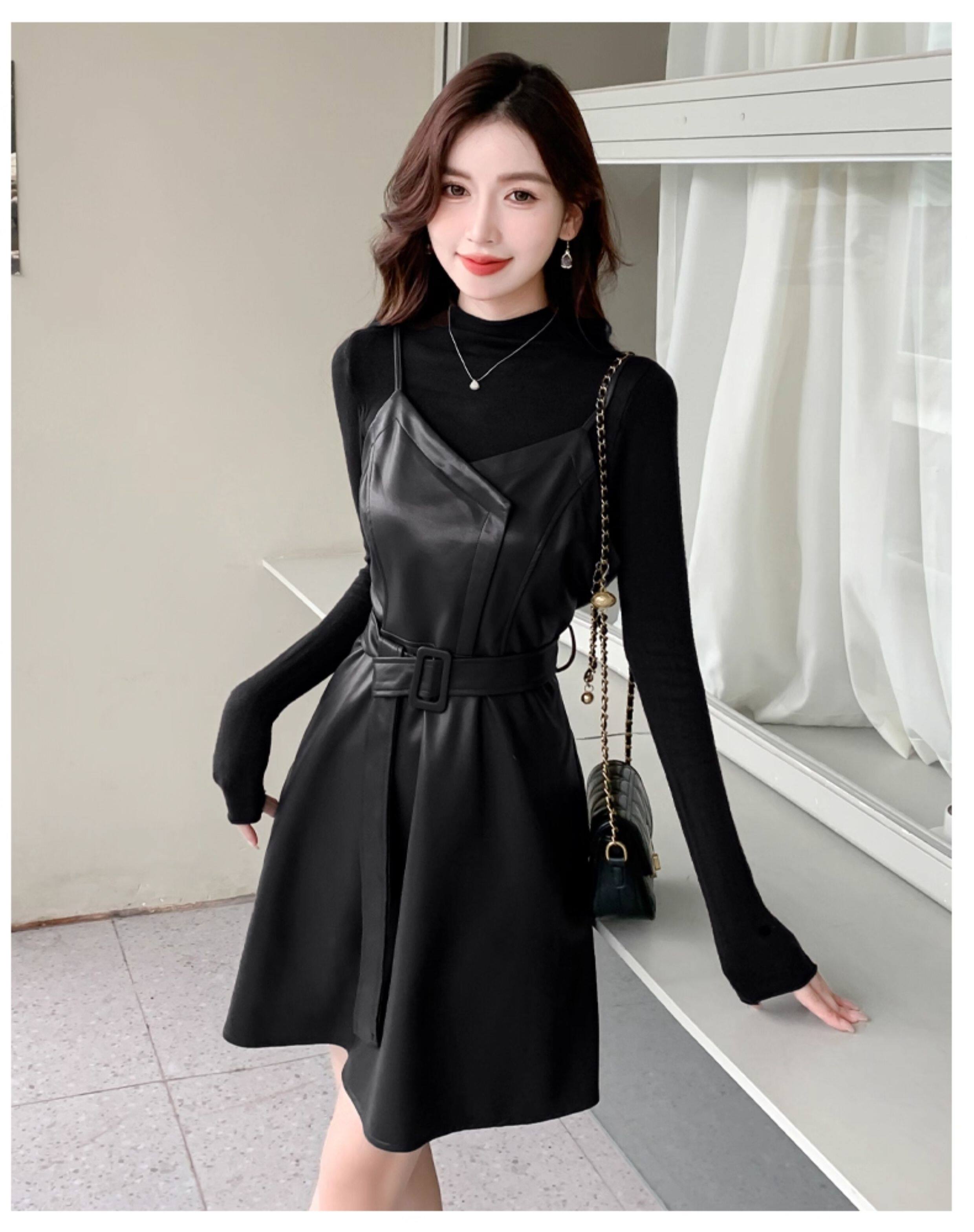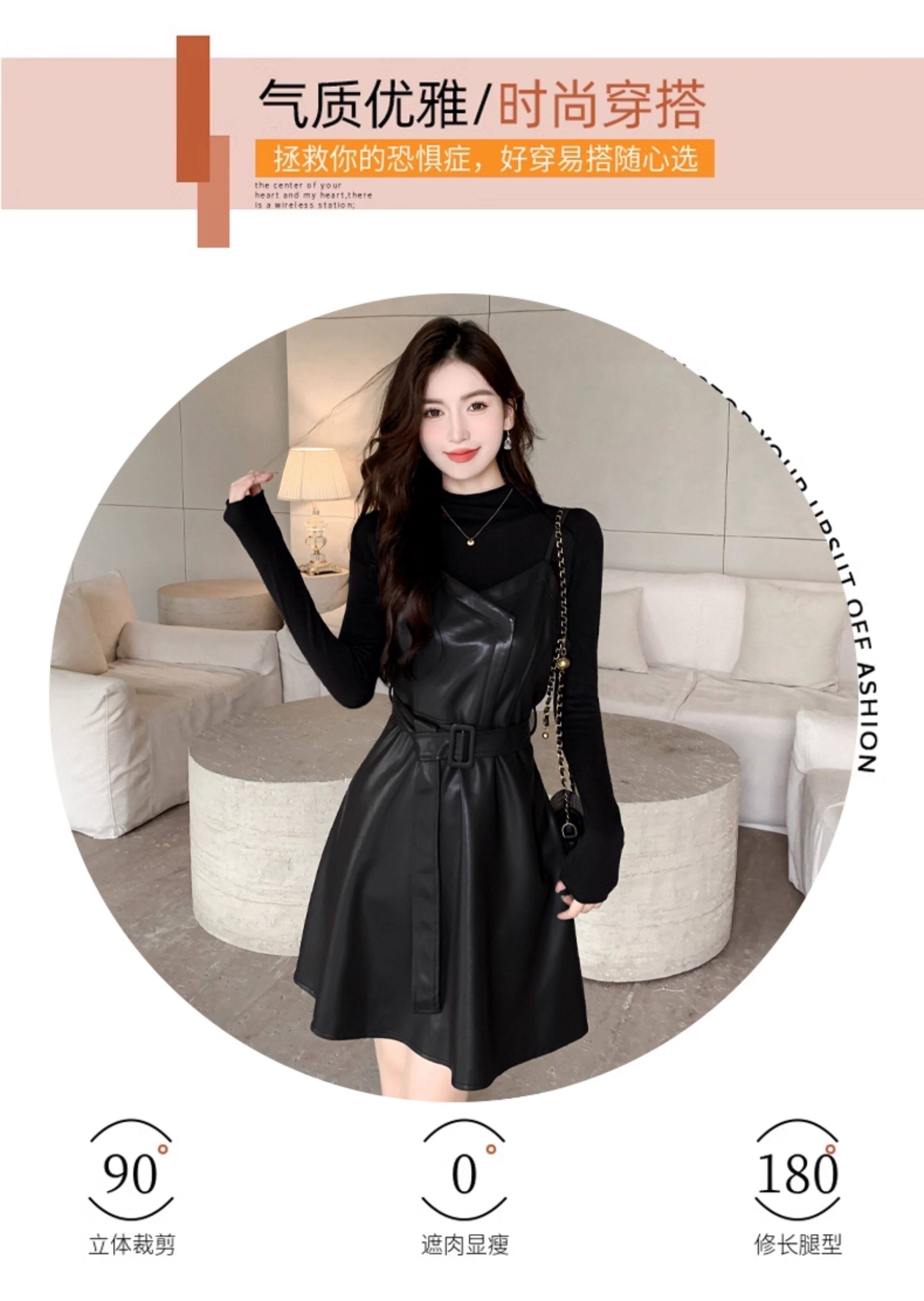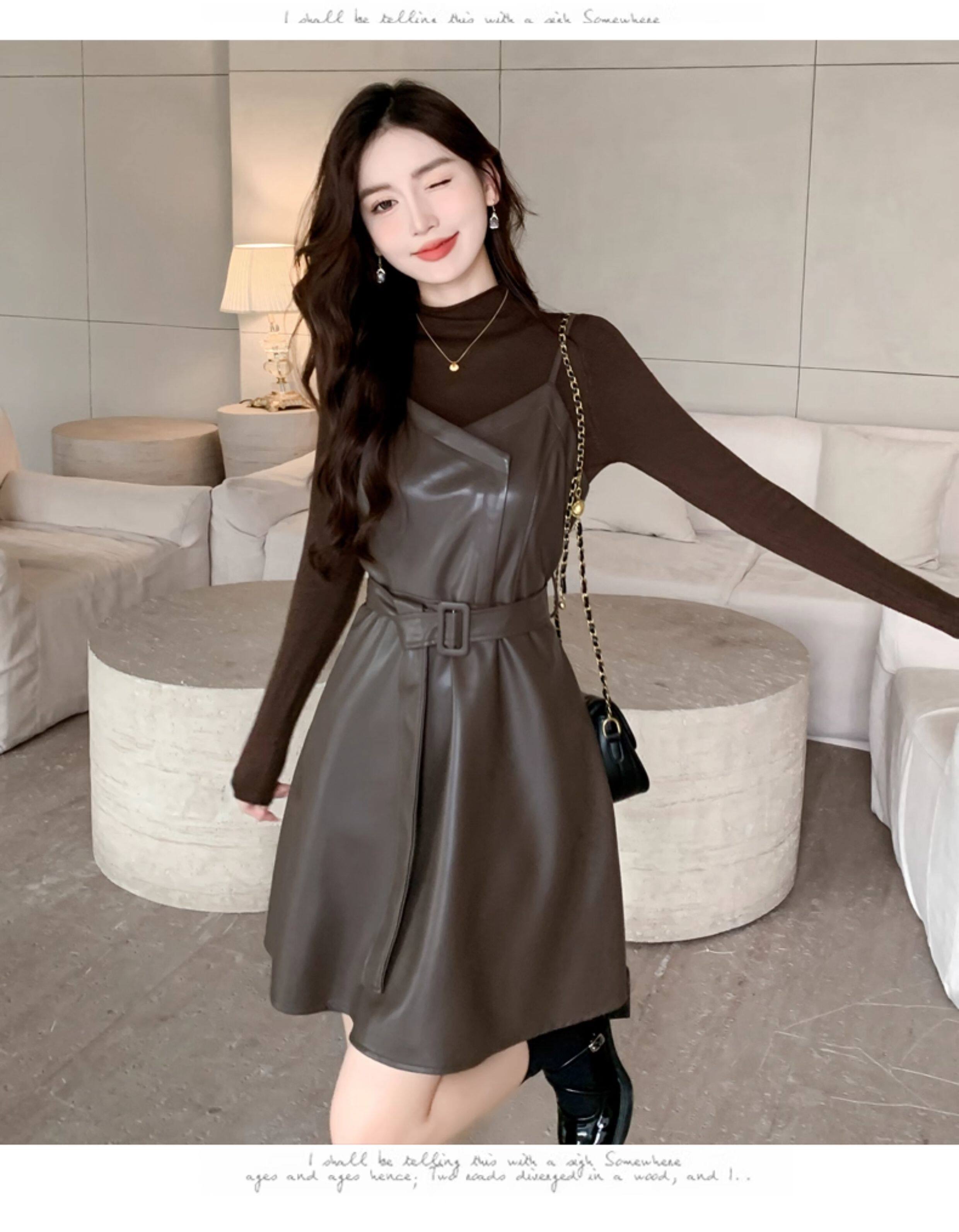 pu皮兩件套連衣裙子秋冬季新款2025女士長袖收腰顯瘦小個子時尚春