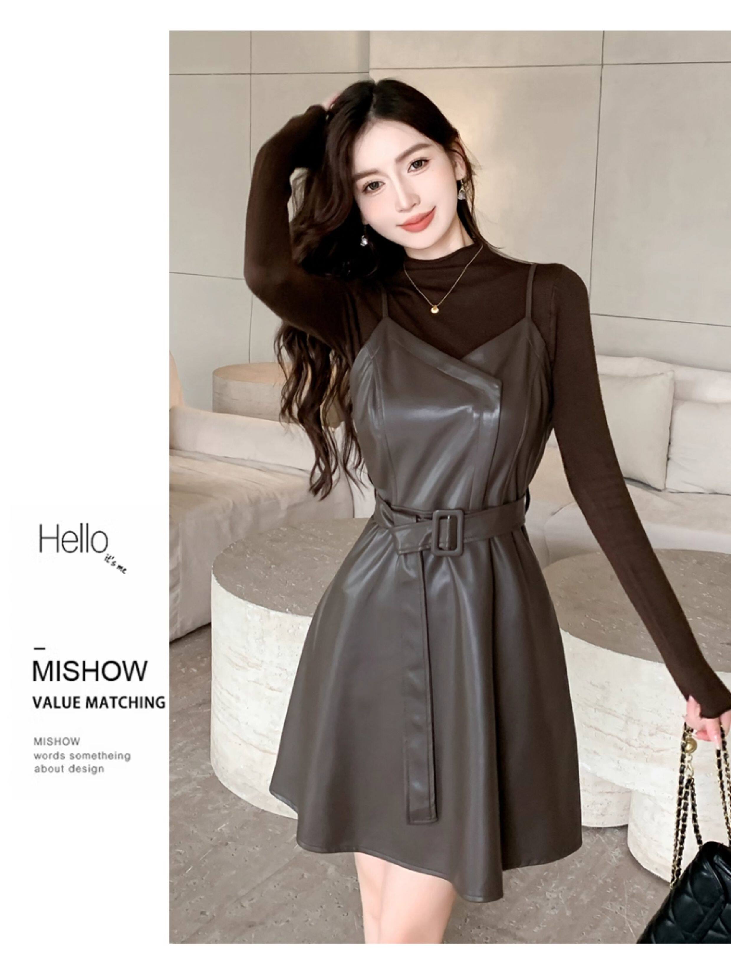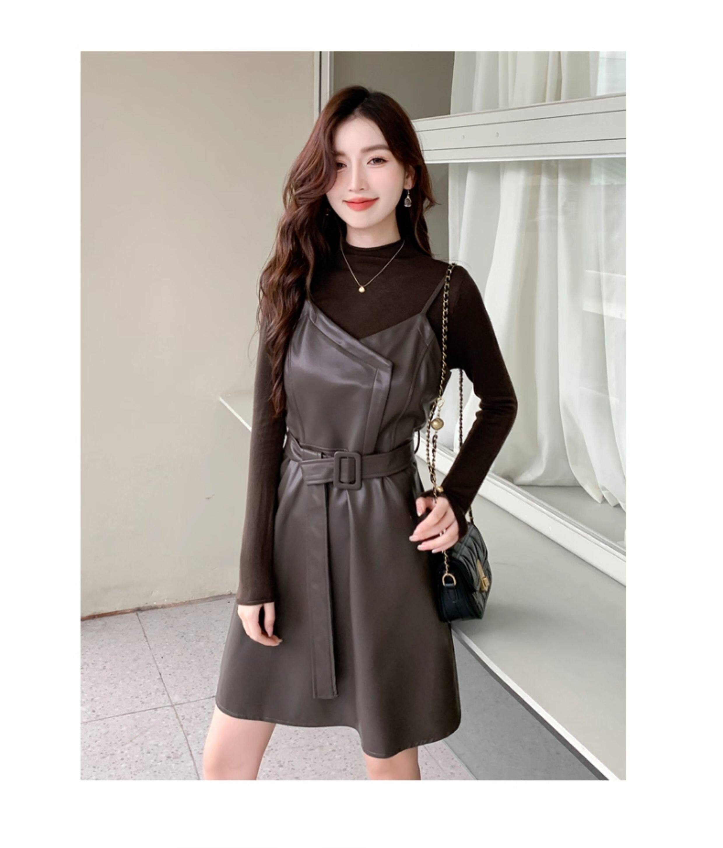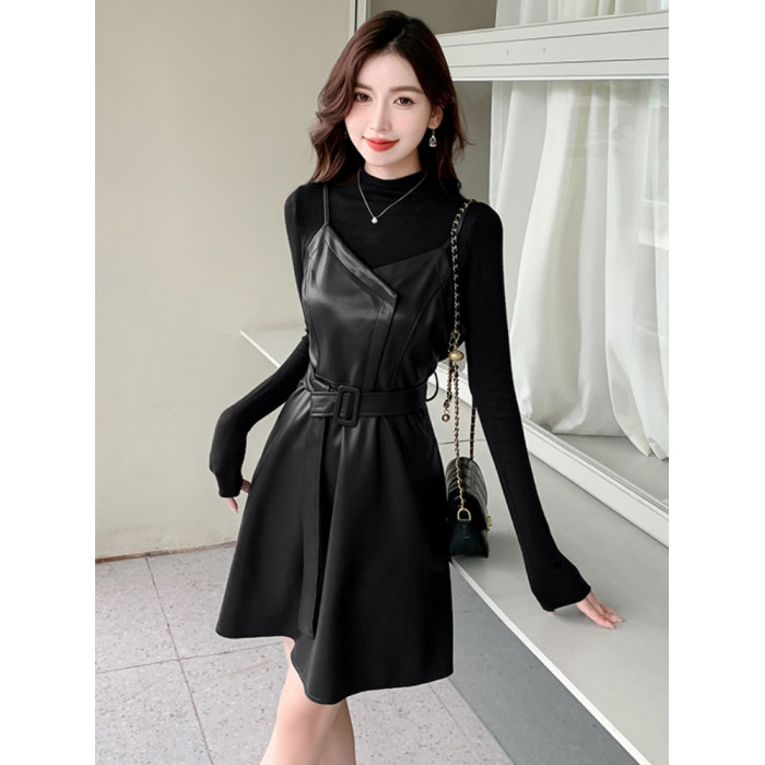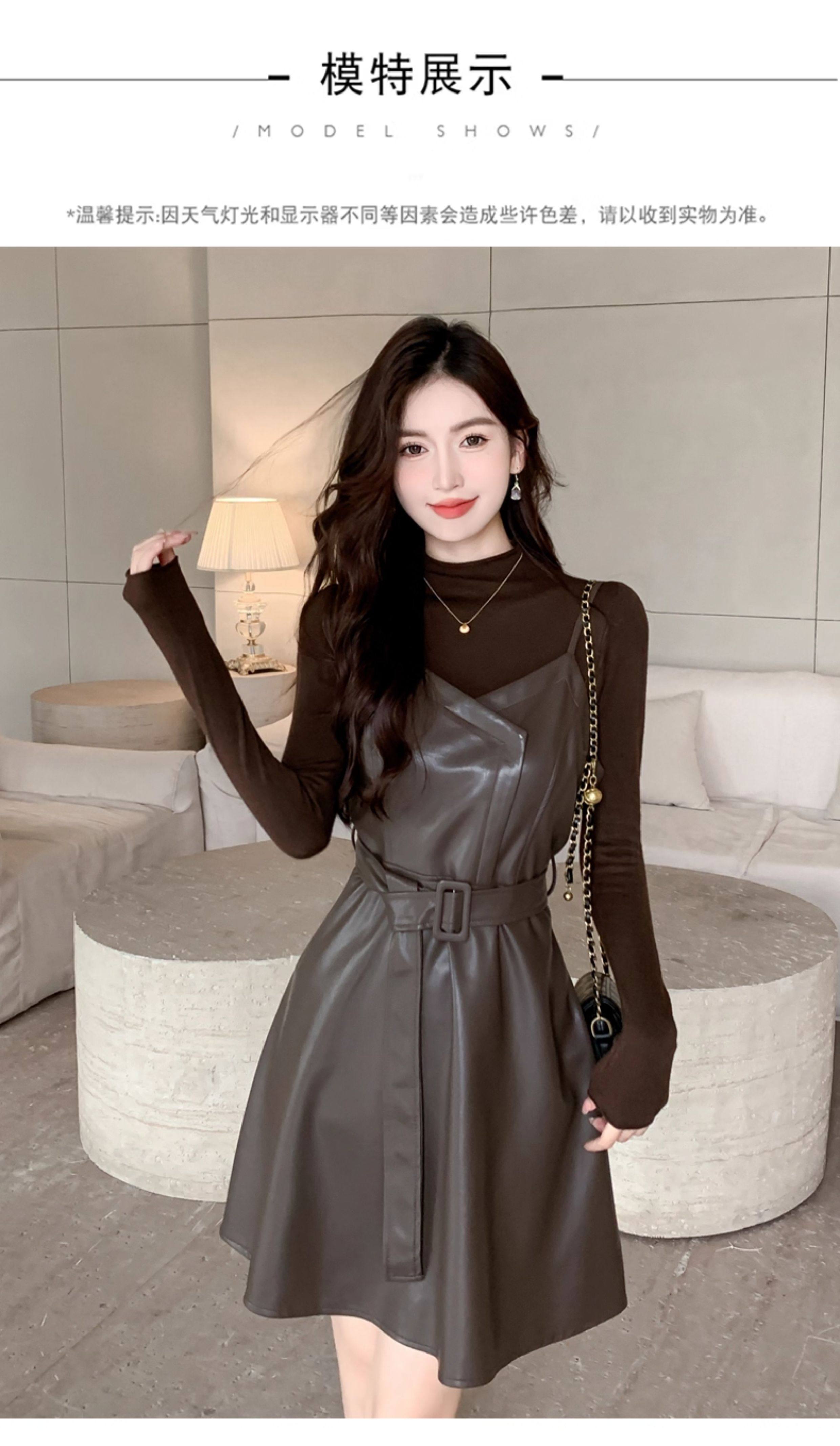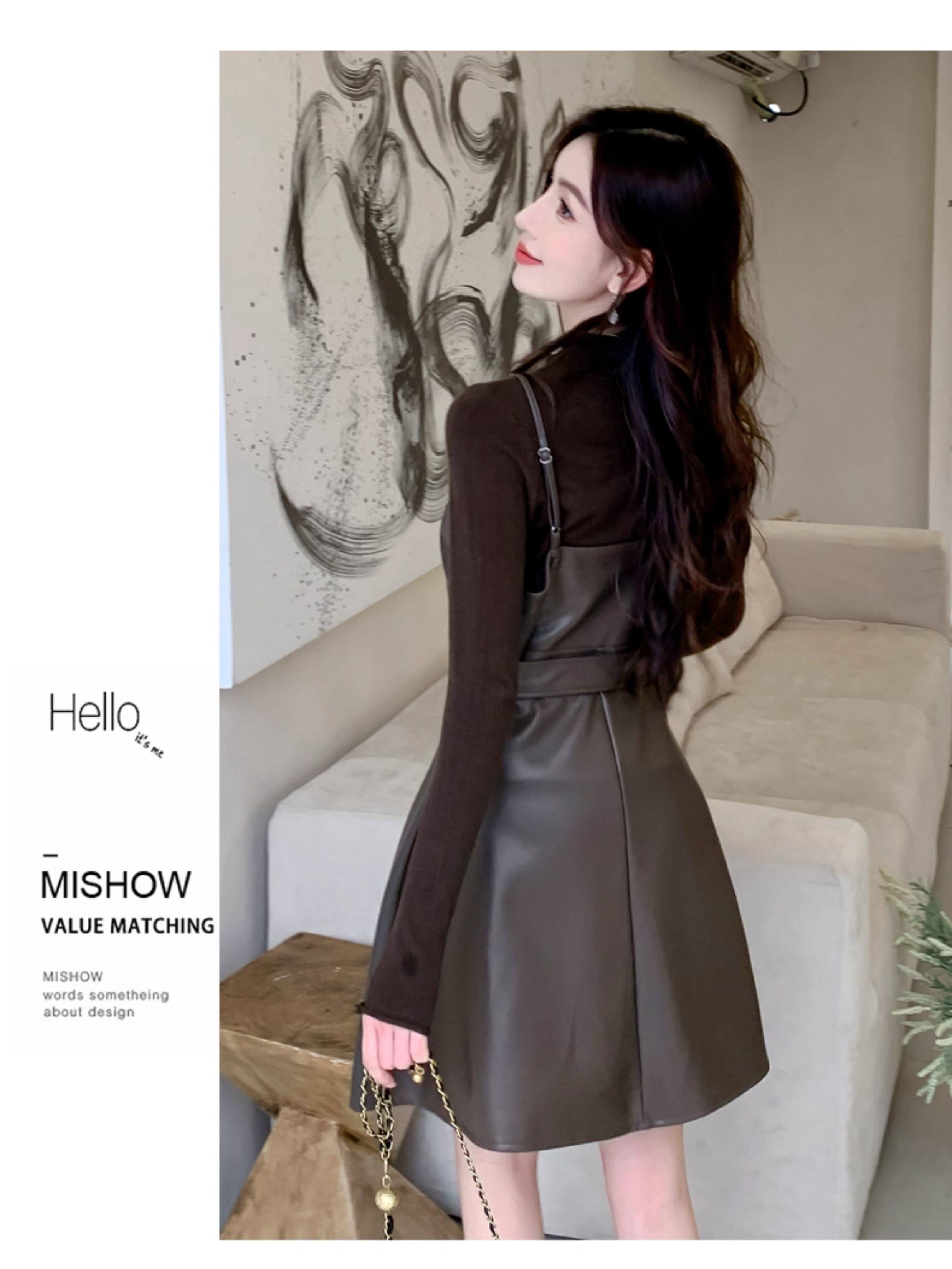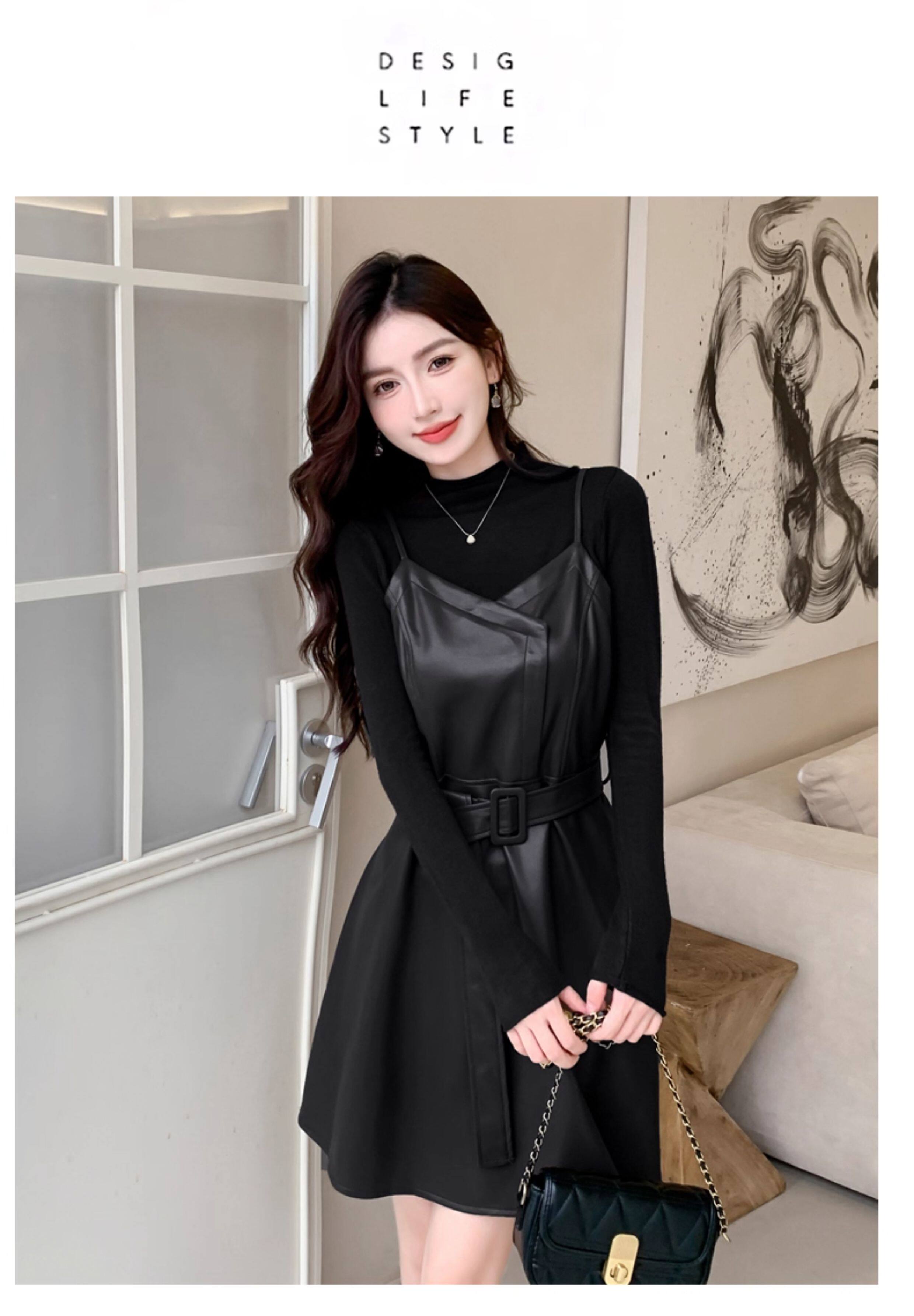 pu皮兩件套連衣裙子秋冬季新款2025女士長袖收腰顯瘦小個子時尚春