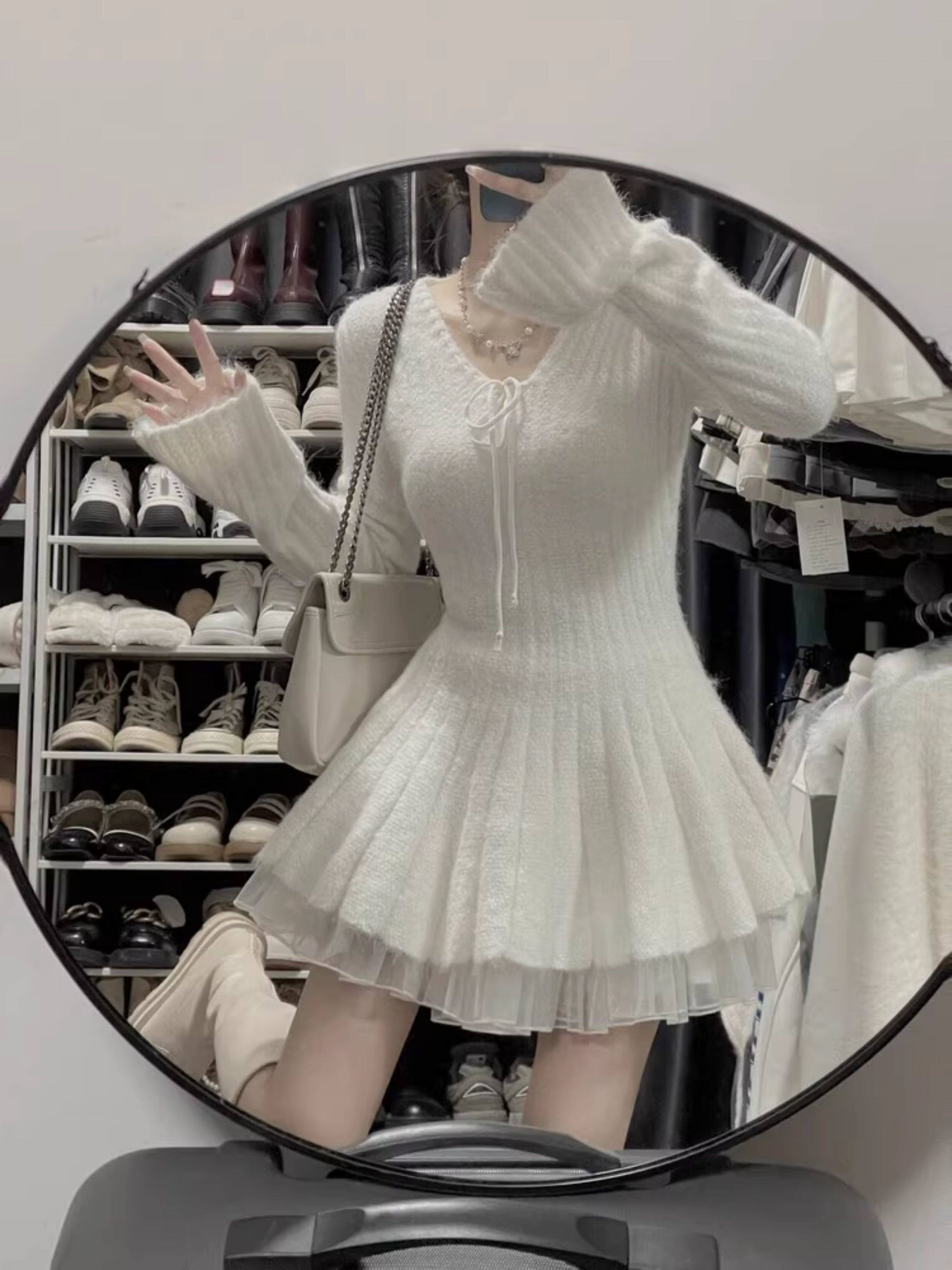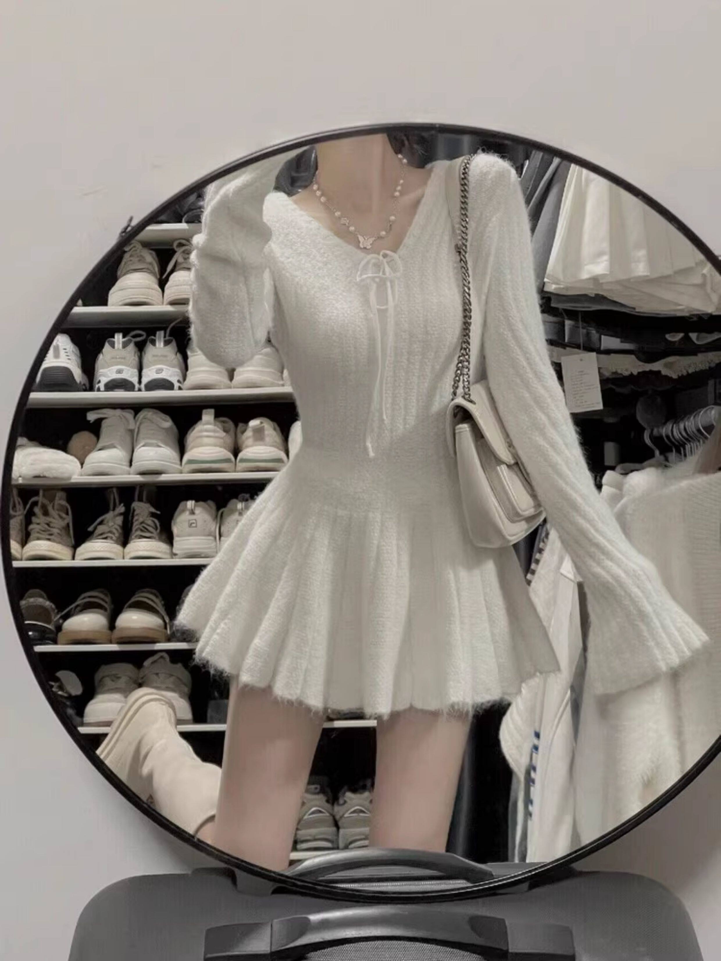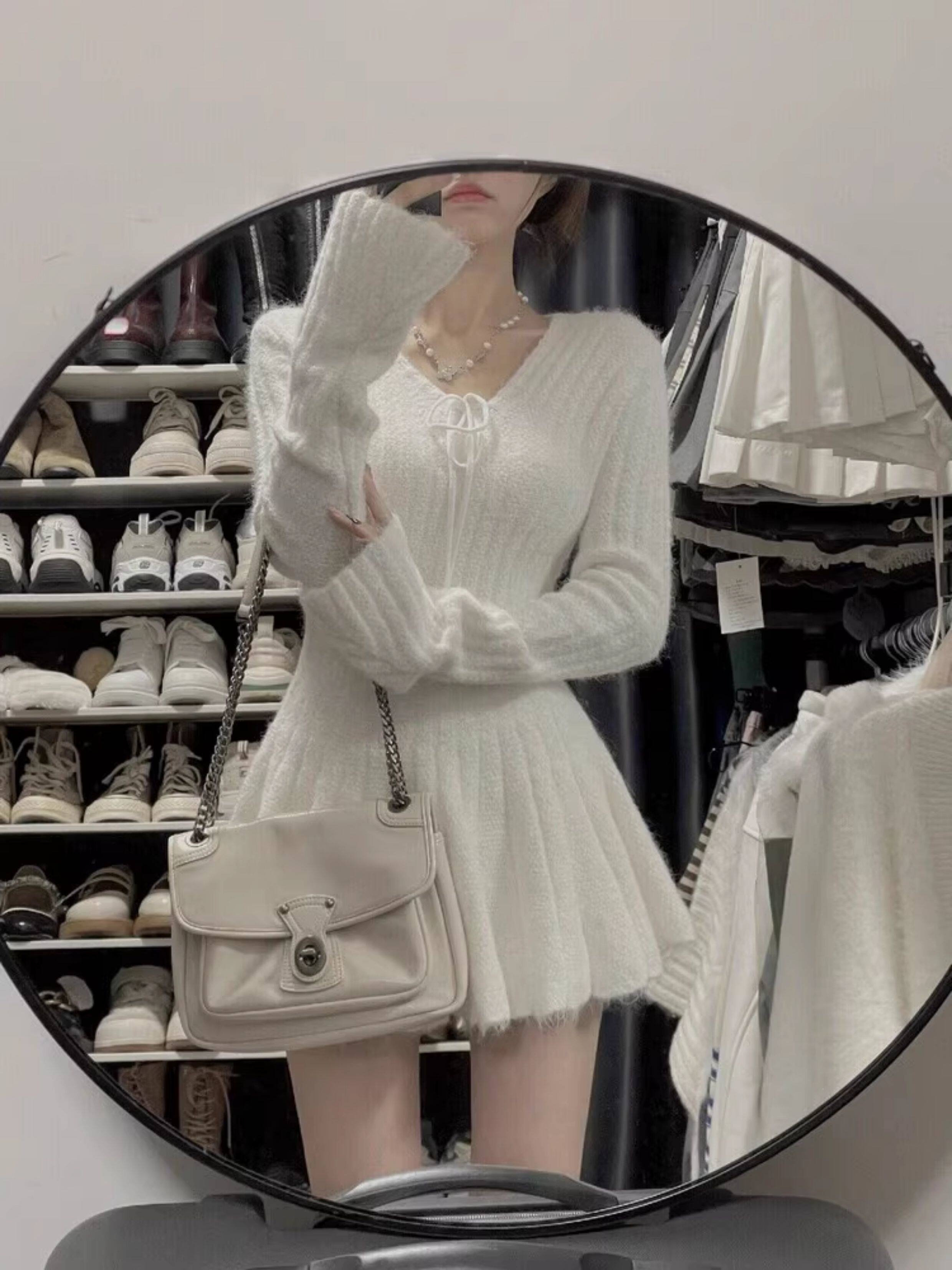 法式V領白色針織毛衣連衣裙女秋冬氣質內搭打底裙收腰修身短裙子