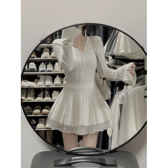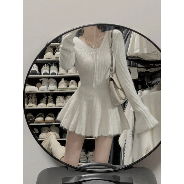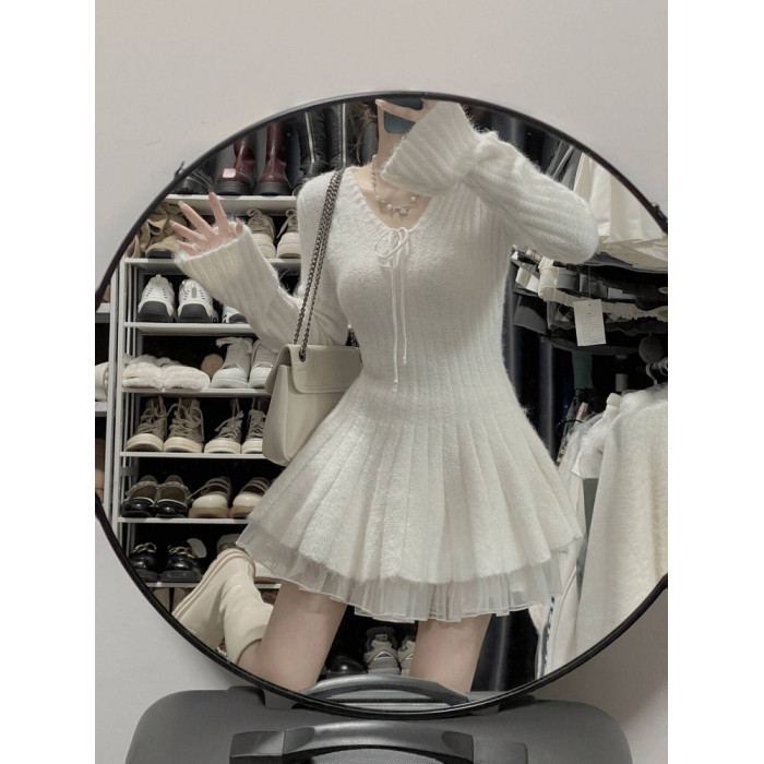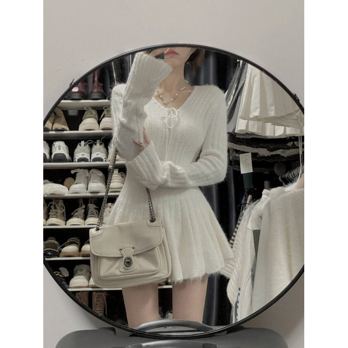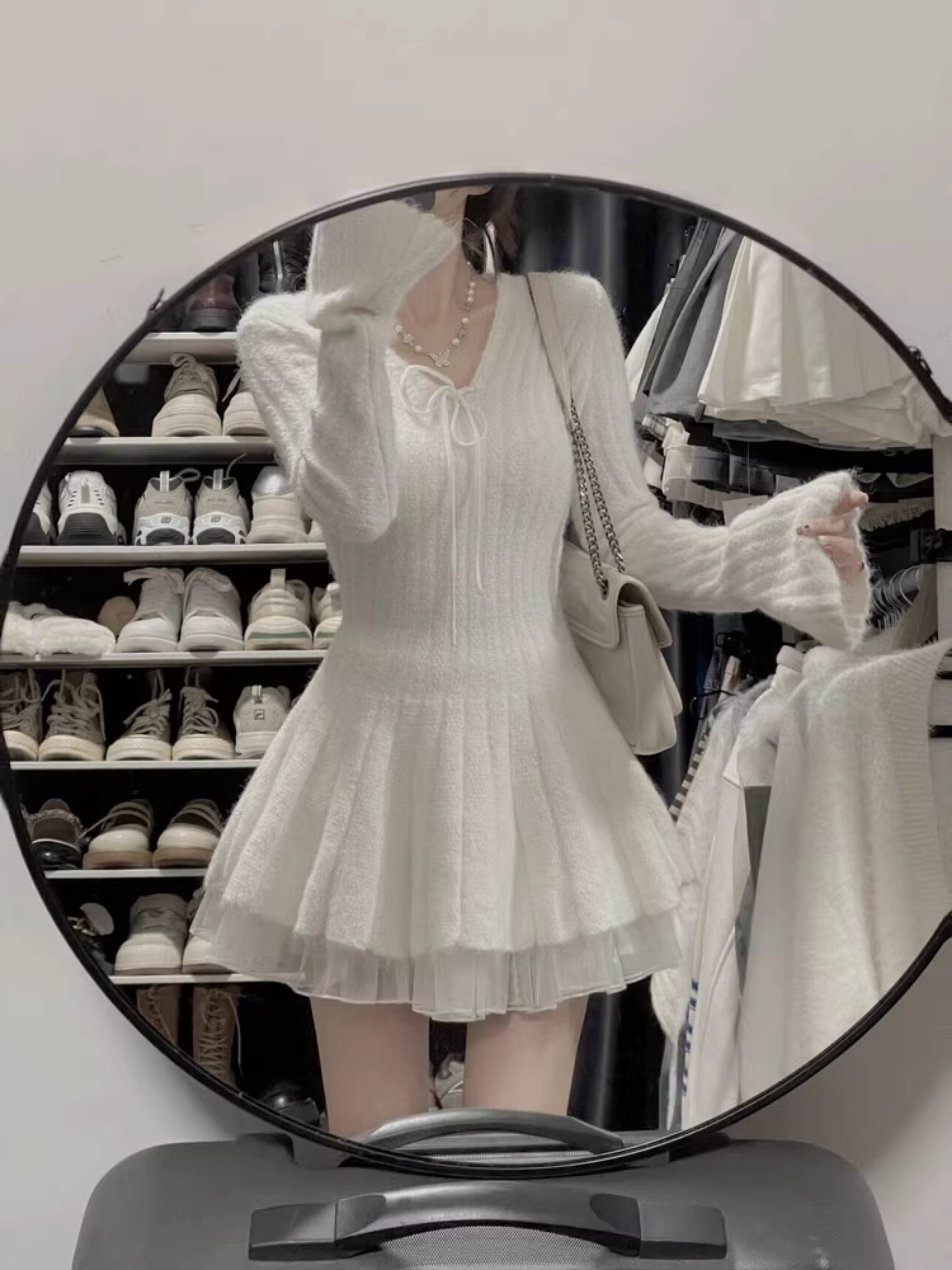 法式V領白色針織毛衣連衣裙女秋冬氣質內搭打底裙收腰修身短裙子