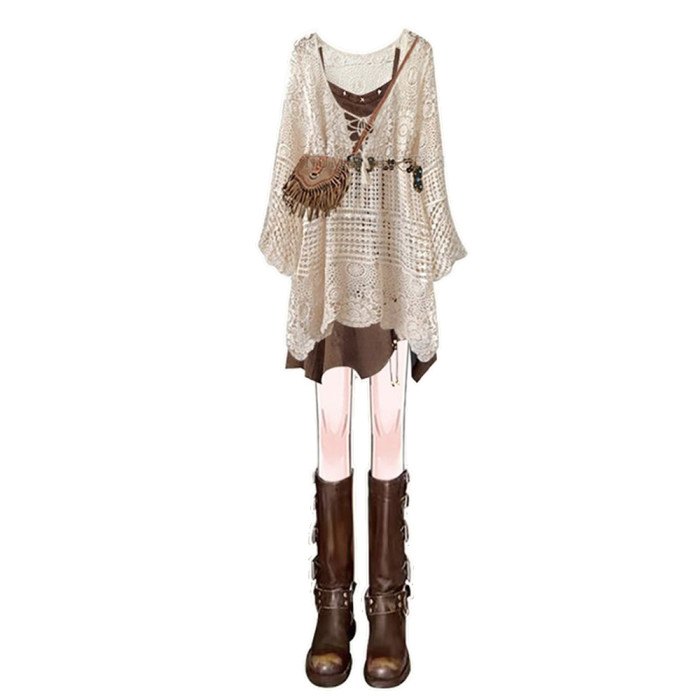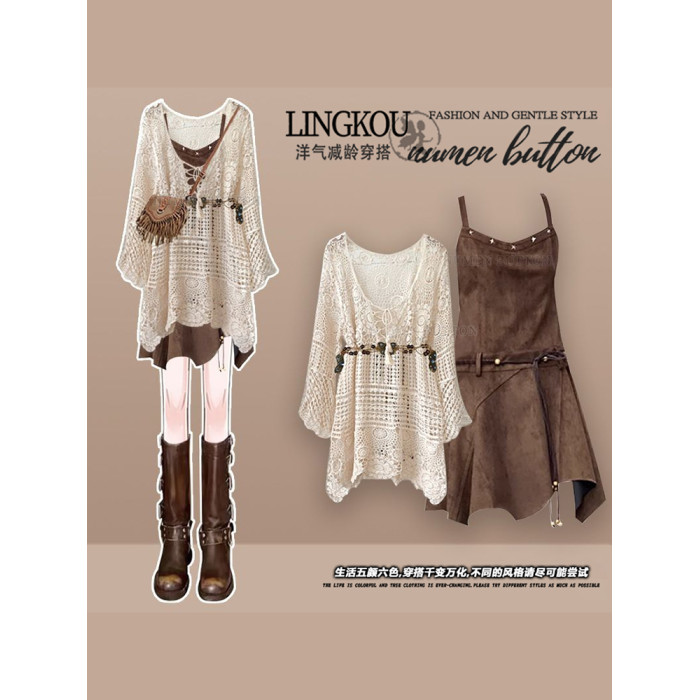 大碼春秋波西米亞套裝女鏤空罩衫不規則收腰復古吊帶連衣裙兩件套