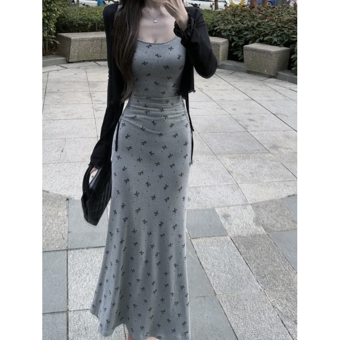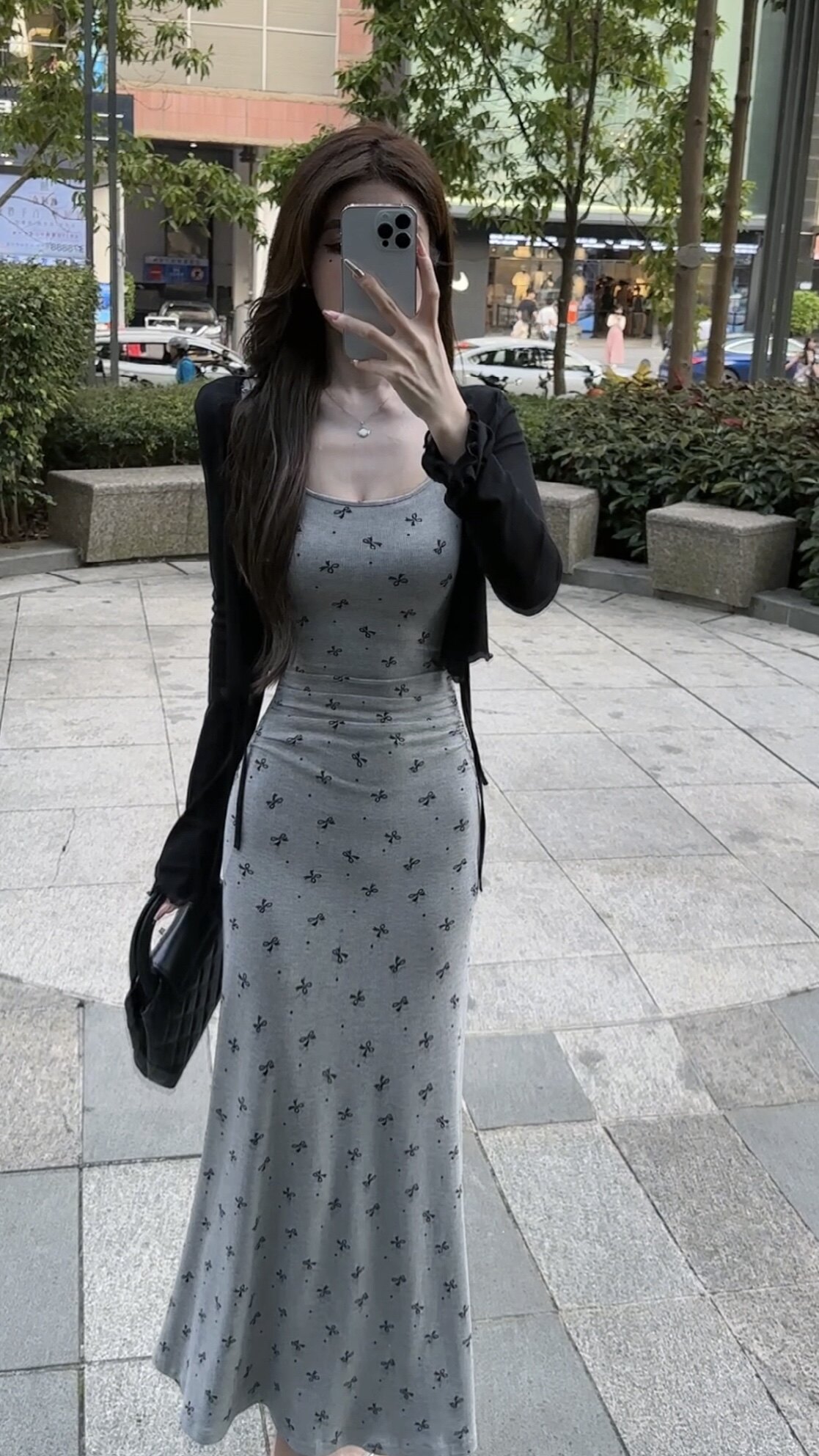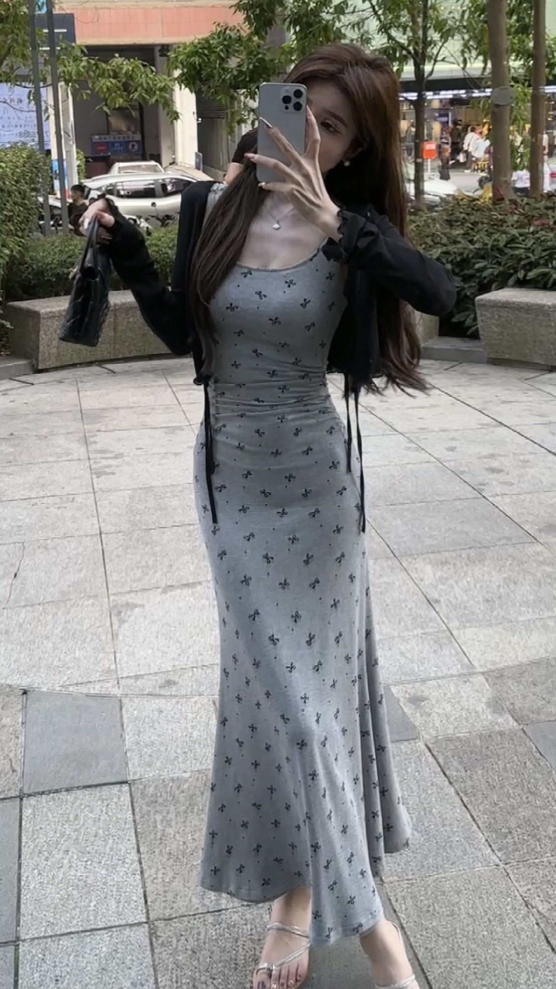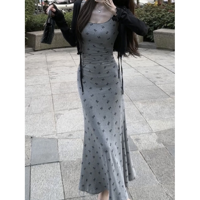 150小個子穿搭吊帶碎花連衣裙子女秋季2025新款法式灰色長裙套裝