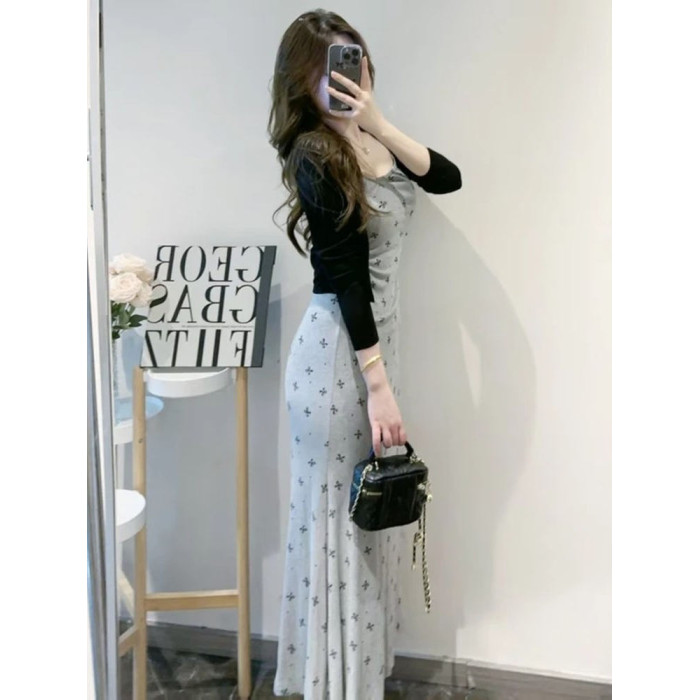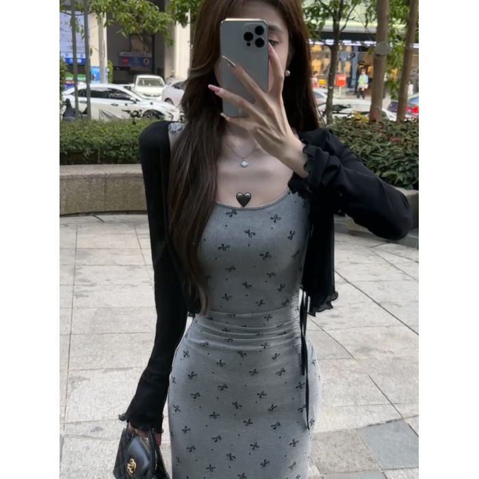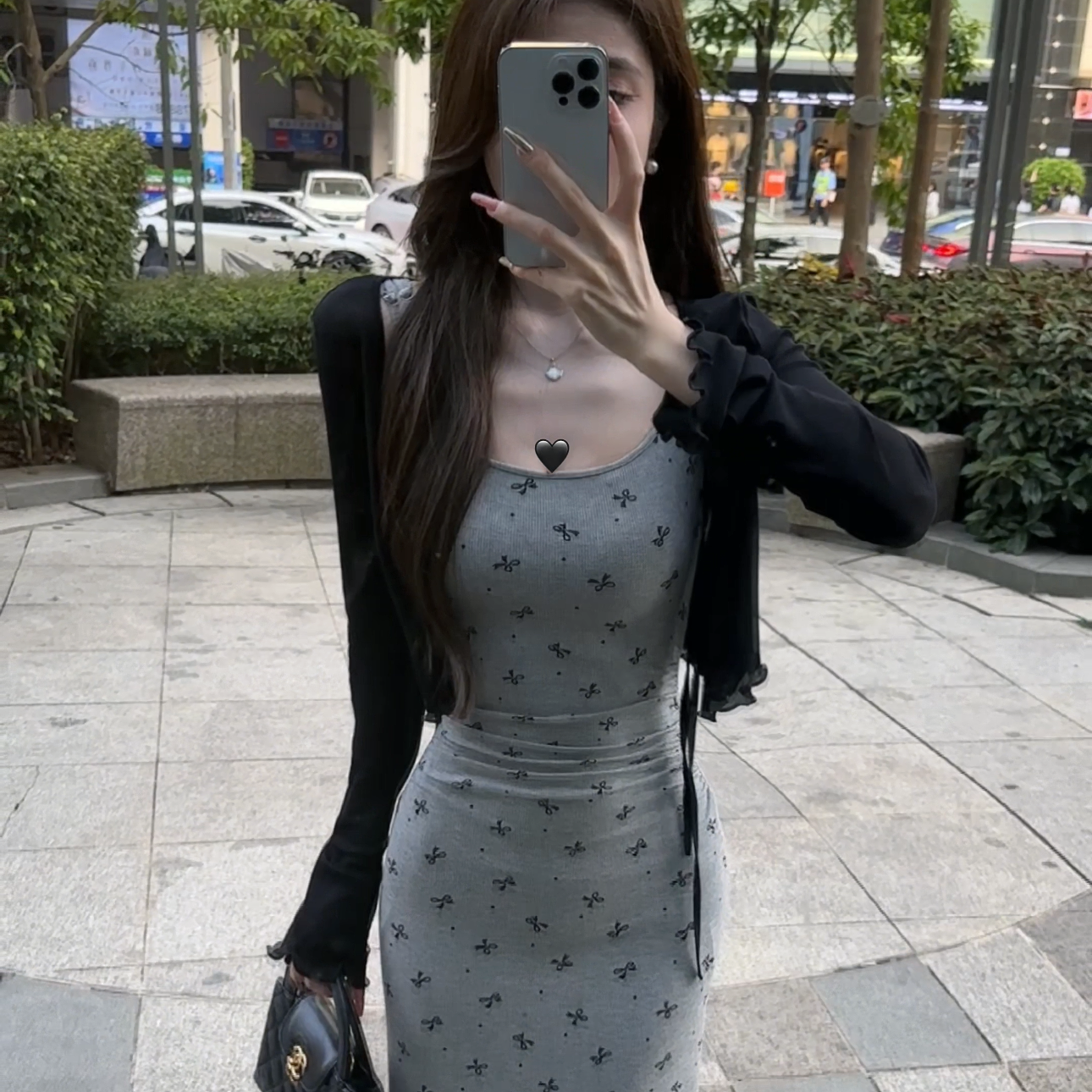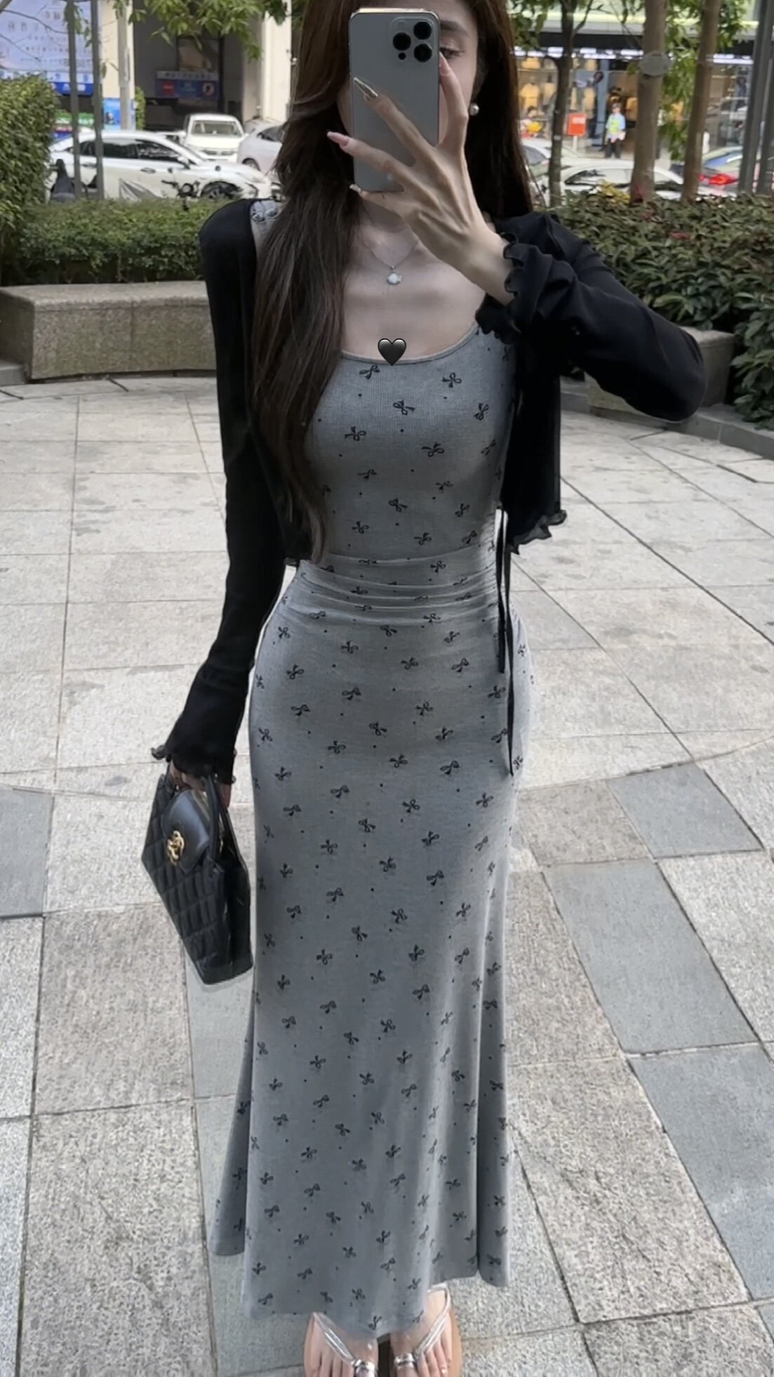 150小個子穿搭吊帶碎花連衣裙子女秋季2025新款法式灰色長裙套裝