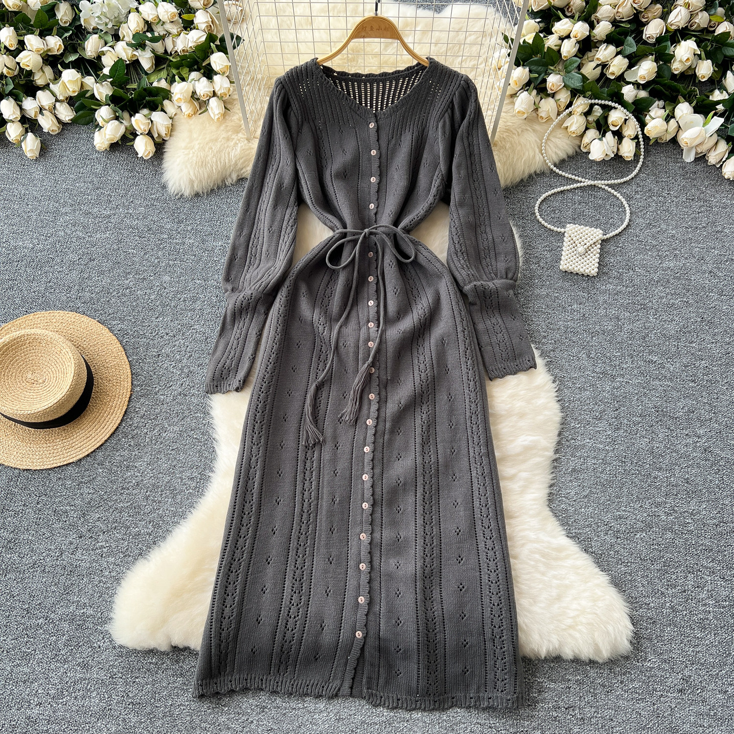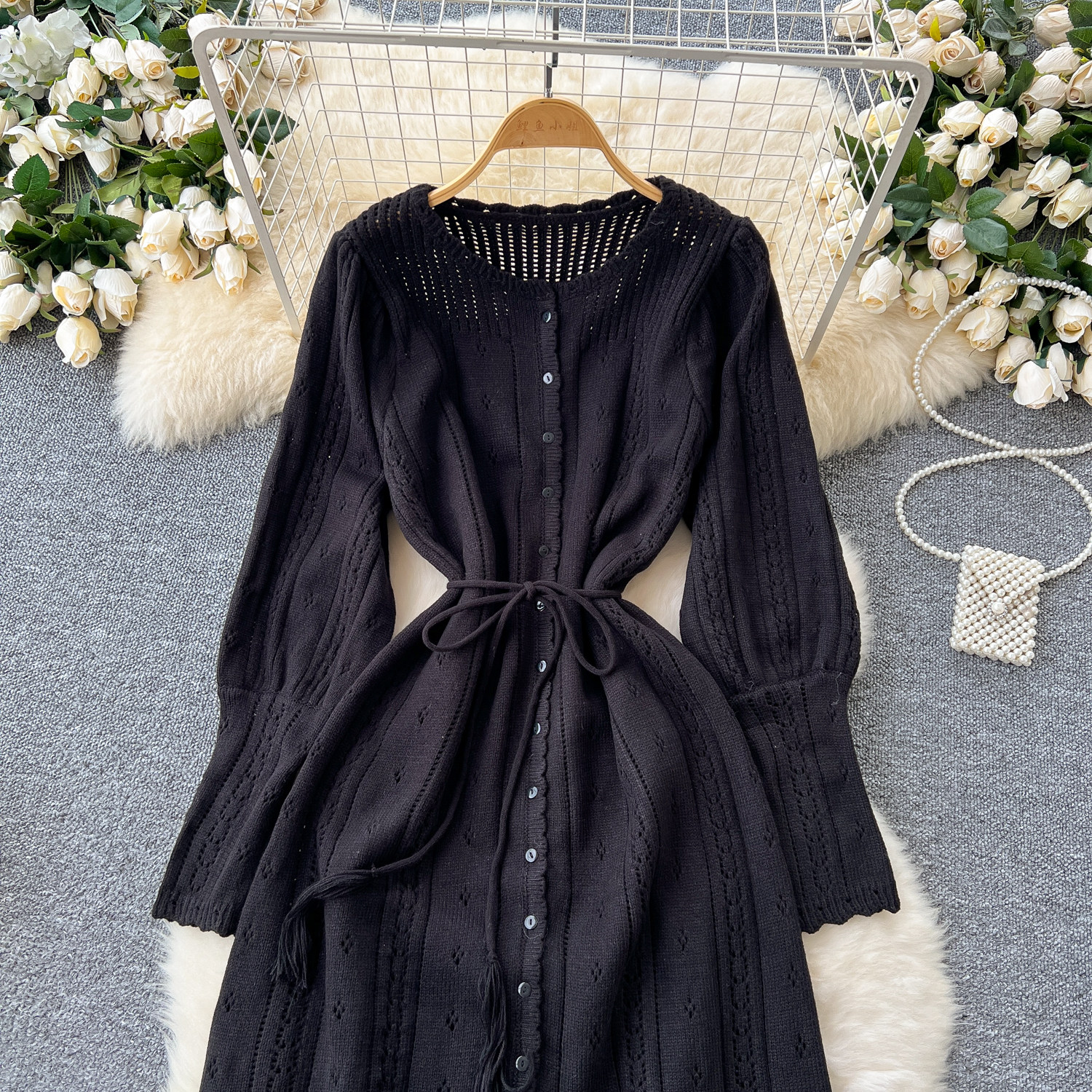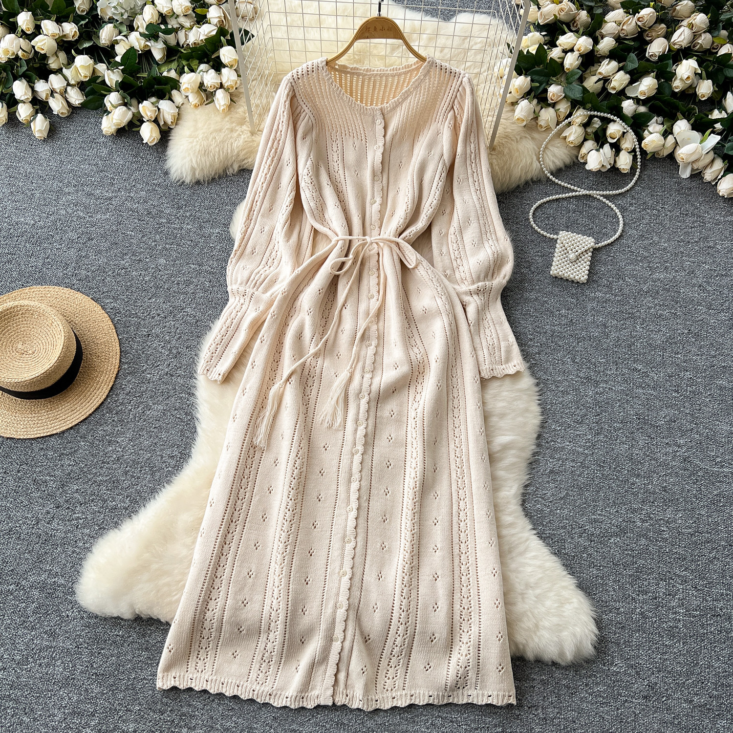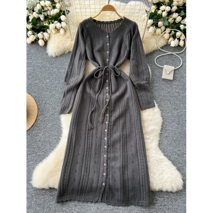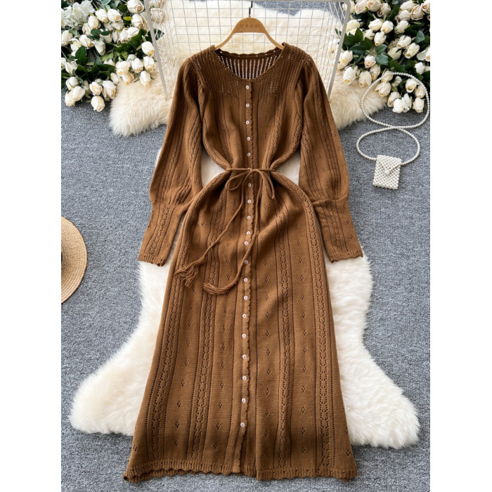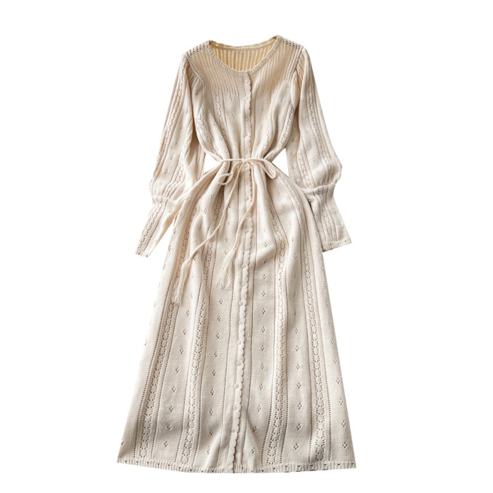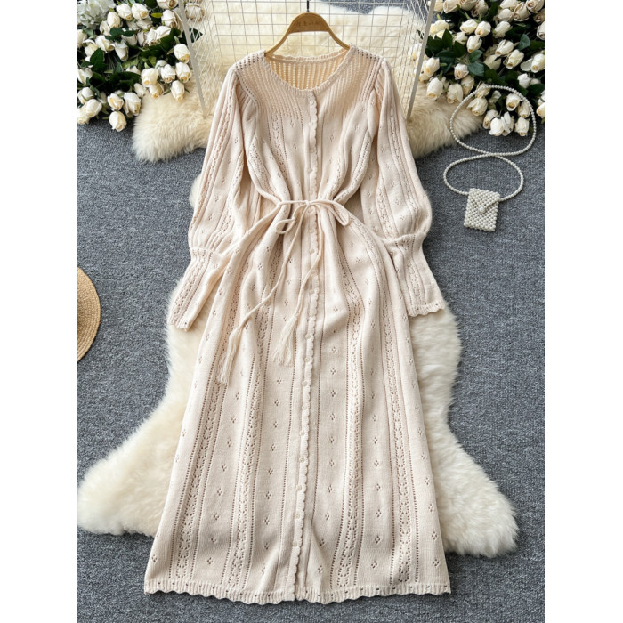 溫柔風ins針織連衣裙女秋冬甜美鏤空鉤花針織燈籠袖綁帶收腰長裙
