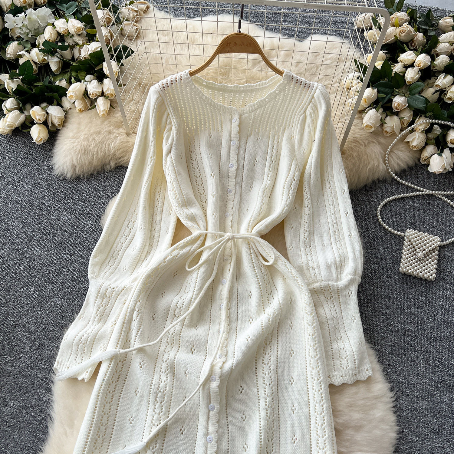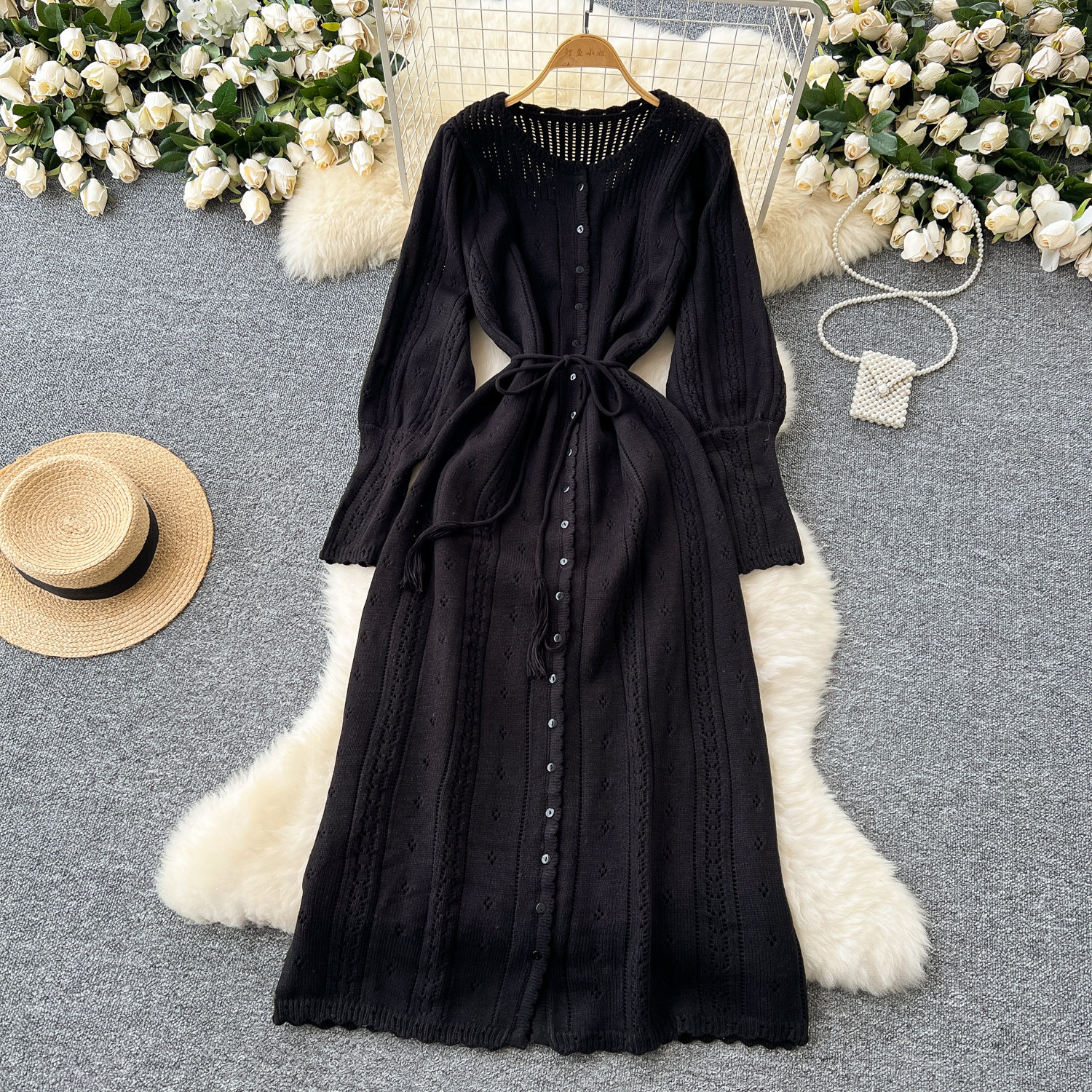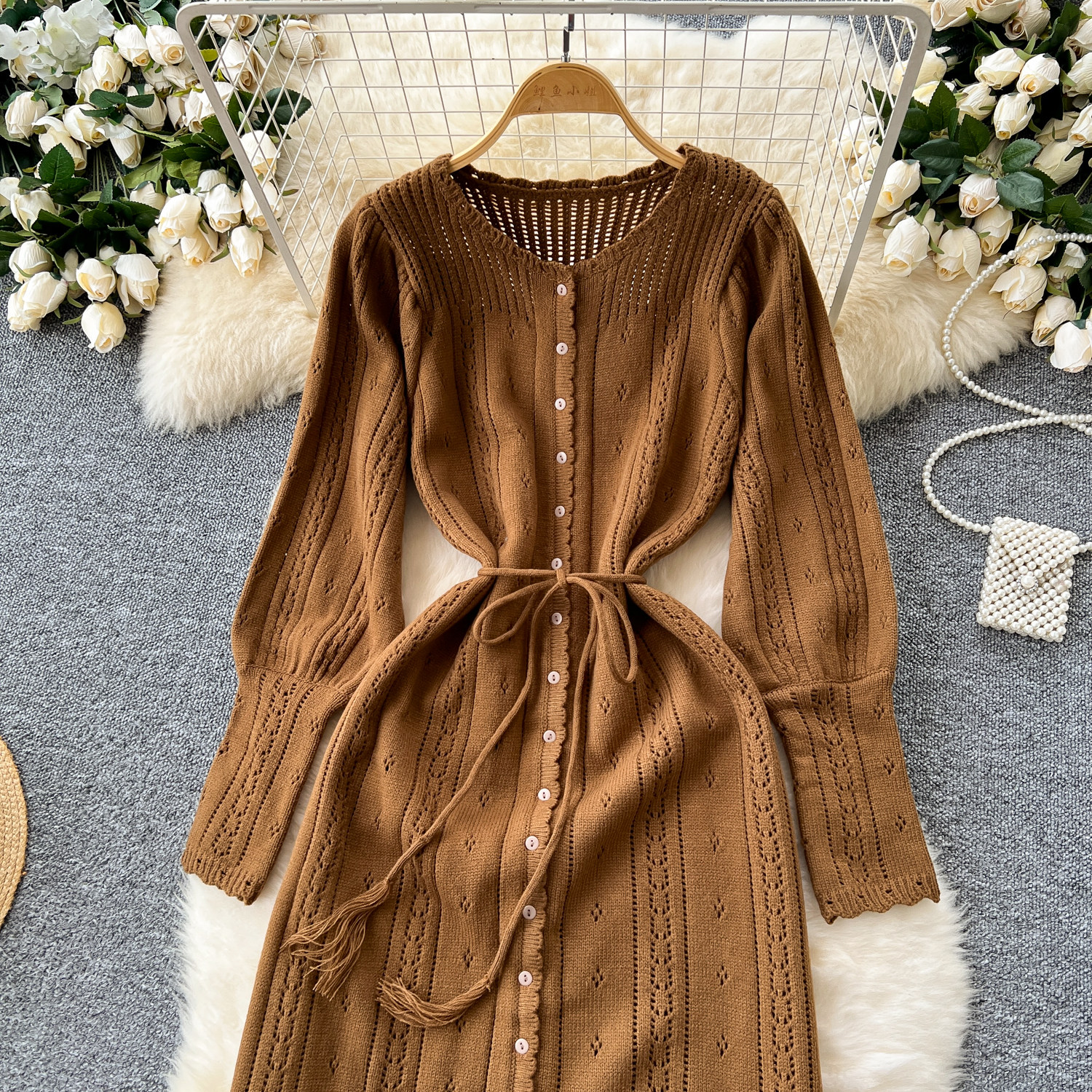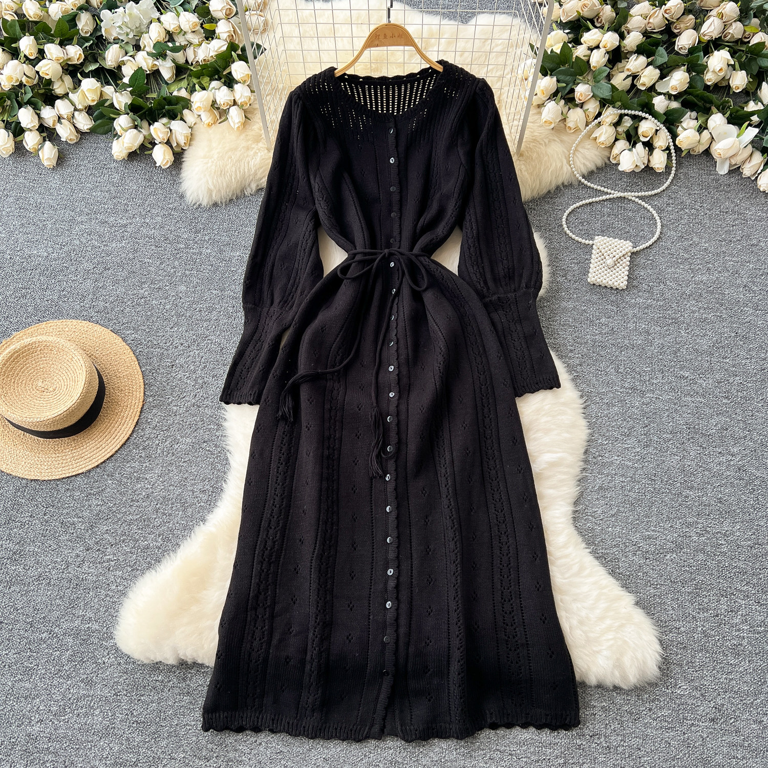 溫柔風ins針織連衣裙女秋冬甜美鏤空鉤花針織燈籠袖綁帶收腰長裙