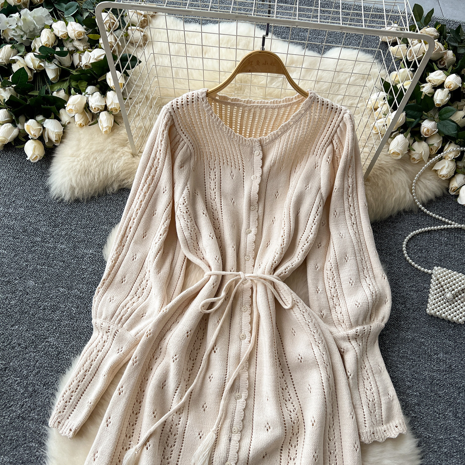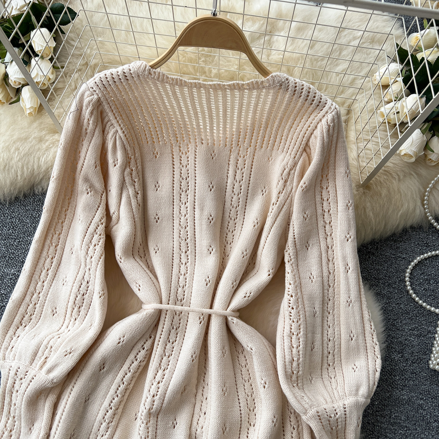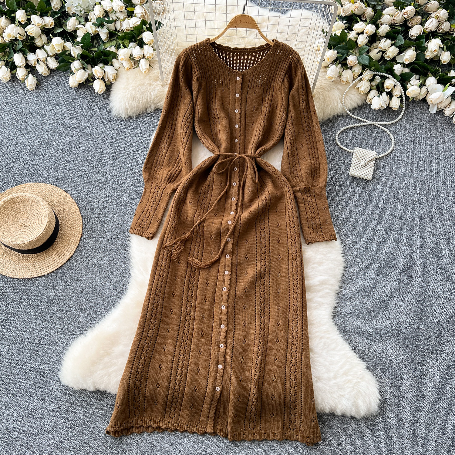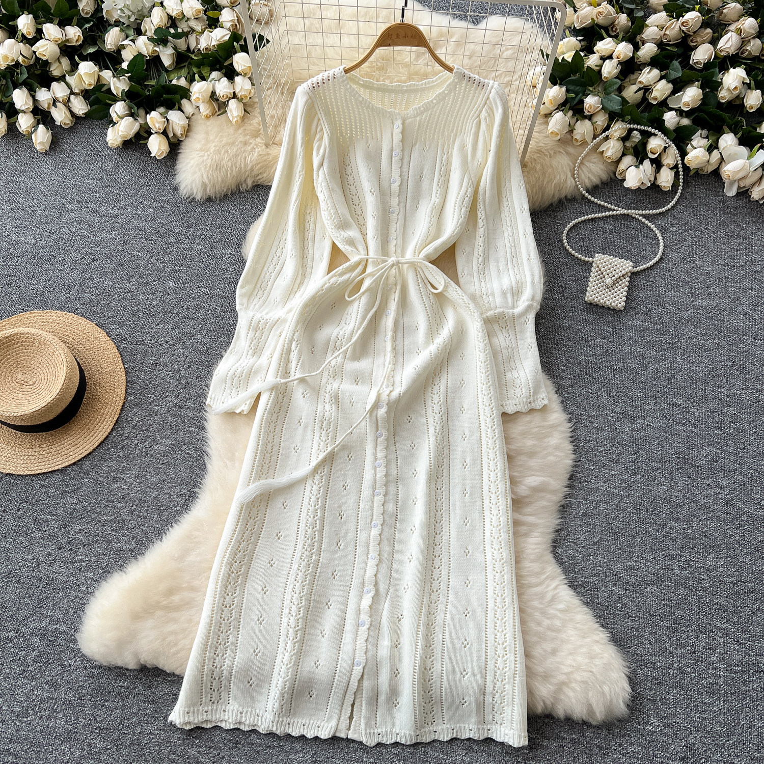 溫柔風ins針織連衣裙女秋冬甜美鏤空鉤花針織燈籠袖綁帶收腰長裙