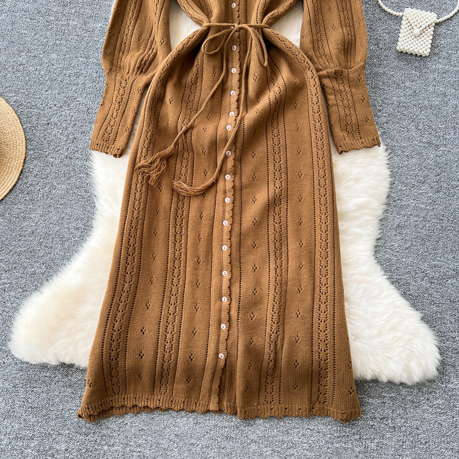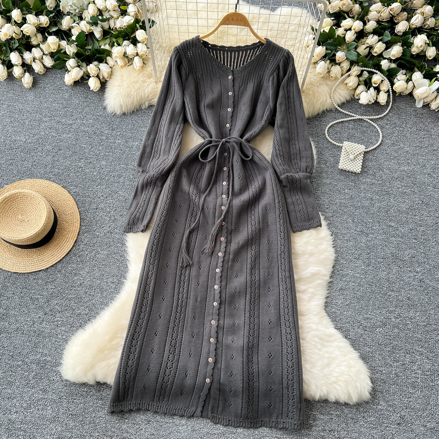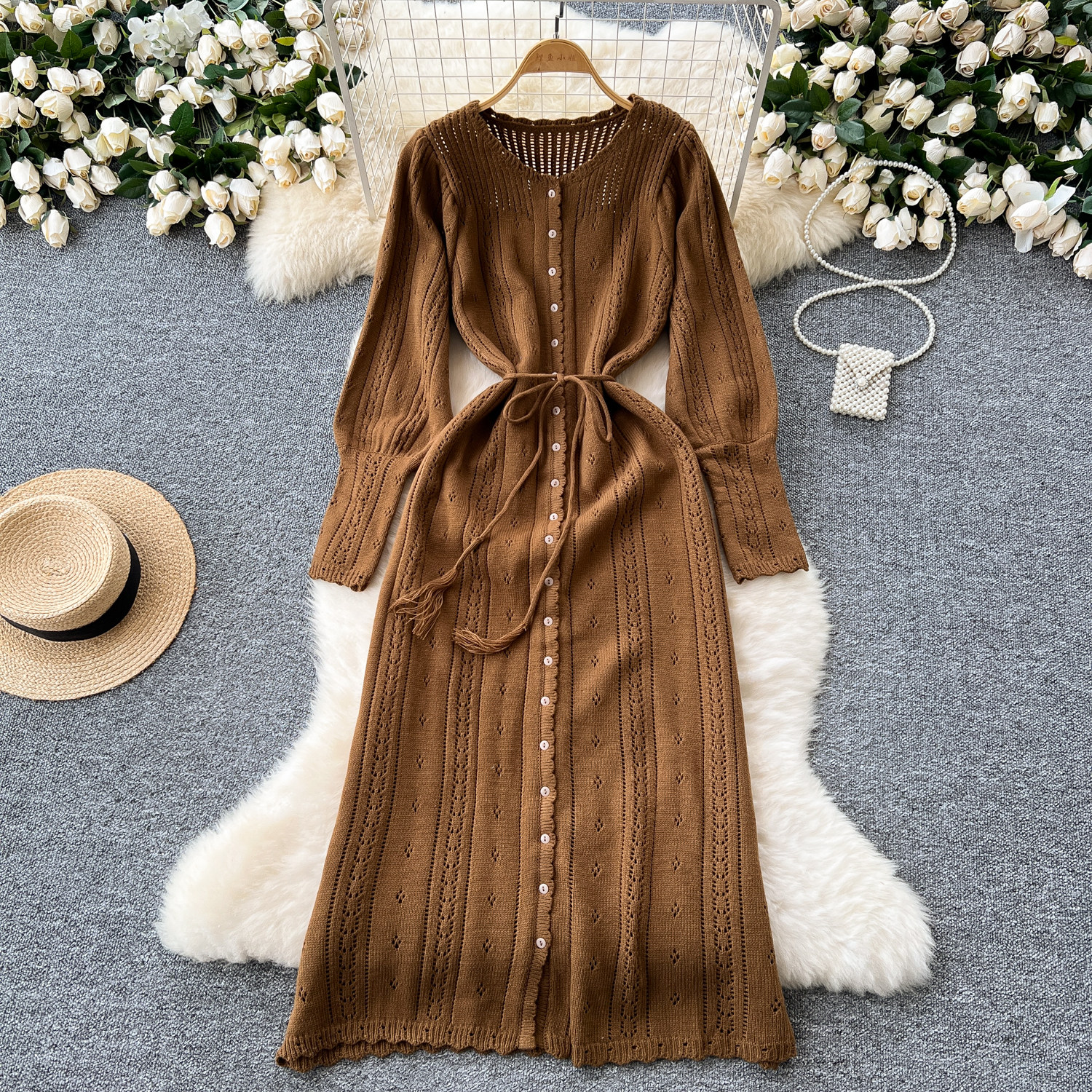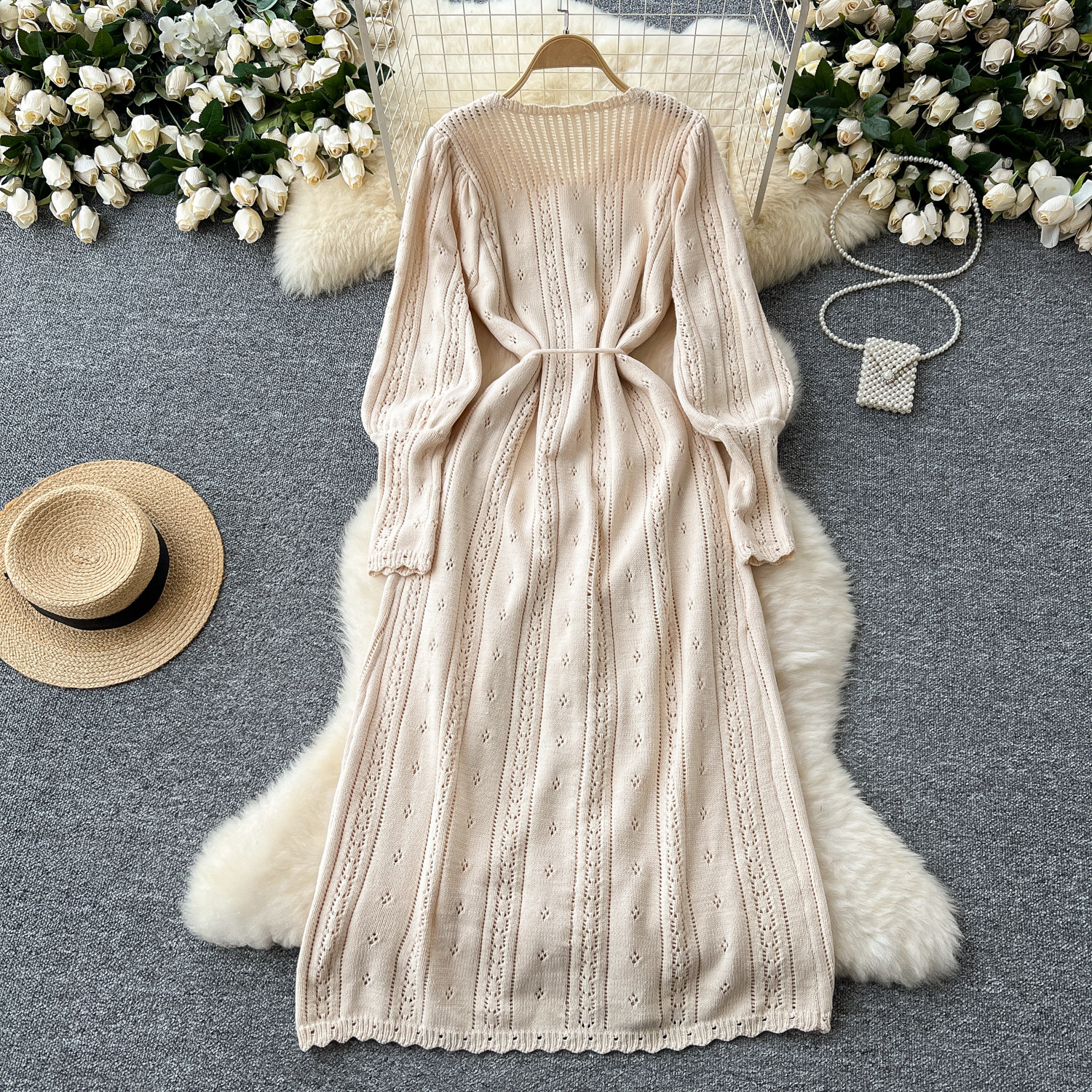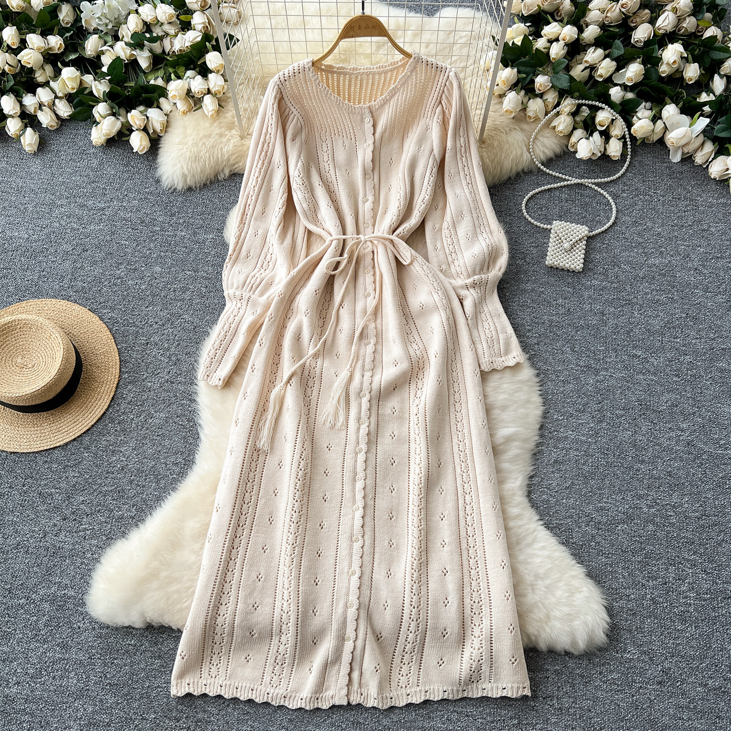 溫柔風ins針織連衣裙女秋冬甜美鏤空鉤花針織燈籠袖綁帶收腰長裙