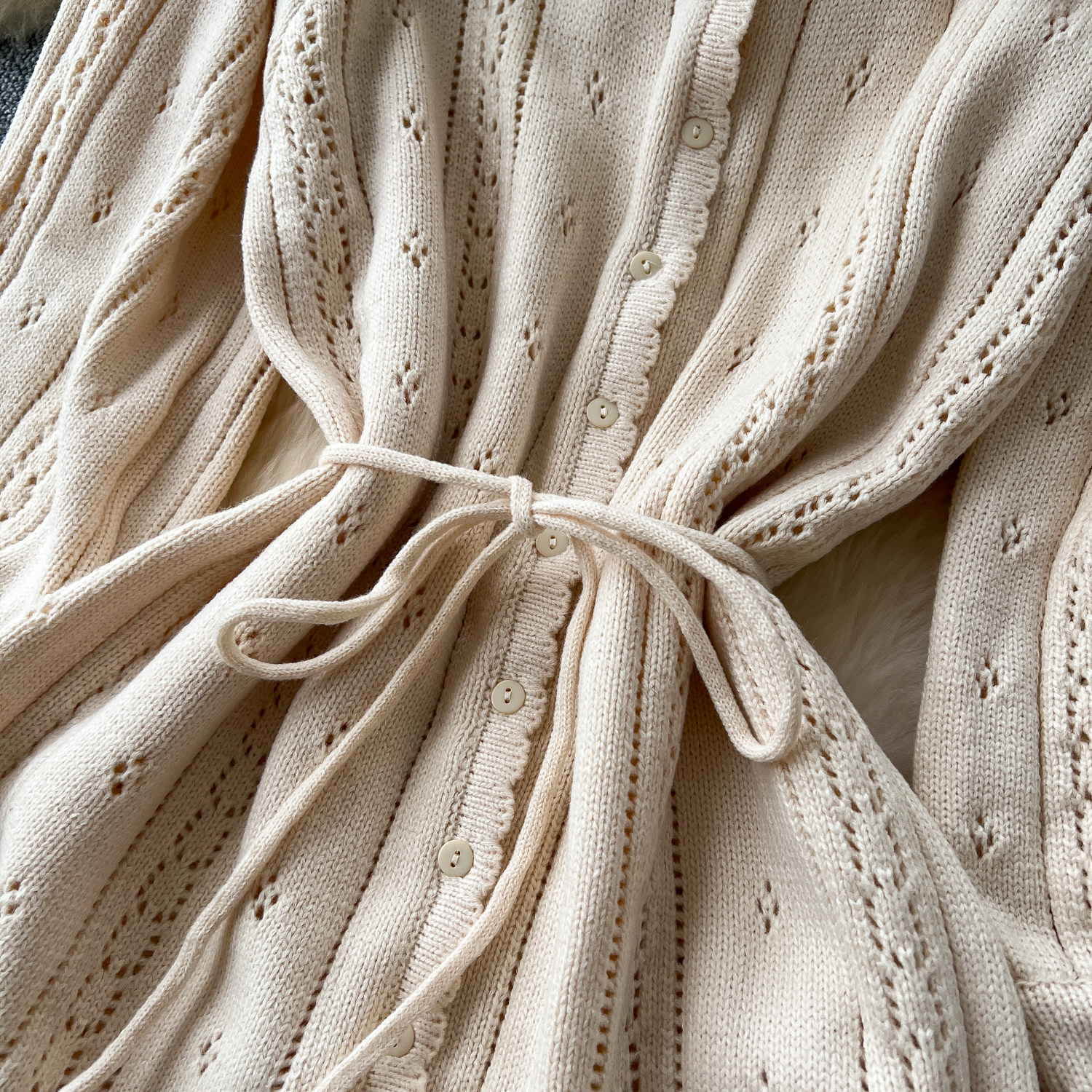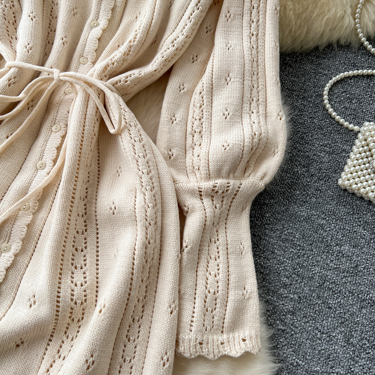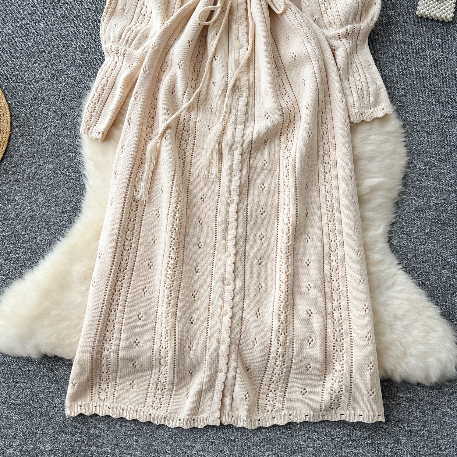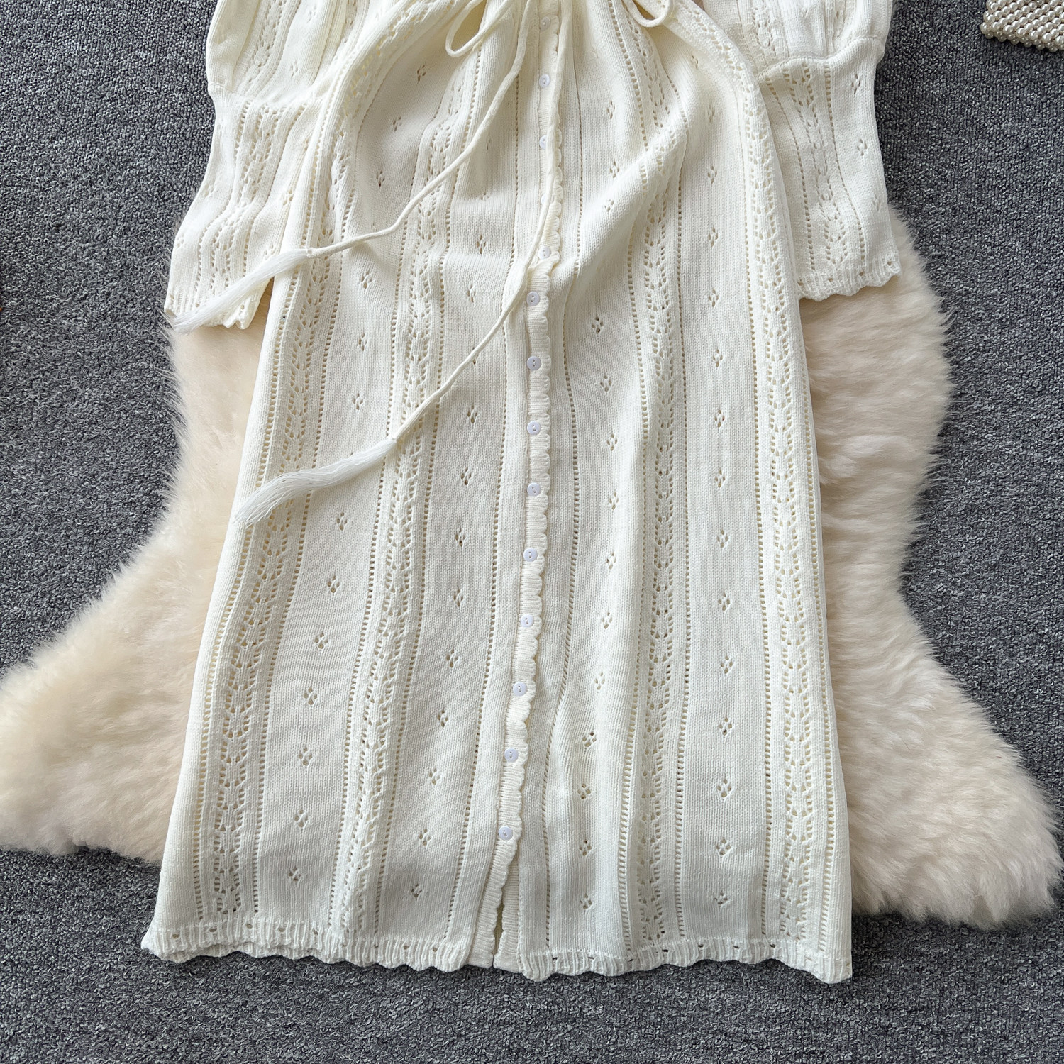 溫柔風ins針織連衣裙女秋冬甜美鏤空鉤花針織燈籠袖綁帶收腰長裙